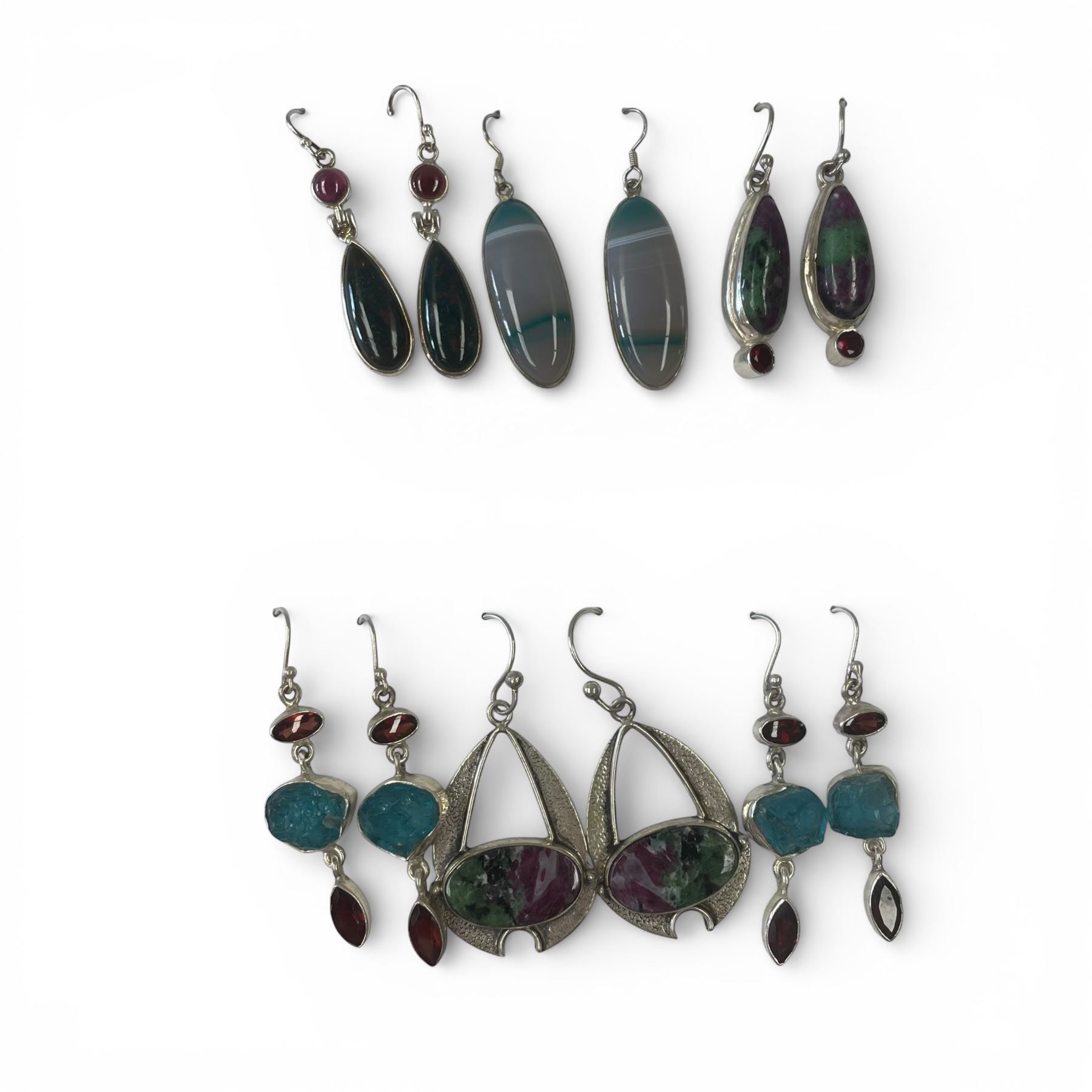 6 Pairs of Polished and Raw Gemstone & Crystal Earrings in Silver Settings (Garnet, Ruby Zoisite, Botswana Agate & More) * Majority are stamped .925 * Longest is 2"