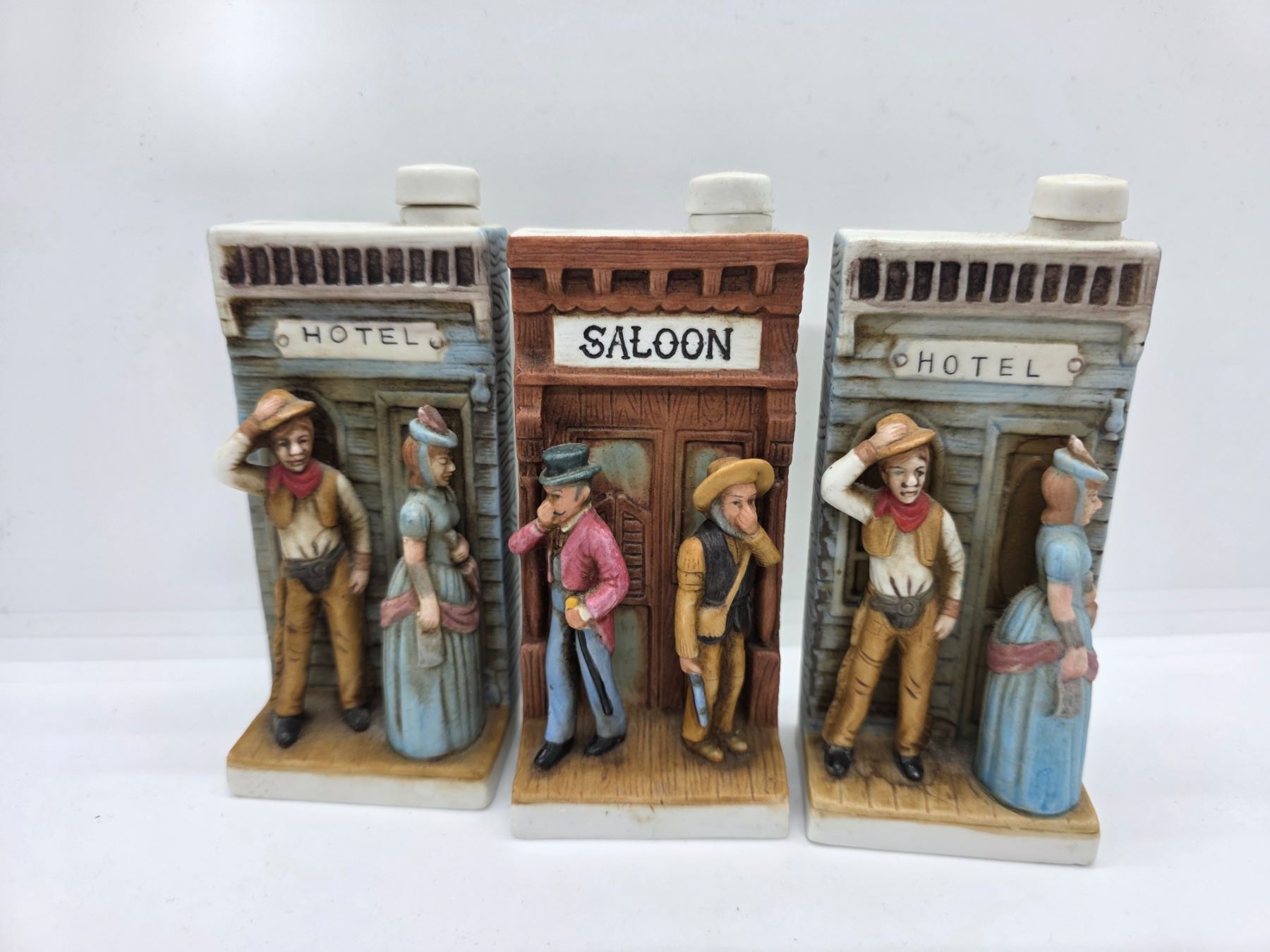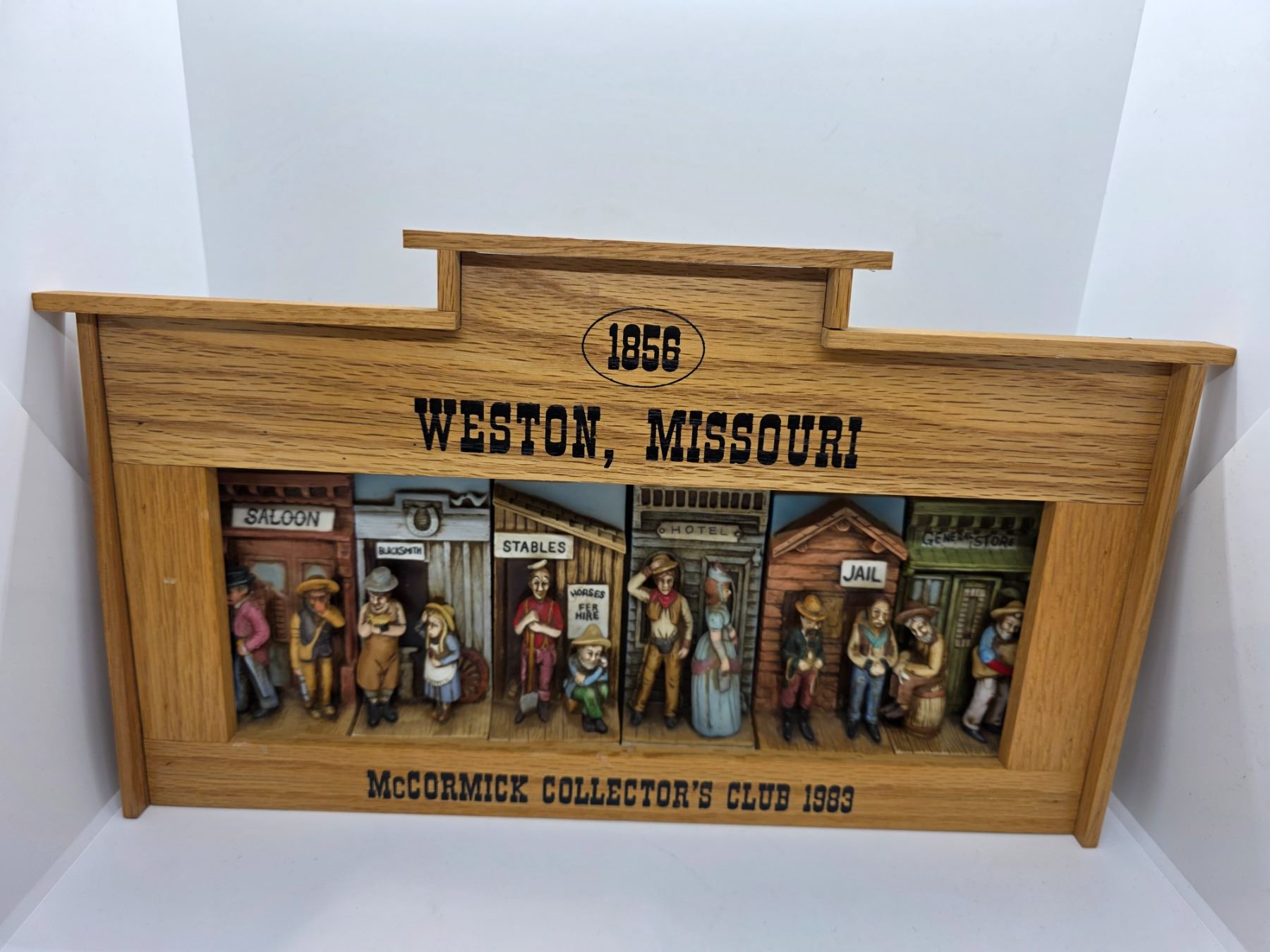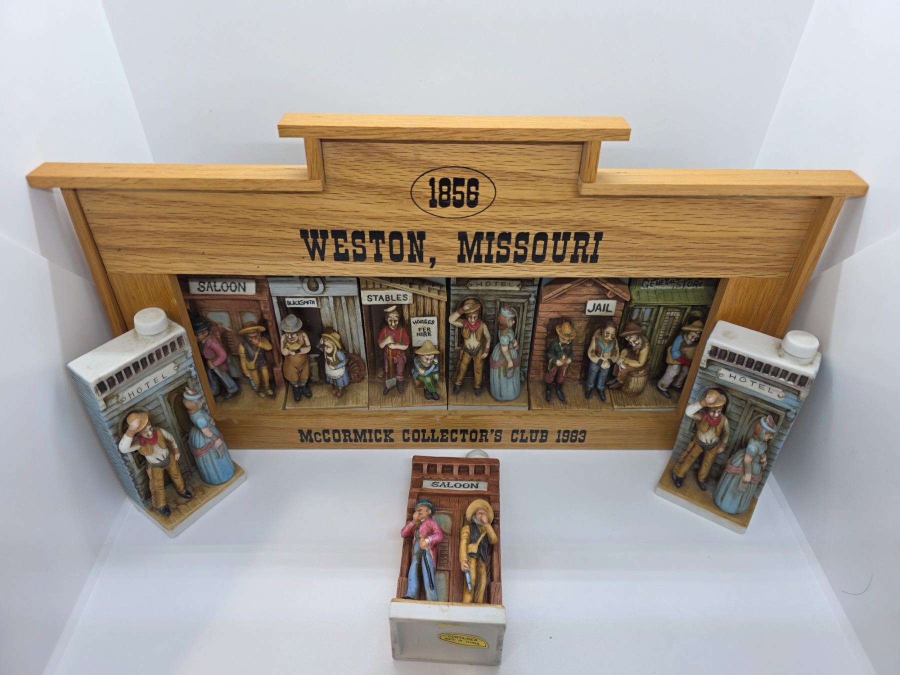 6 Piece Set & 3 Loose McCormick Whiskey Mini Decanters - Set is in it's original wood display (empty bottles)
