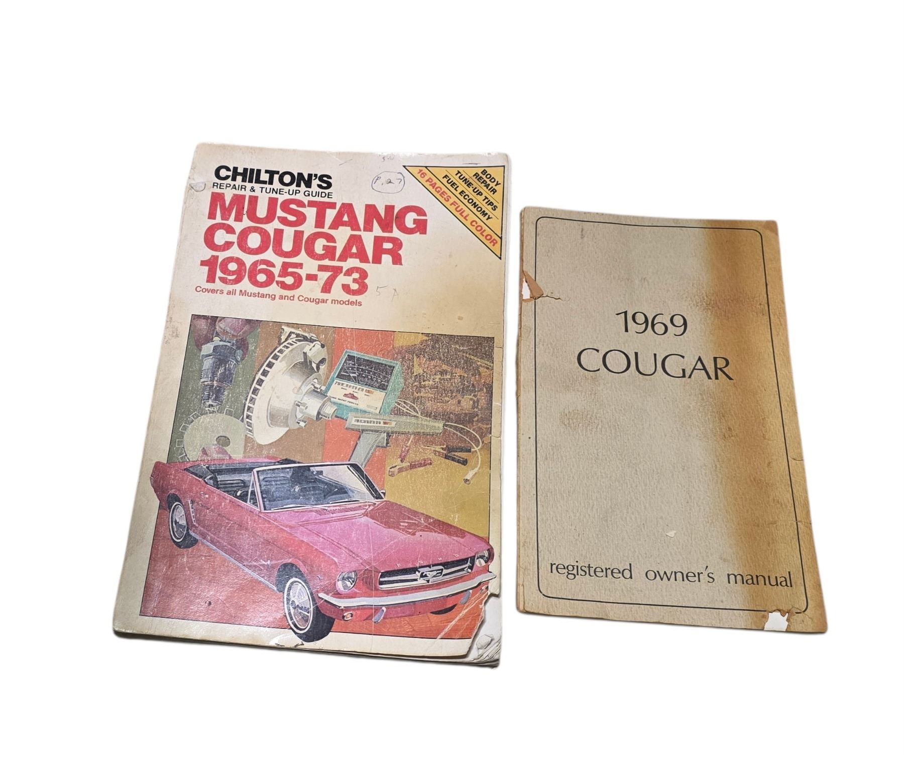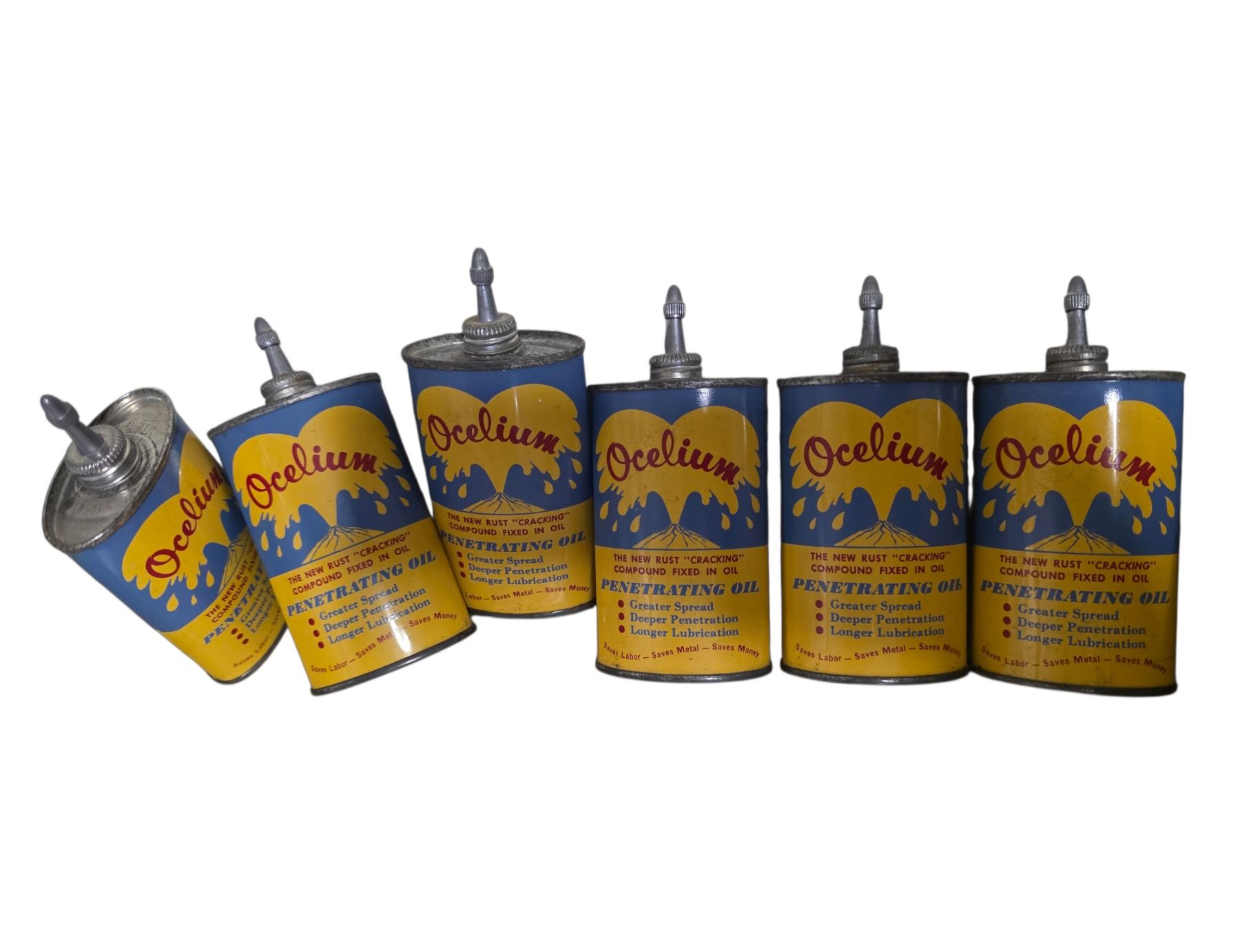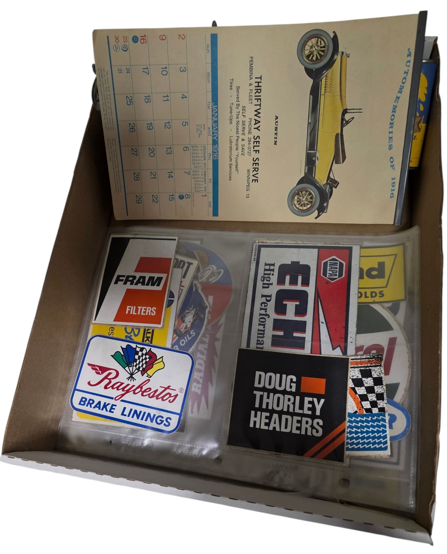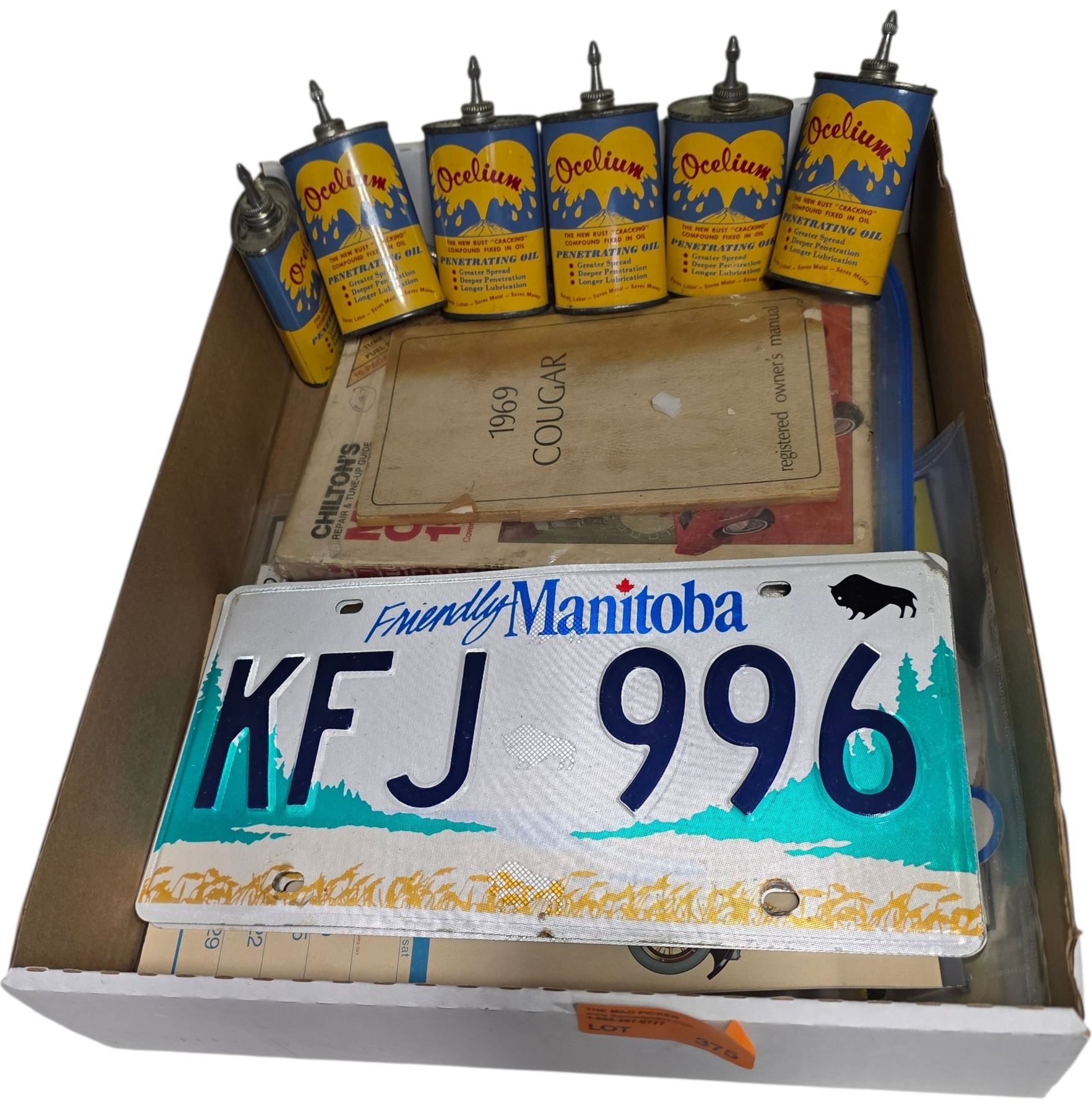 6 Vintage Ocelium Oil Cans, 1969 Cougar Owner’s Manual, Stickers, Manitoba Plates, 1916 Austin Calendar, and More