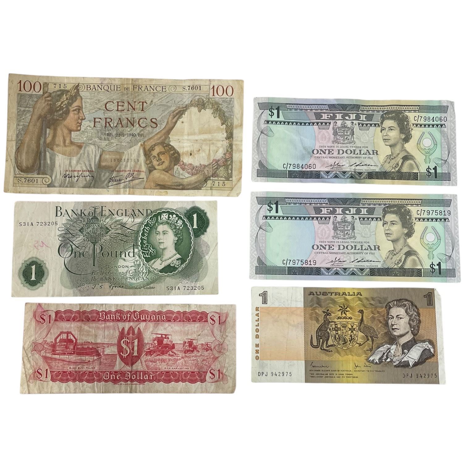 6 World Currency Banknotes * 1940 French 100 Francs, British C Series 1 Pound, 2 x Fiji $1, Australia $1, Guyana $1