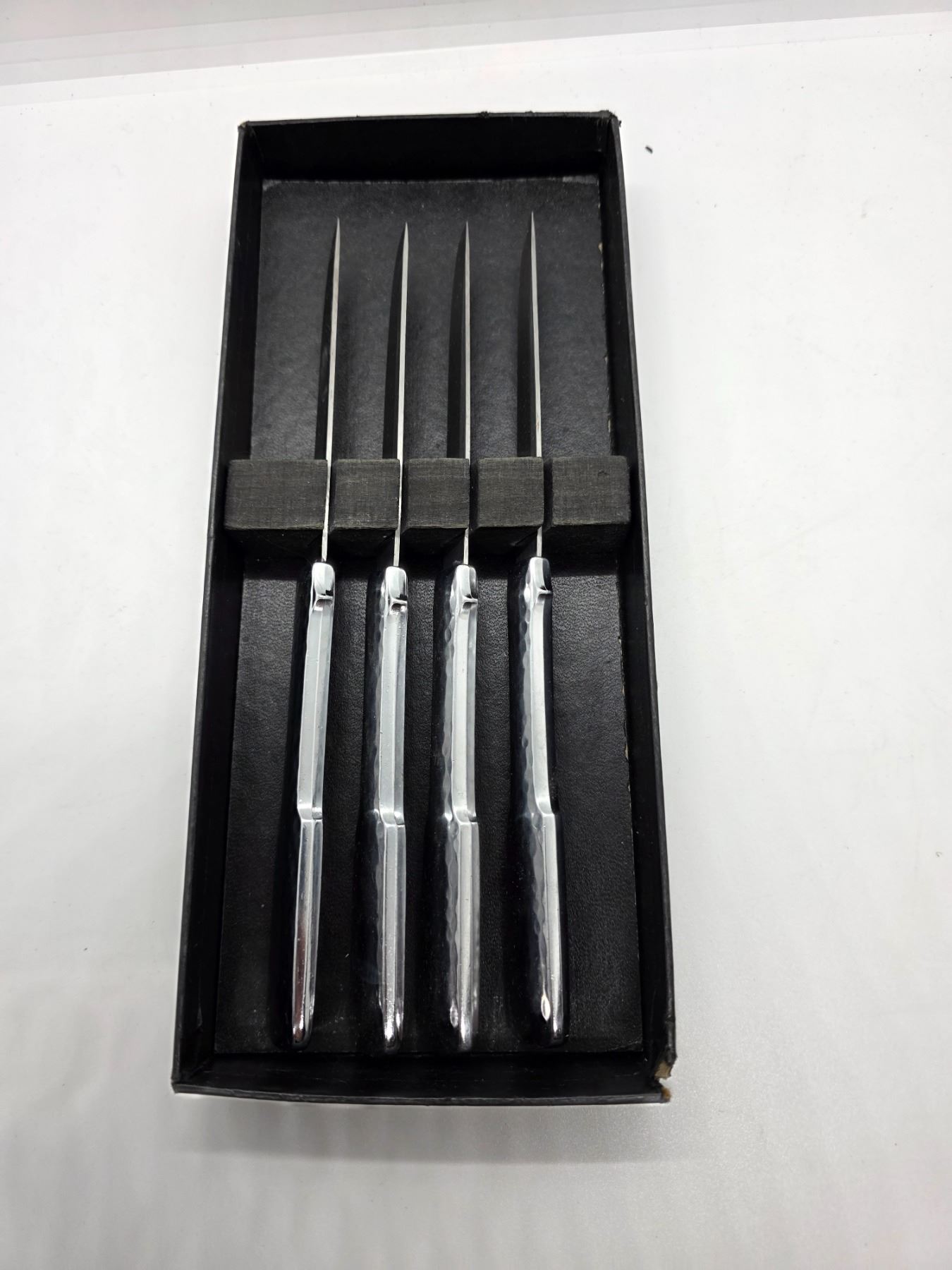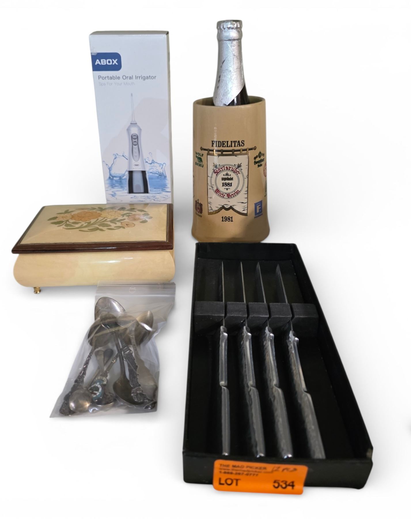 64 Grams of Sterling Spoons (some enamel), Set of Steak Knives, Musical Jewel Box, Oral Irrigator & More