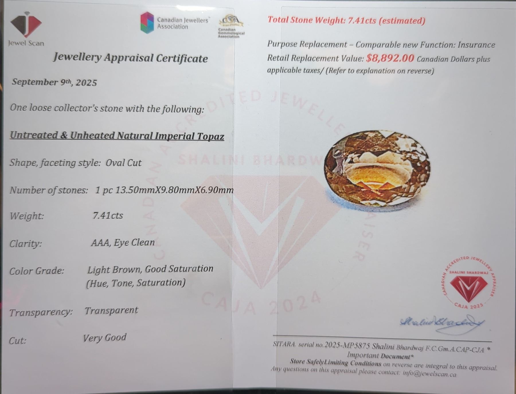 7.41 ct Authenticated Imperial Topaz gemstone ($8,892 Appraisal)