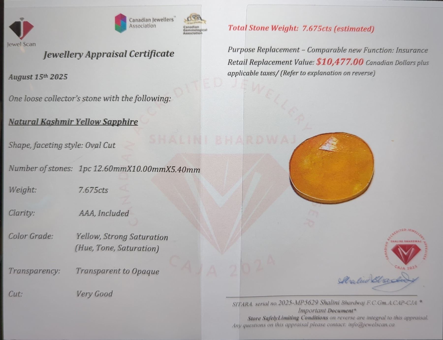 7.68 ct Certified Yellow Sapphire gemstone ($10,477 Appraisal)