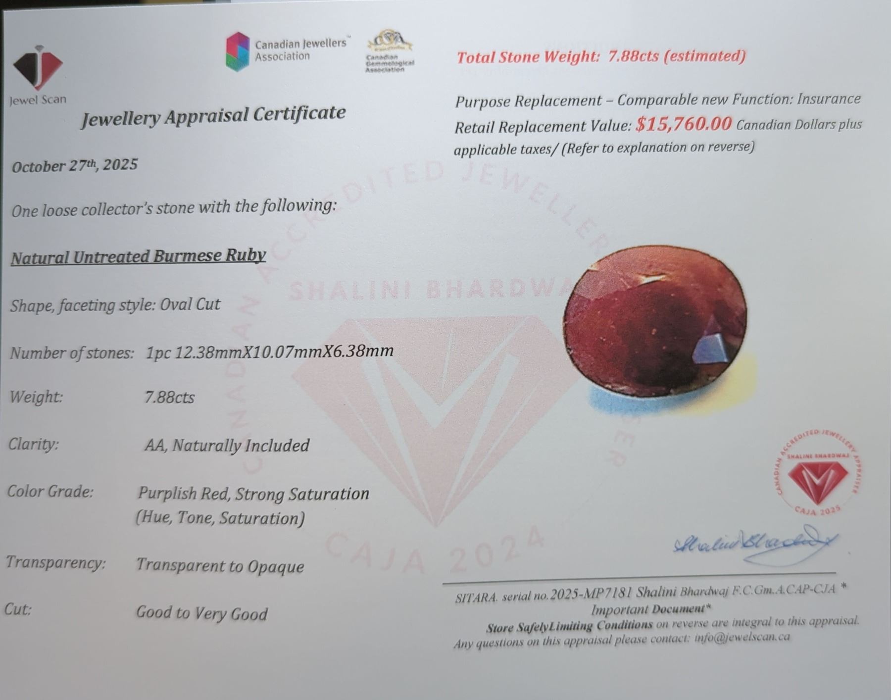 7.88 ct Certified Untreated Ruby gemstone ($15,760 Appraisal)
