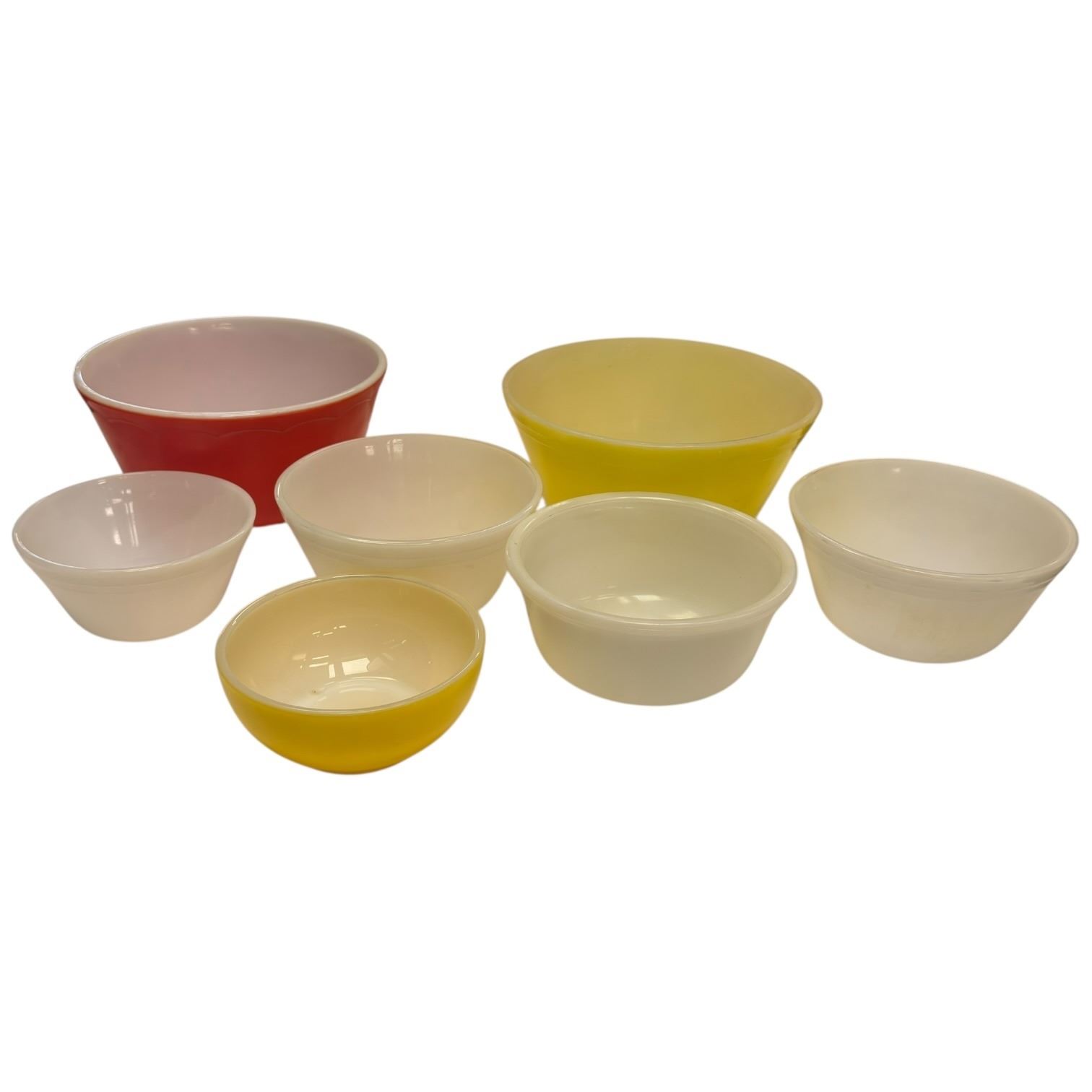 Lot of assorted vintage mixing bowls from JAJ, Fire King and Hazel Atlas. Includes various styles and sizes. Known for their durable and collectible glassware. Item is as pictured. No chips