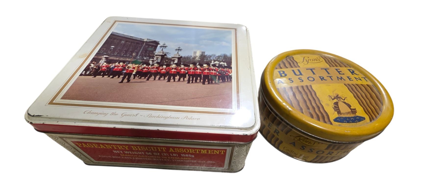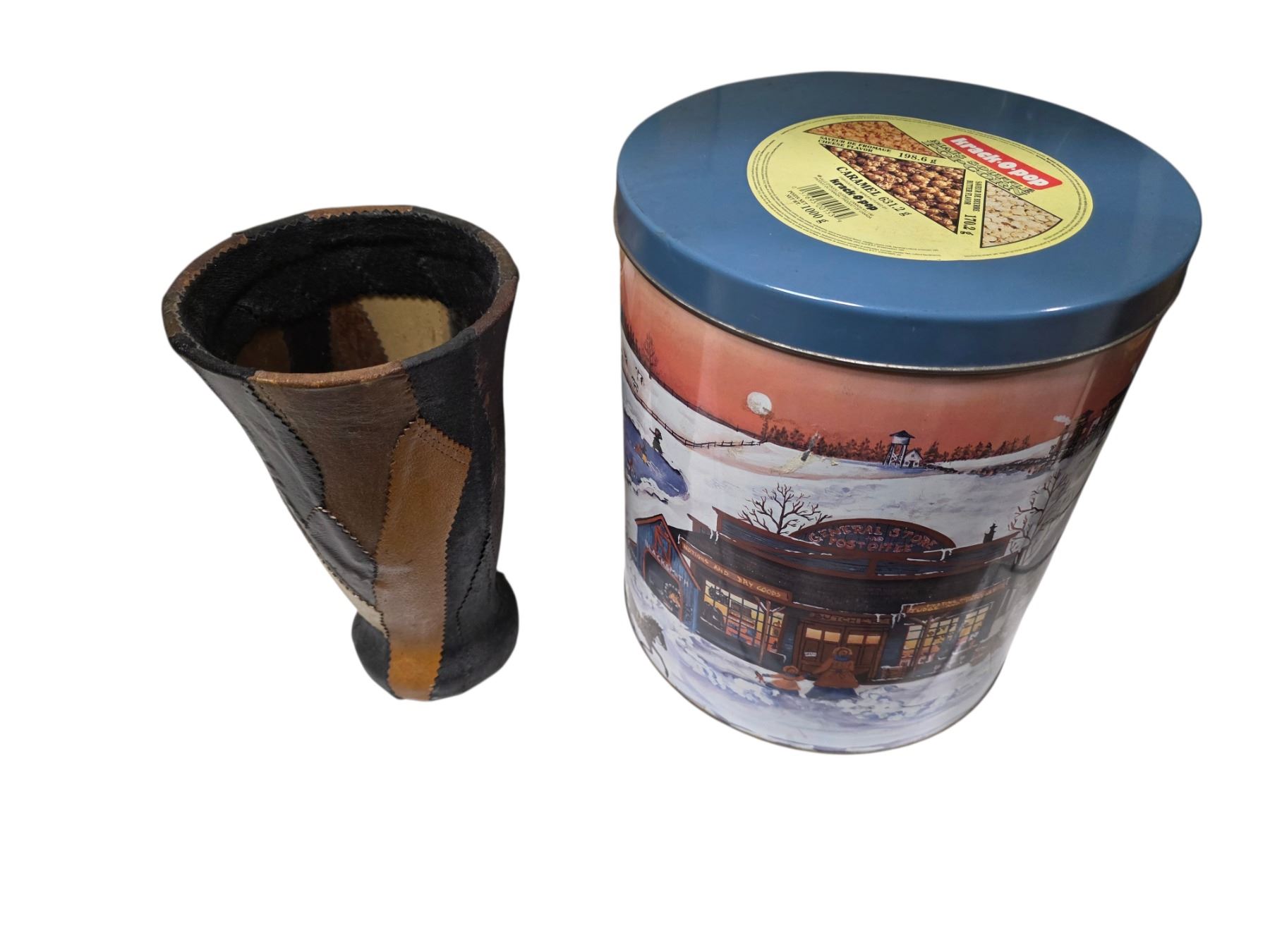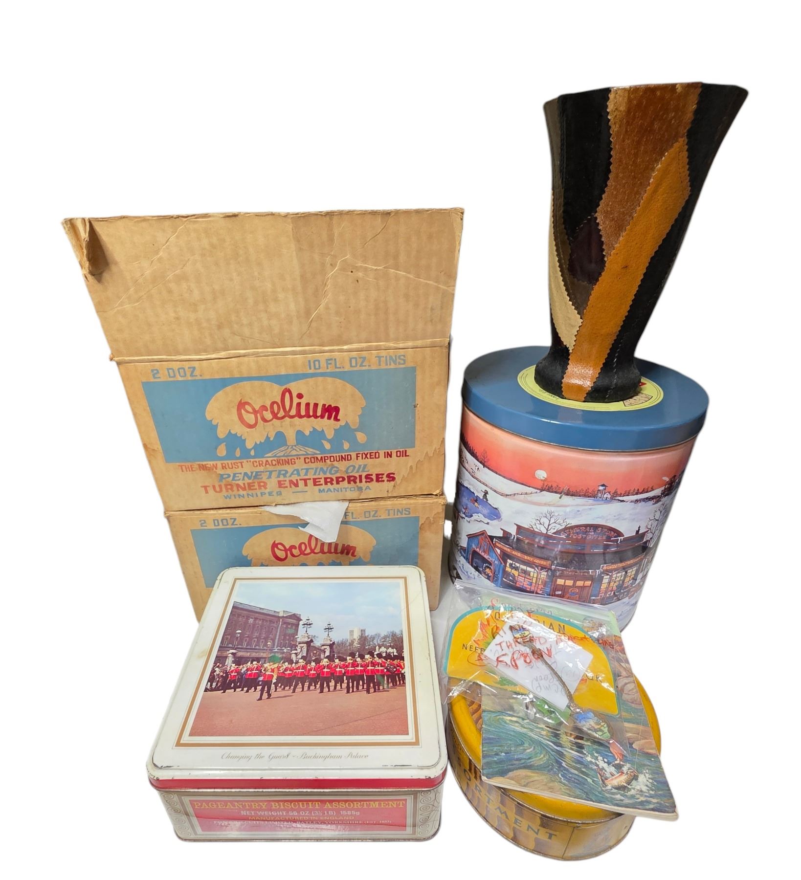 7 Assorted Vintage Tins & Collectibles - Leather Patchwork Vase, Biscuit & Holiday Tins, Souvenir Spoons, and More