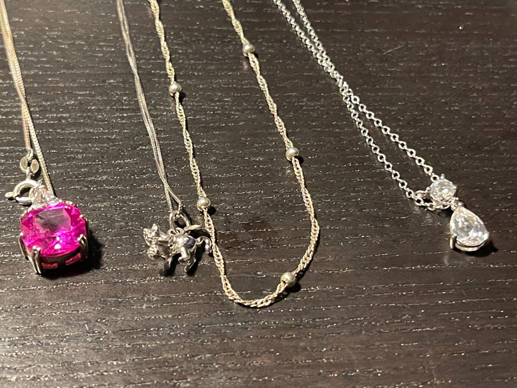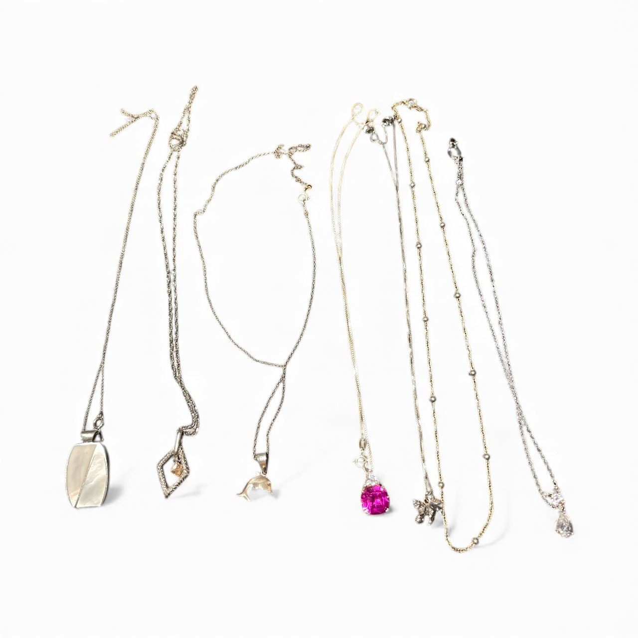 7 Sterling Silver Necklaces - Variety of pendant materials - Total weight including gems & enamel: 31.\ grams