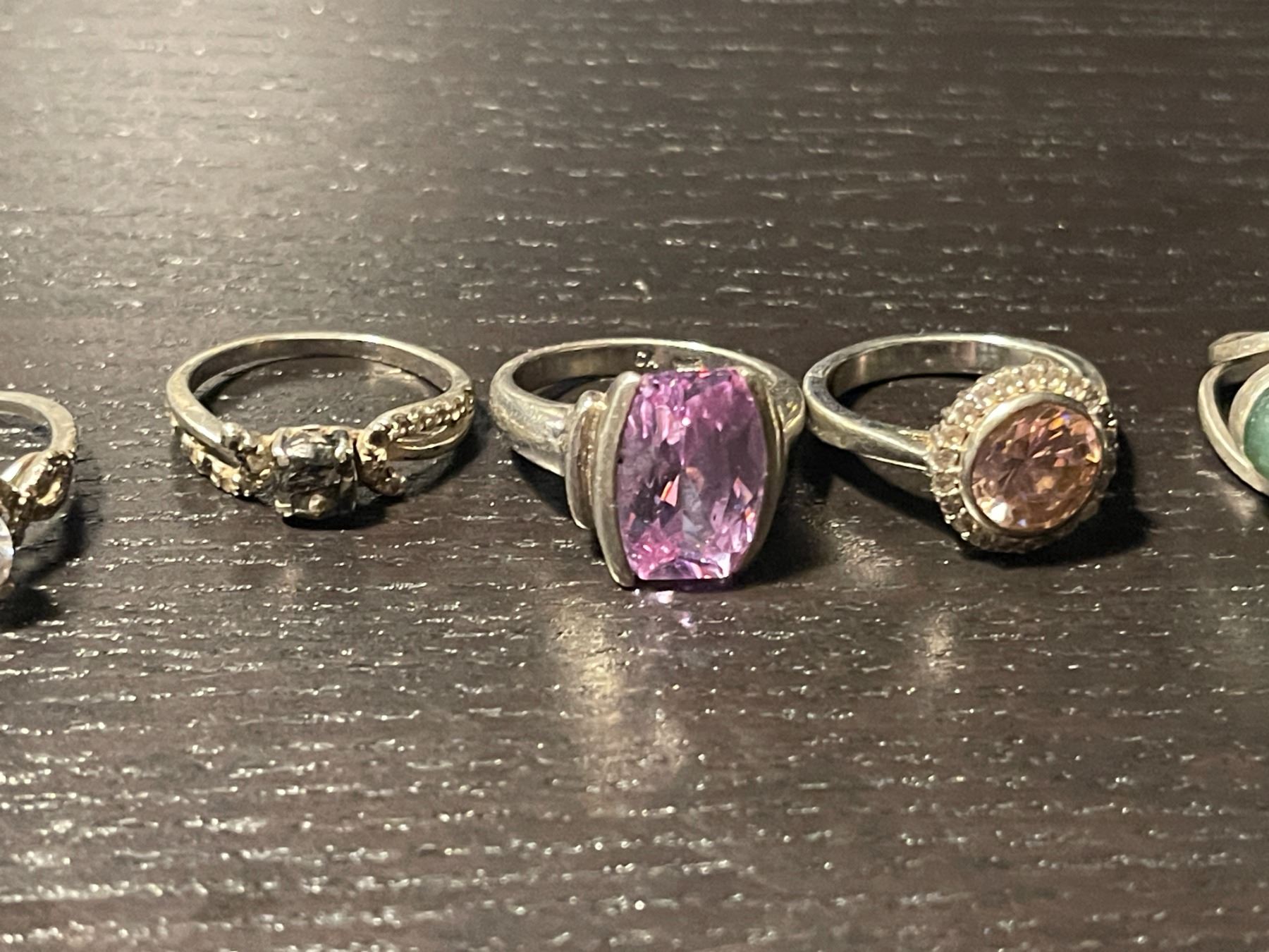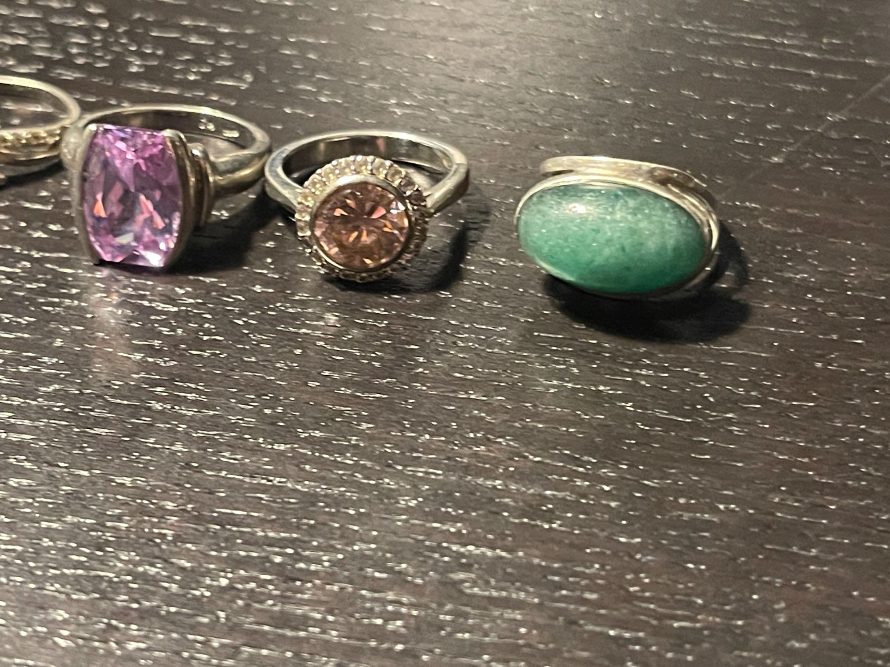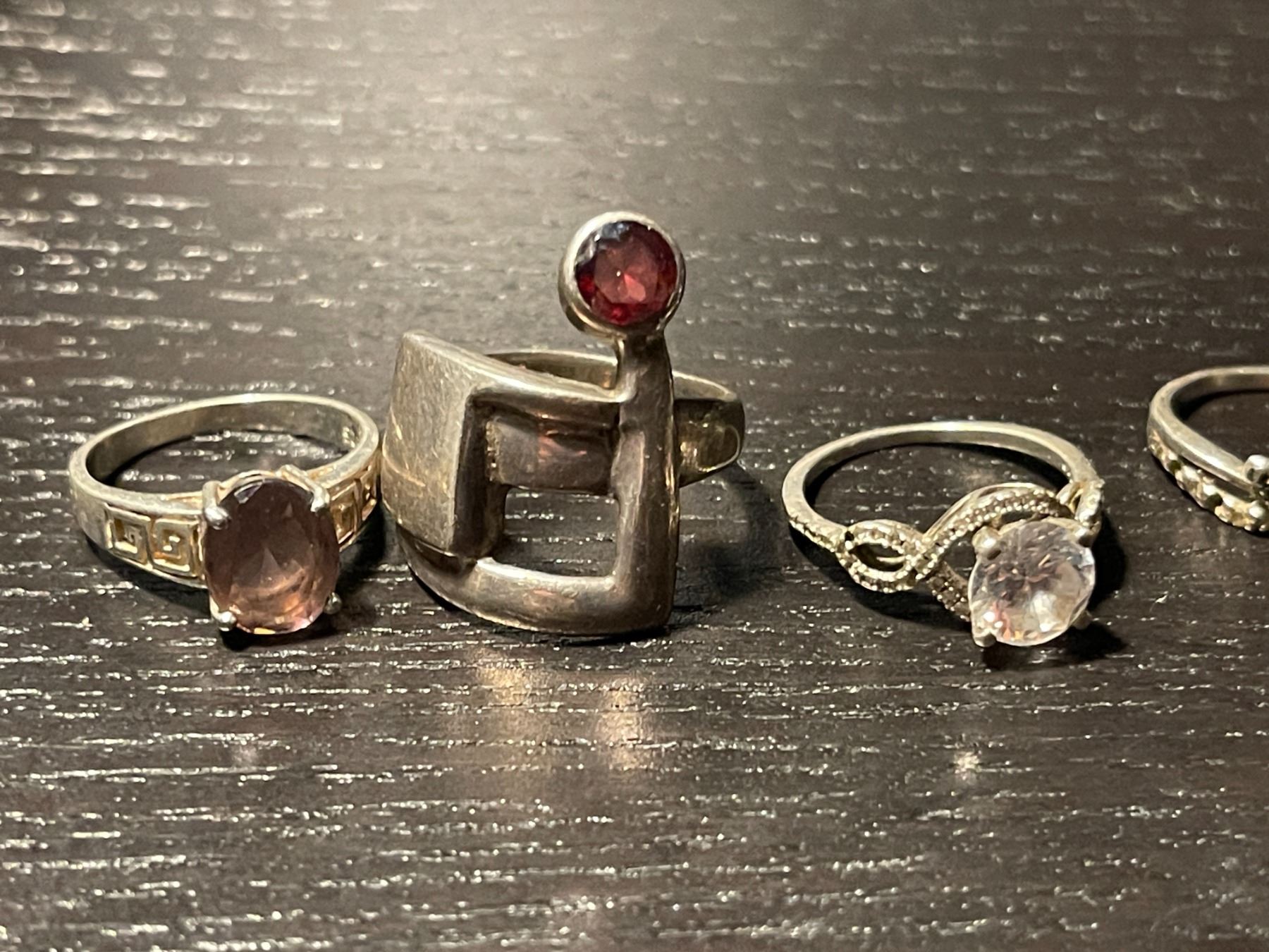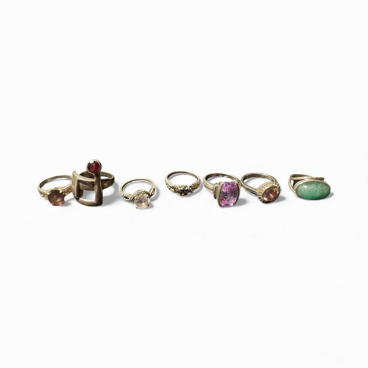 7 Sterling Silver Rings with Gemstones - Amethyst, Crystal, Jade and Garnet - Total weight: 37 grams