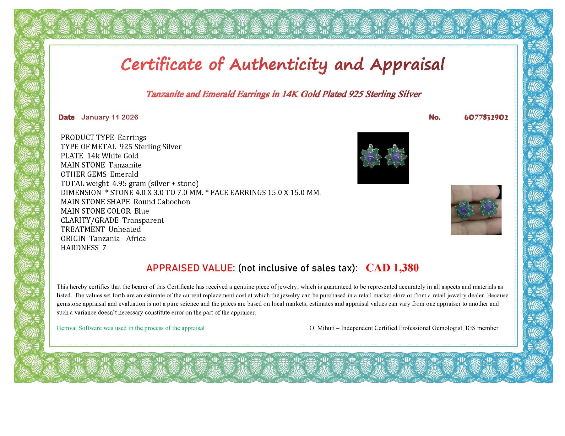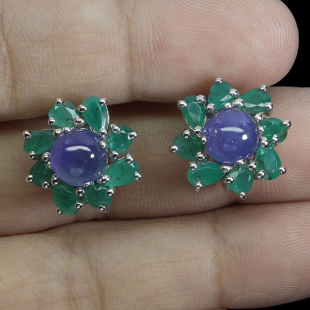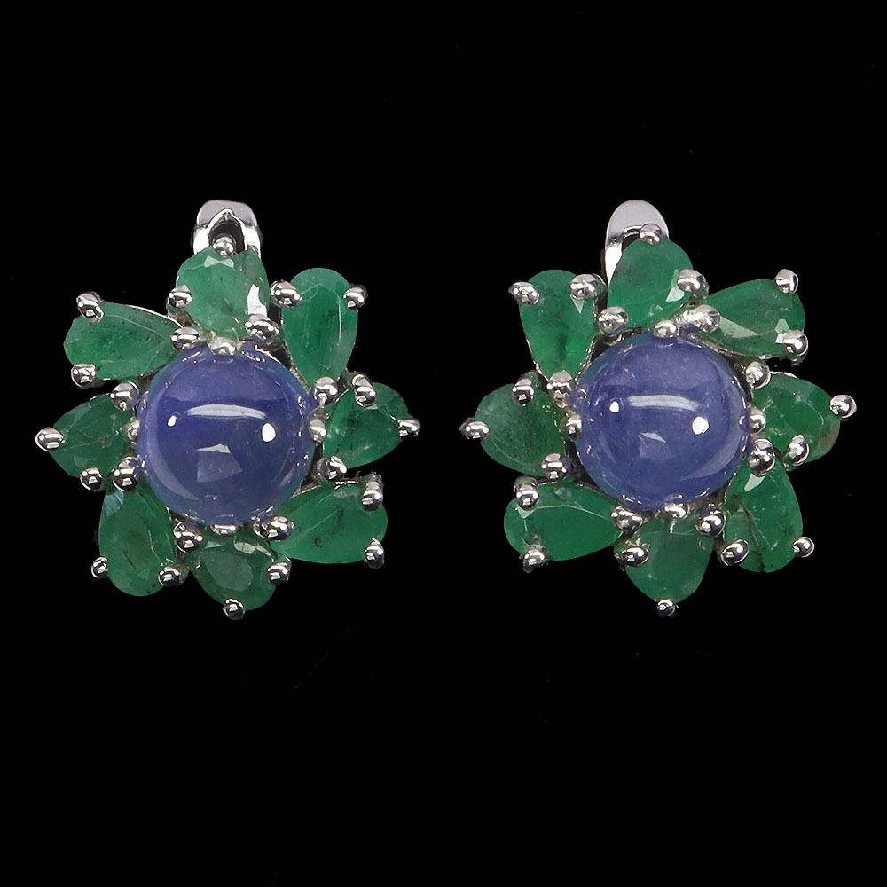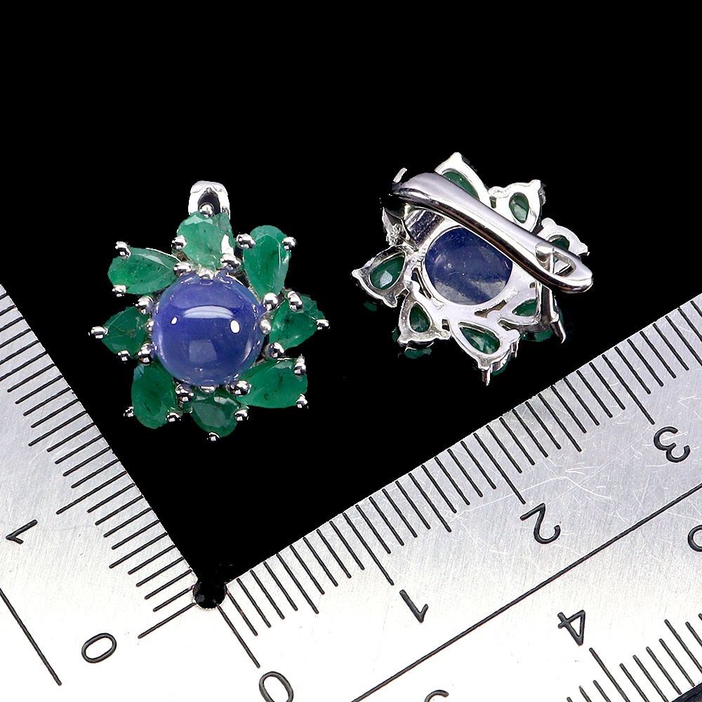 7 mm OVAL BLUE SAPPHIRE AND EMERALD EARRINGS IN 14K WHITE GOLD PLATED OVER 925 STERLING SILVER - APPRAISED REPLACEMENT VALUE CAD 1,380