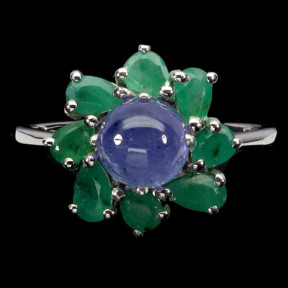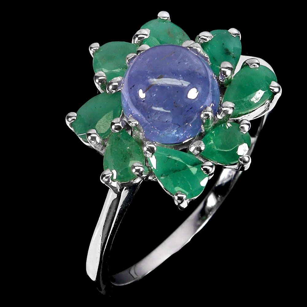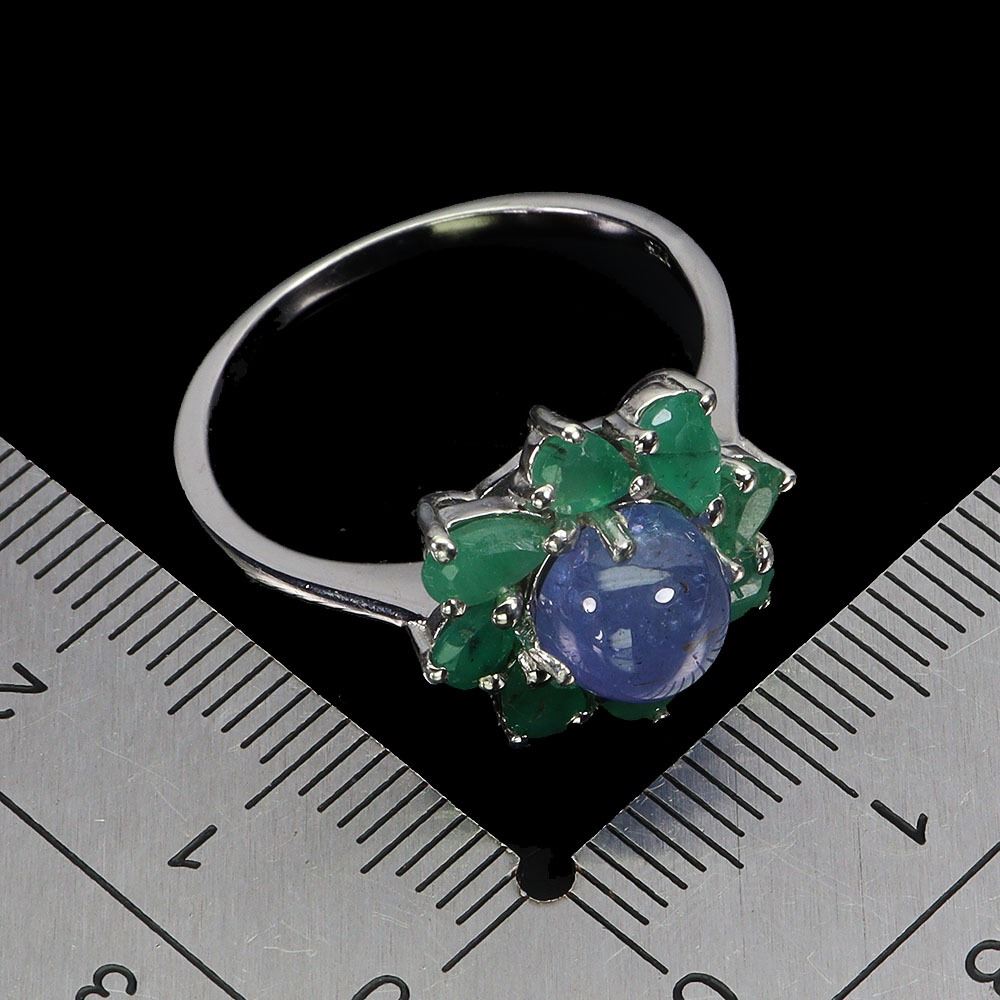 7 mm ROUND TANZANITE AND EMERALD RING IN 14K WHITE GOLD PLATED OVER 925 STERLING SILVER - SIZE 9 - APPRAISED REPLACEMENT VALUE CAD 940