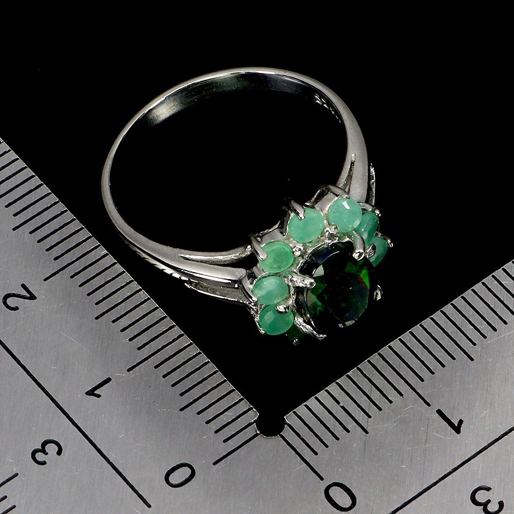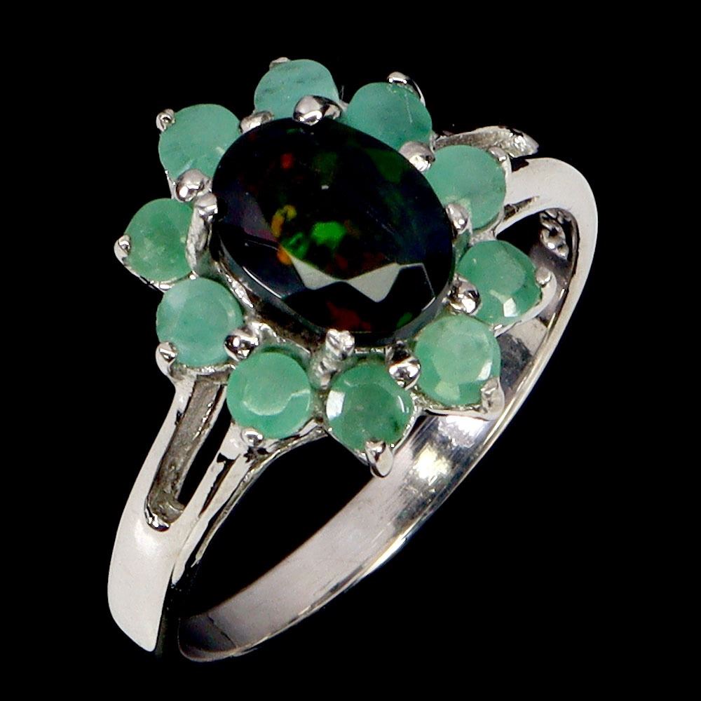 7X5 mm BLACK OPAL AND EMERALD FLOWER RING IN 14K WHITE GOLD PLATED OVER 925 STERLING SILVER - SIZE 8 - APPRAISED REPLACEMENT VALUE CAD 875