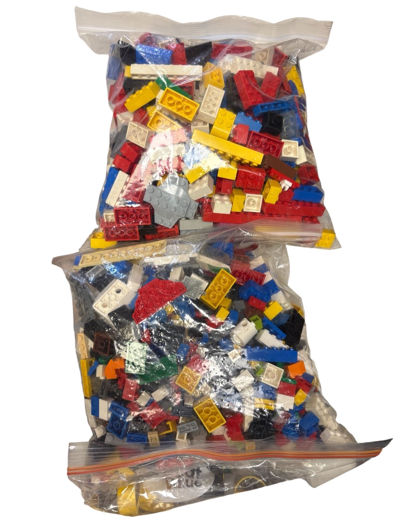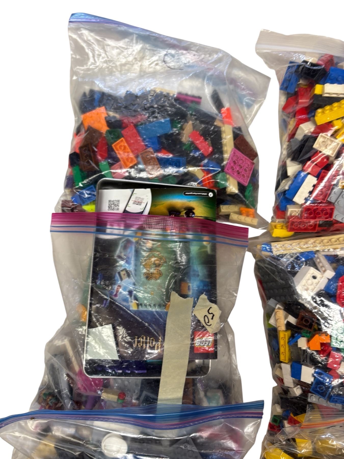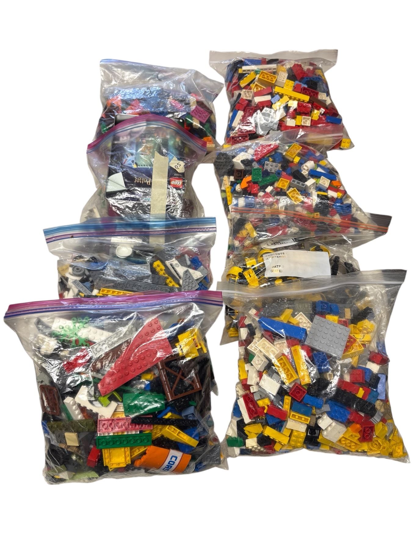 Lot of 8 bags containing a mix of assorted LEGO pieces. Includes various shapes, sizes, and colors. Pieces may include bricks, plates, wheels, and specialty parts. No specific sets or instructions included. Ideal for building and creative projects.