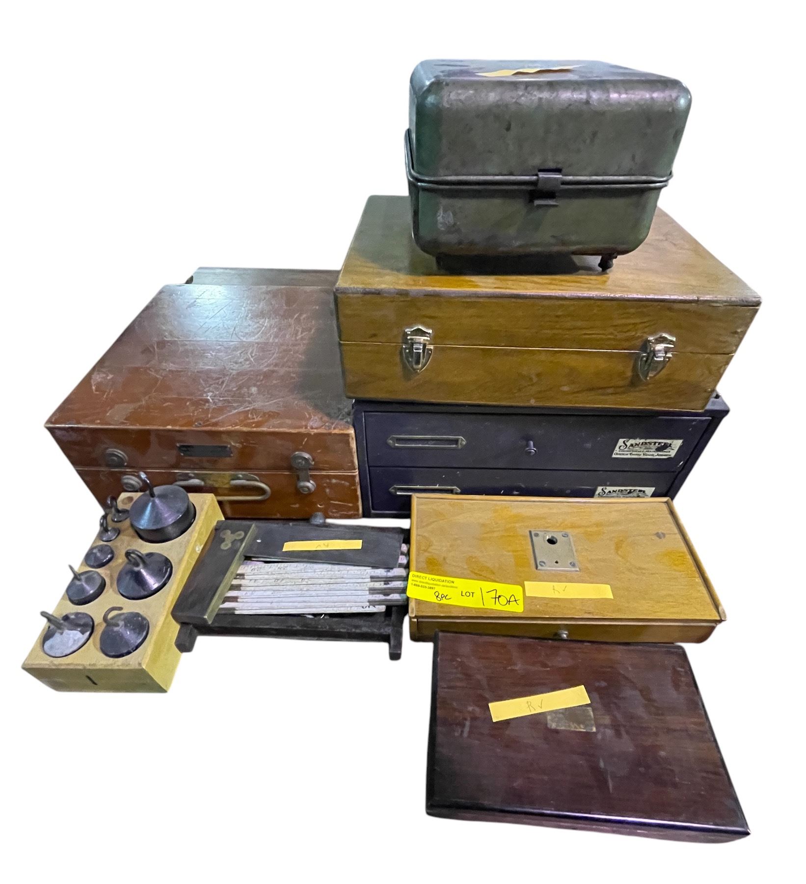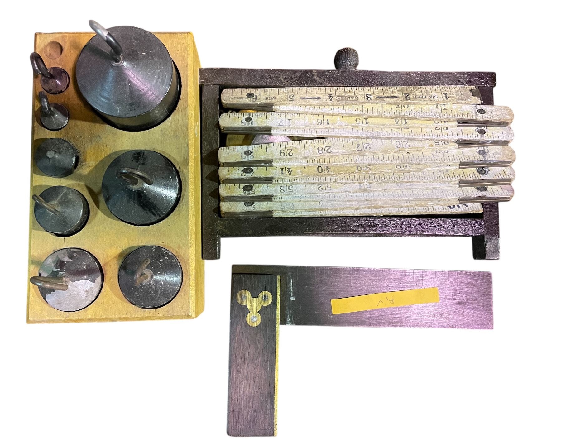 8 Pces of Vintage Collectables - Desk Organizer, Measuring Tools, Scale Weights, Etc.