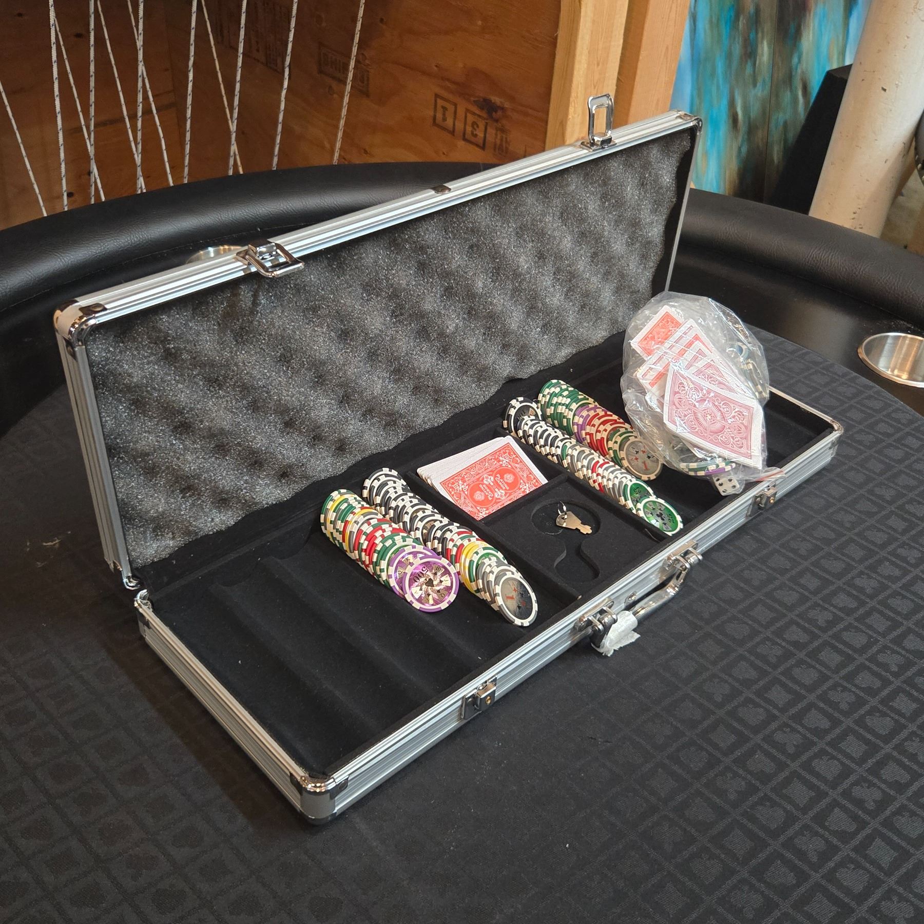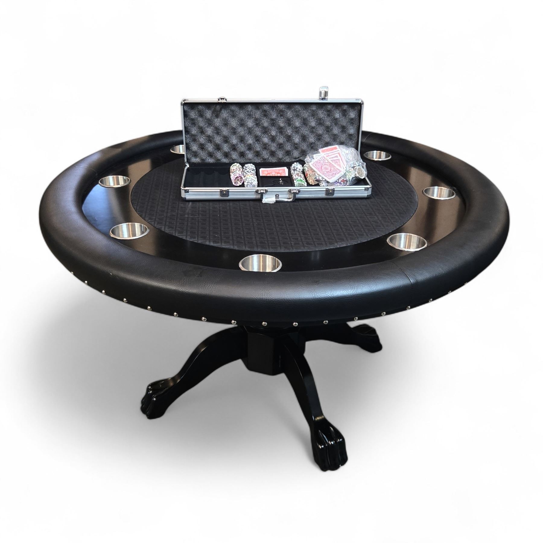 8 Person Poker Table w/ Black Leather Rail, Stainless Cup Holders & Poker Chipps / Cards - 54x32"