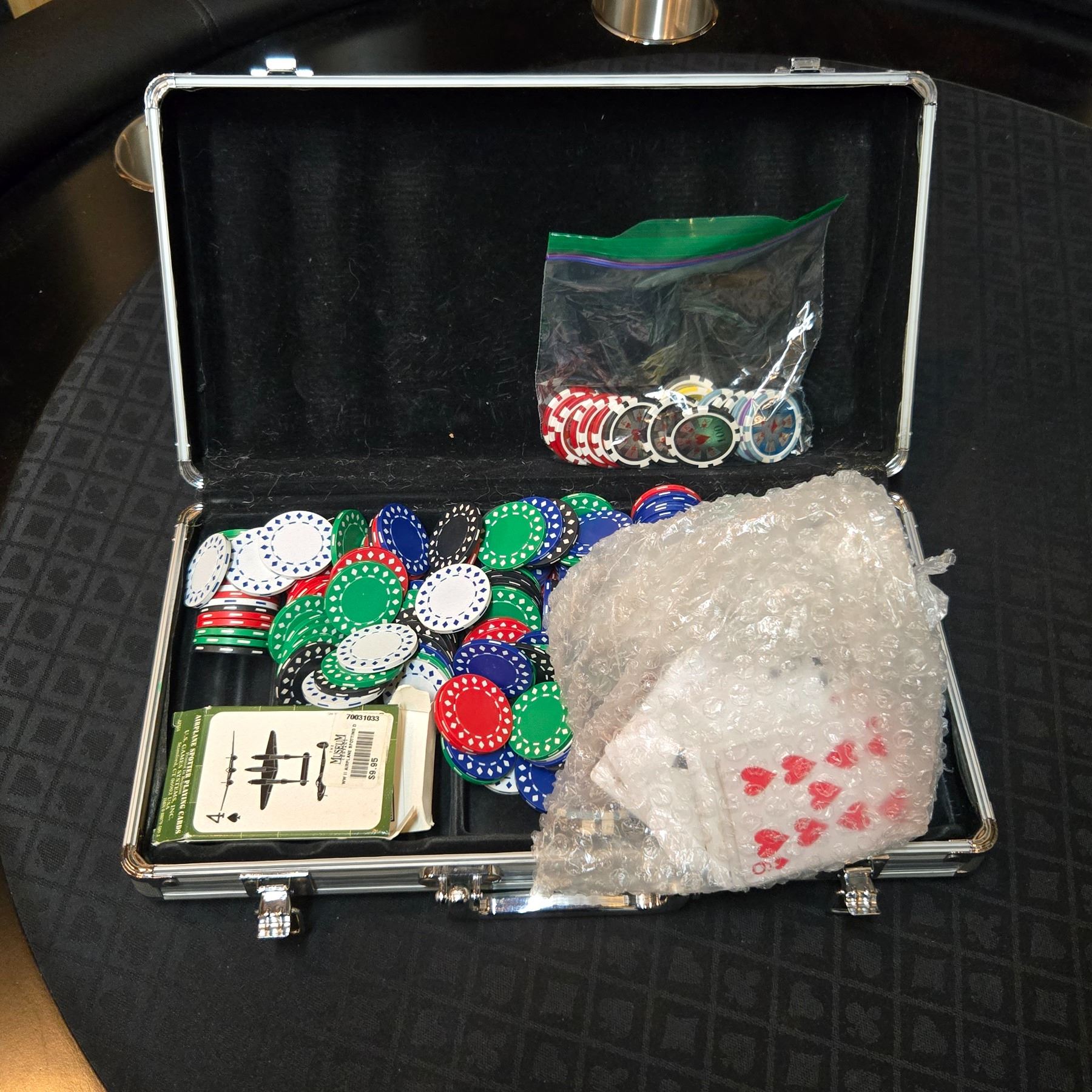 8 Person Poker Table w/ Black Leather Rail, Stainless Cup Holders & Poker Chipps / Cards - 54x32"