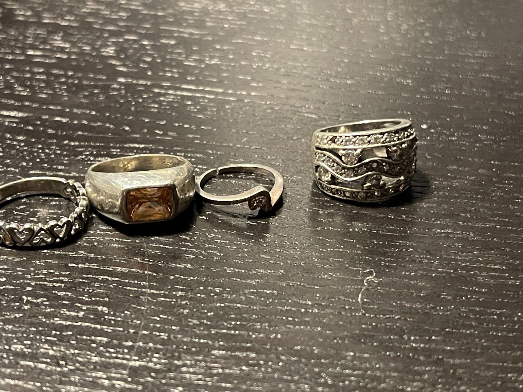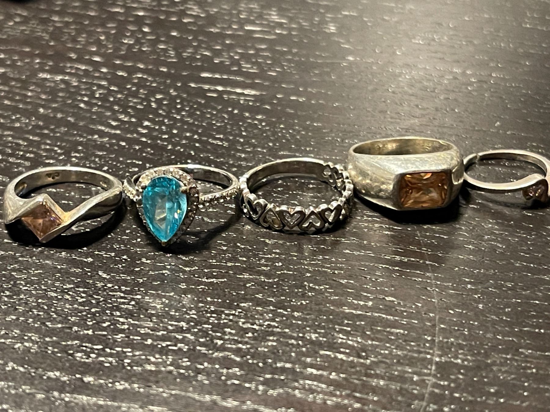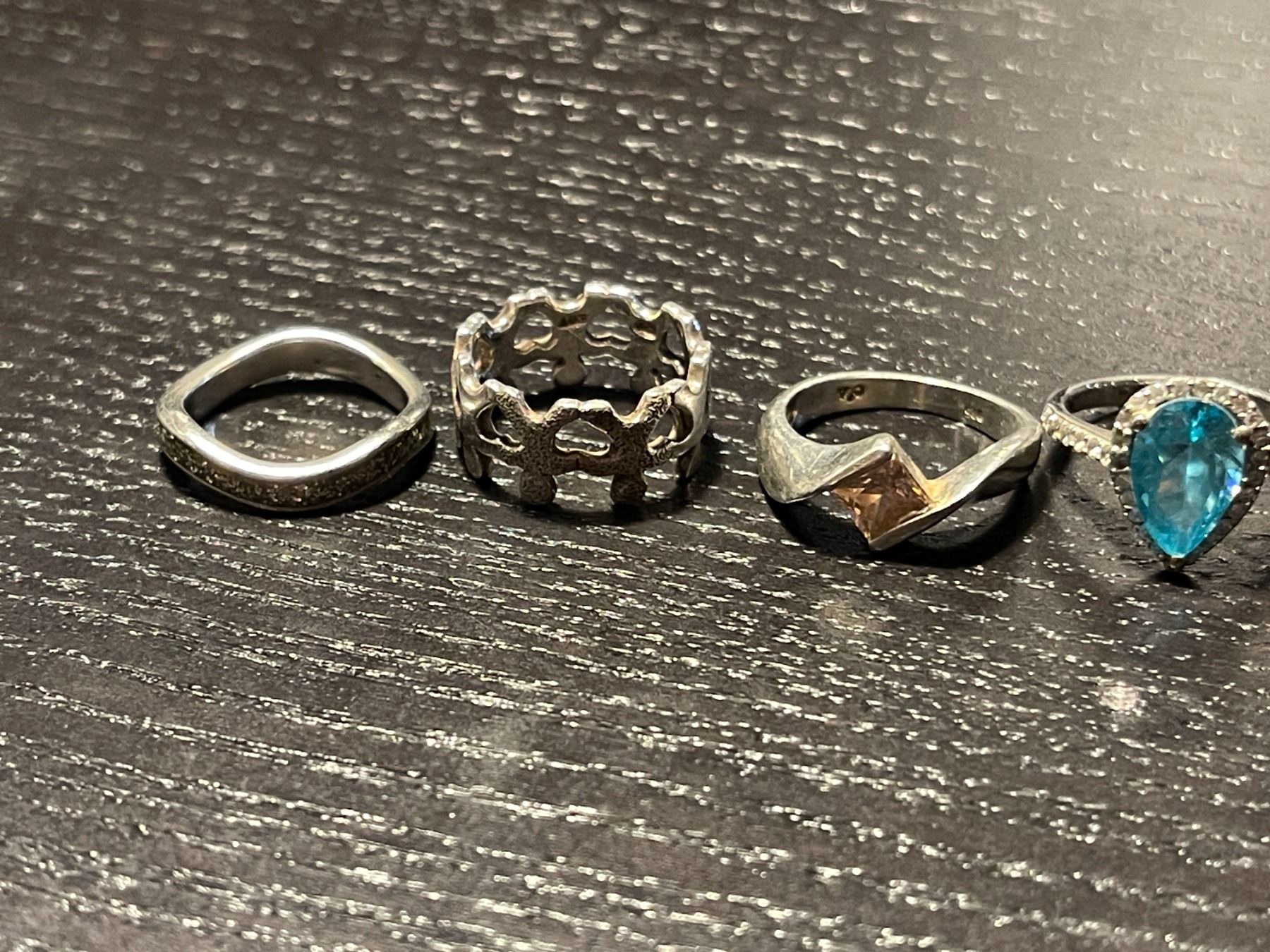 8 Sterling Silver Size 4, 5 and 6 Rings - Variety of designs - Total weight including gems: 27.5 grams