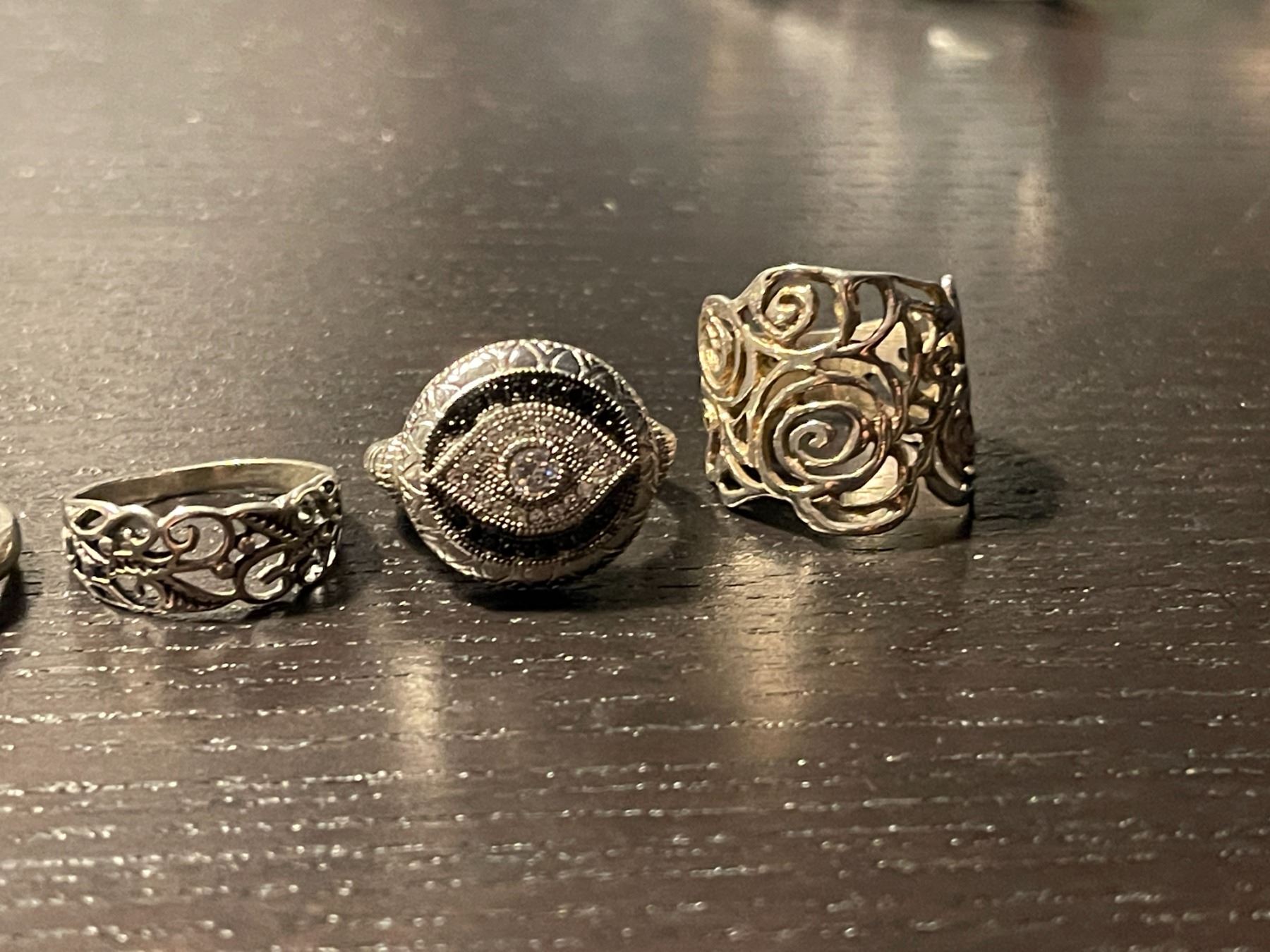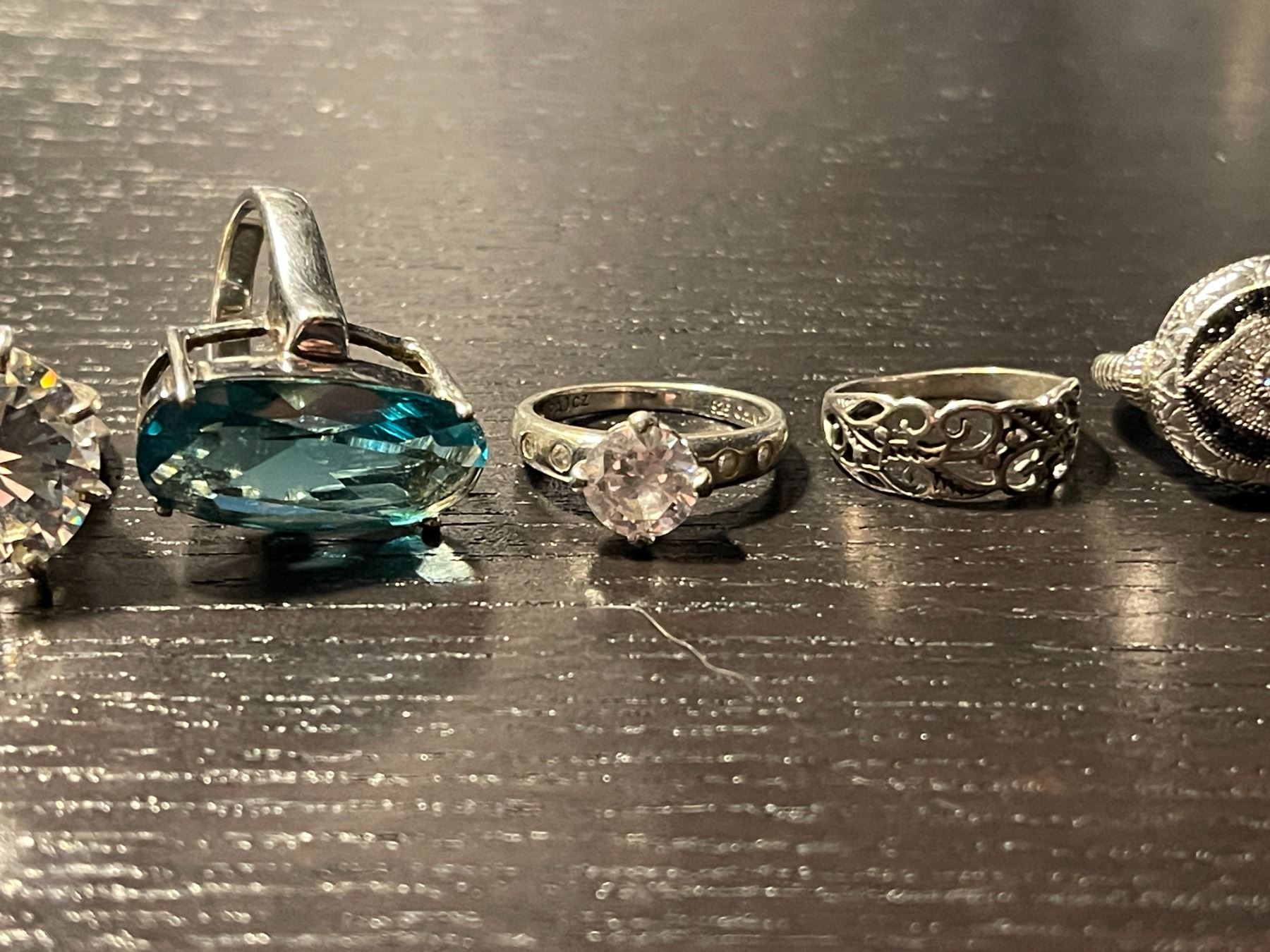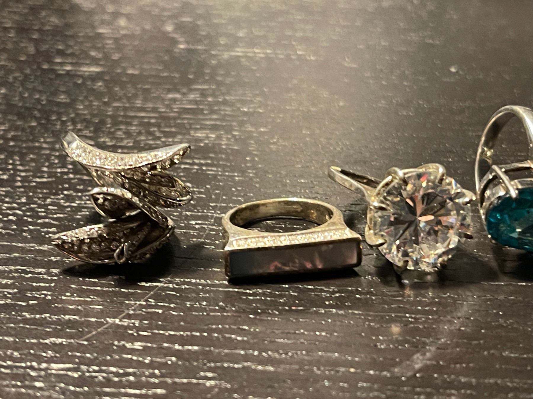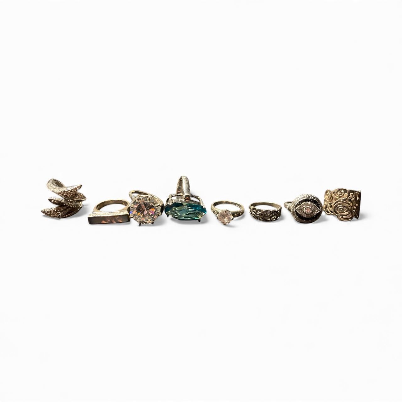 8 Sterling Silver Size 7 Rings - Variety of designs - Total weight including gems: 45 grams
