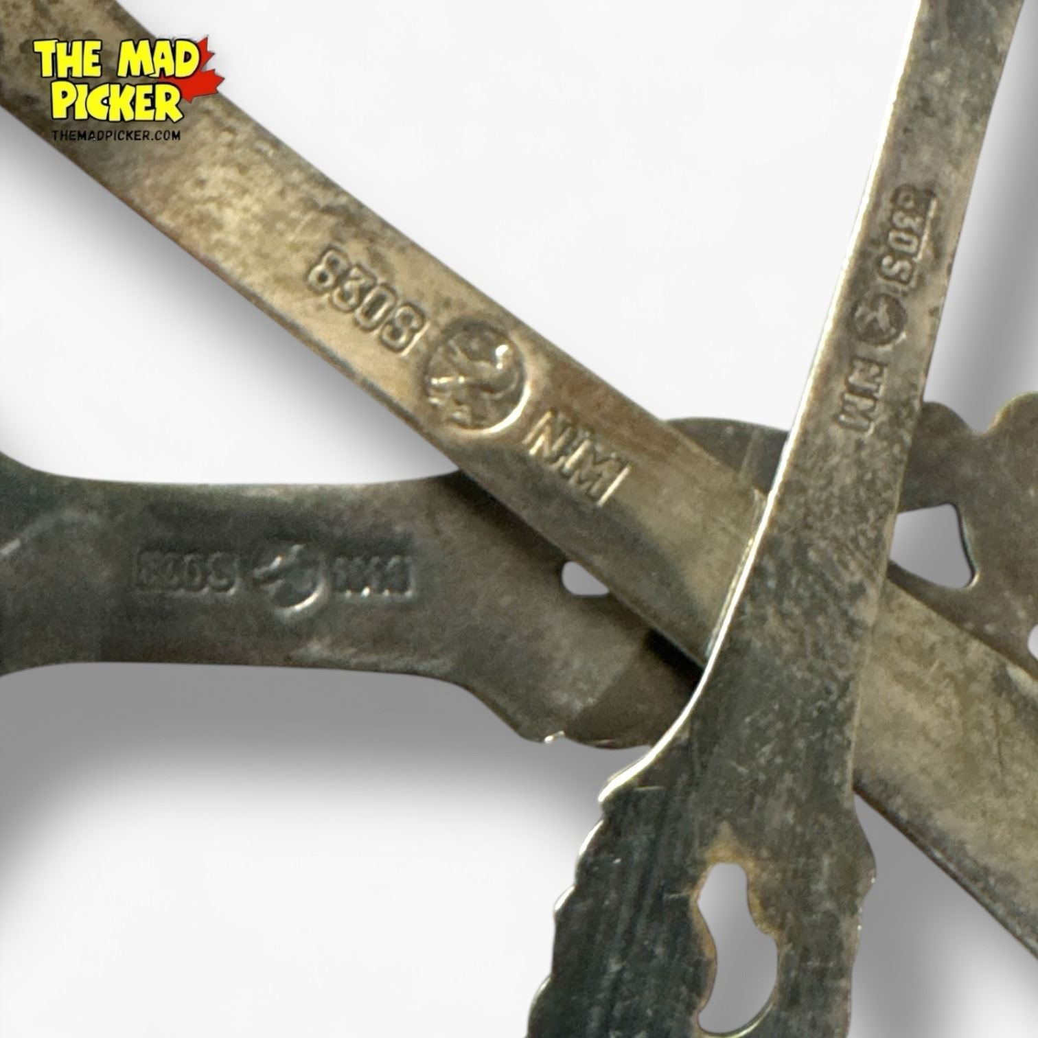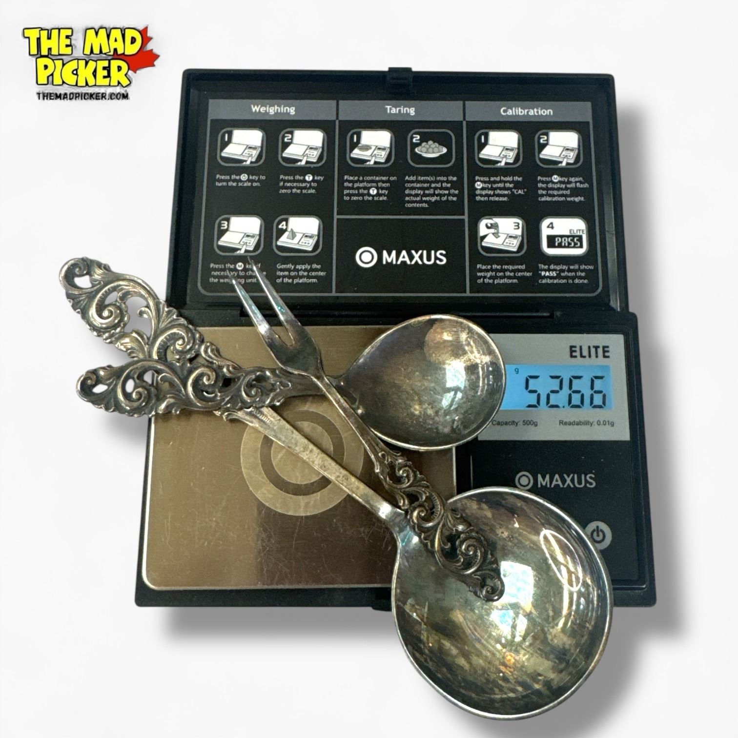 .830 Silver Vintage Brodrene Mylius Norway Tele Pattern Cocktail Fork, Sugar Shell & 6.5" Condiment Spoon - Total Weight: 52.6 grams