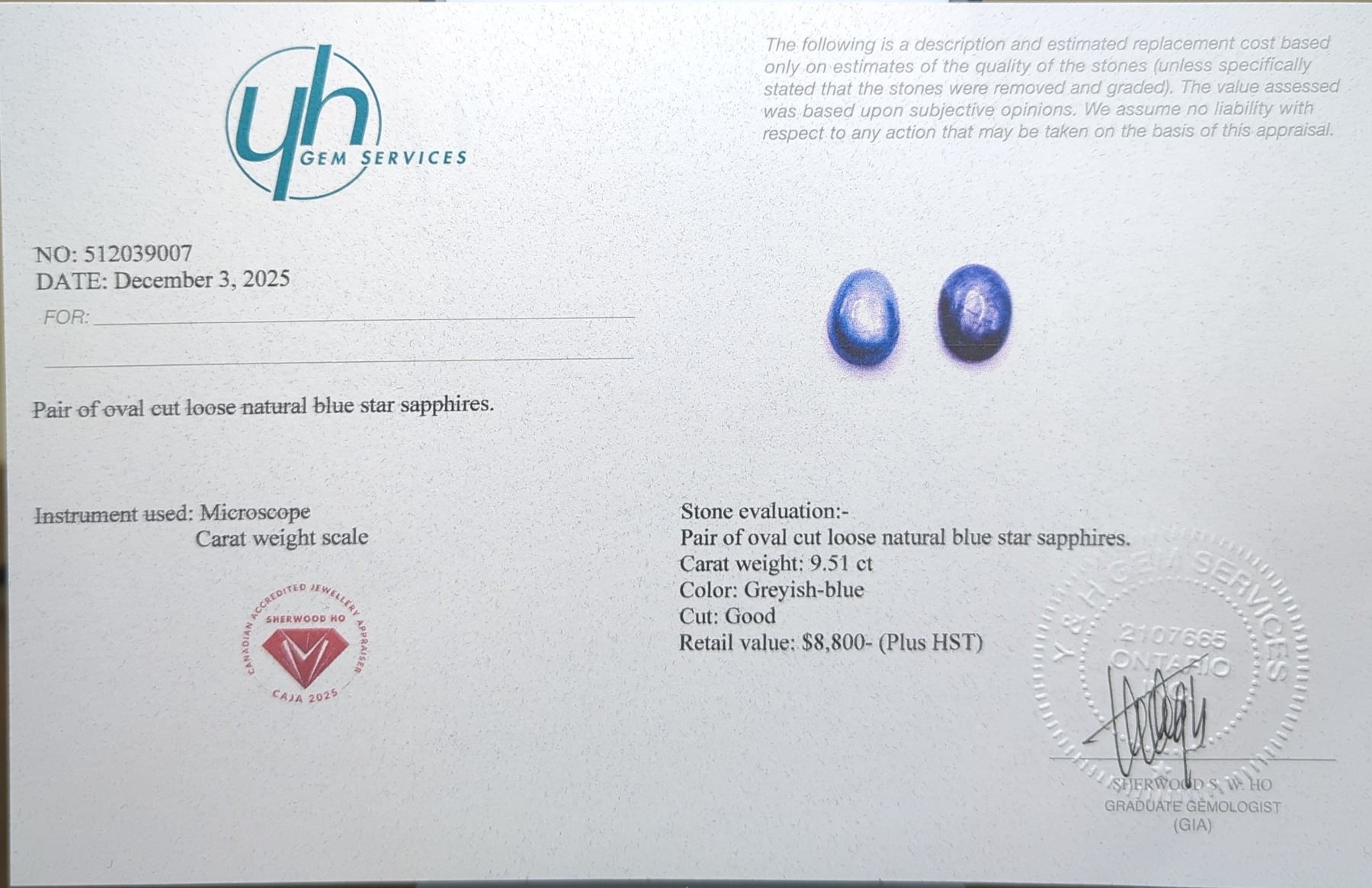 9.51 ct Certified Blue Star Sapphire gemstone Pair ($8,800 Appraisal)