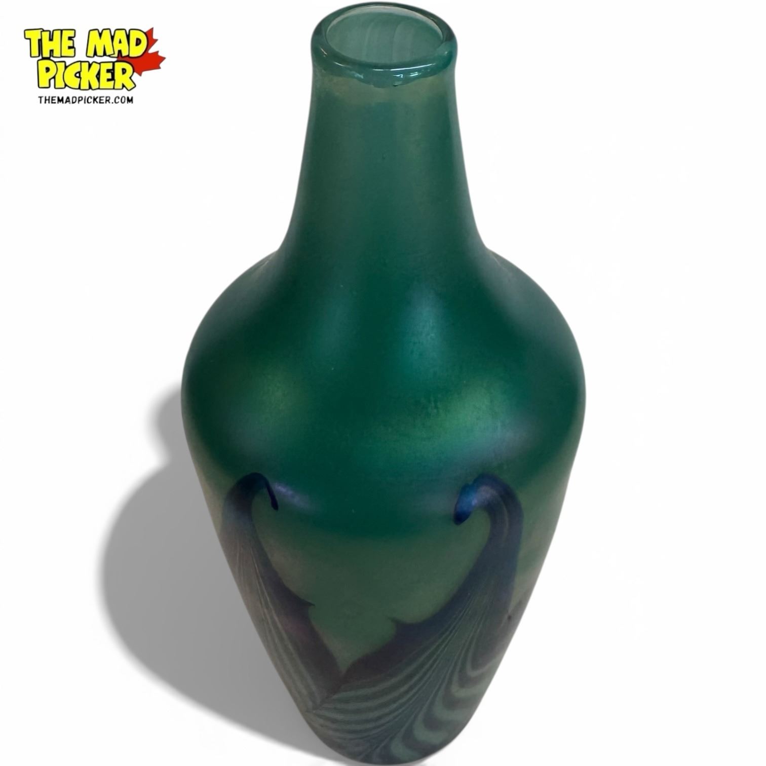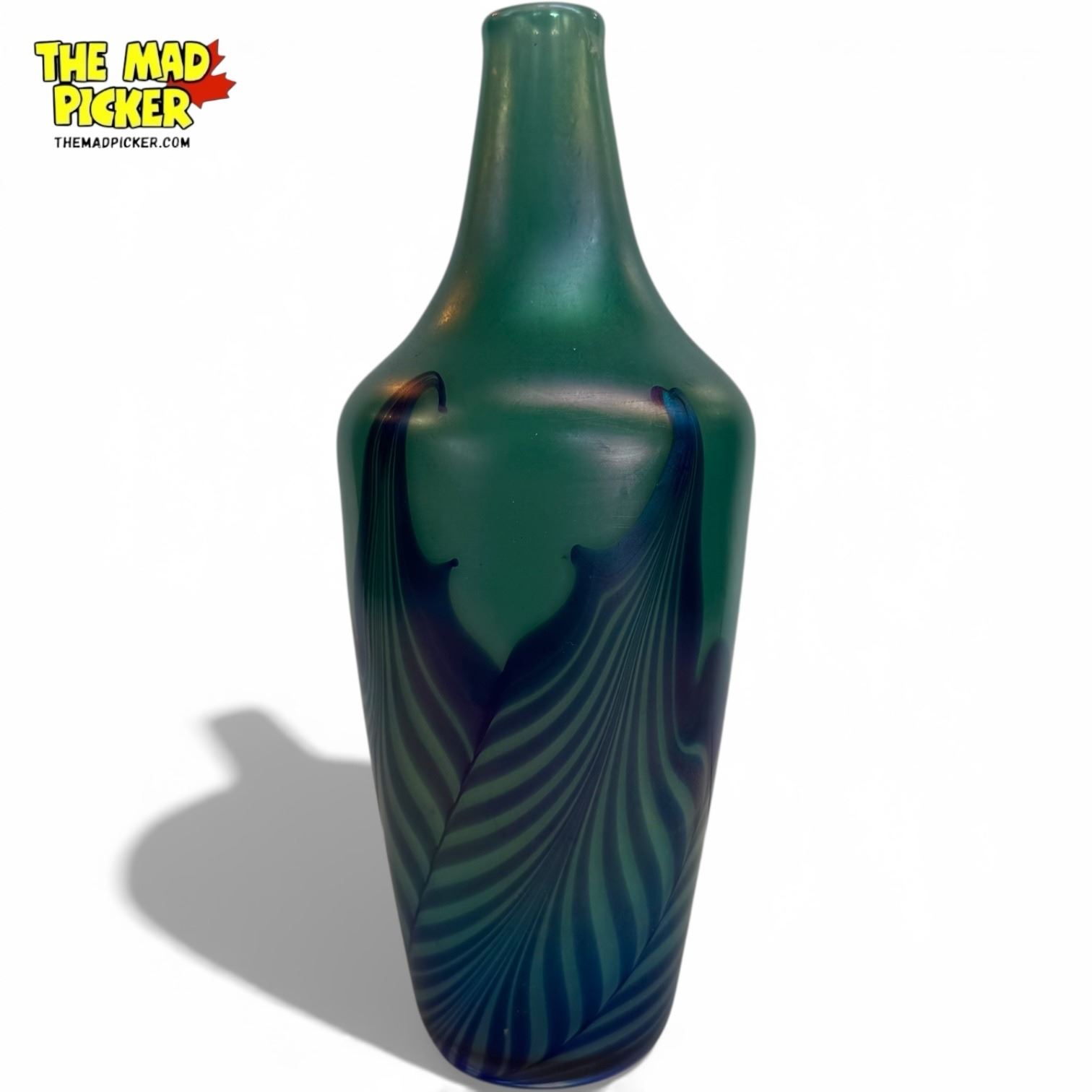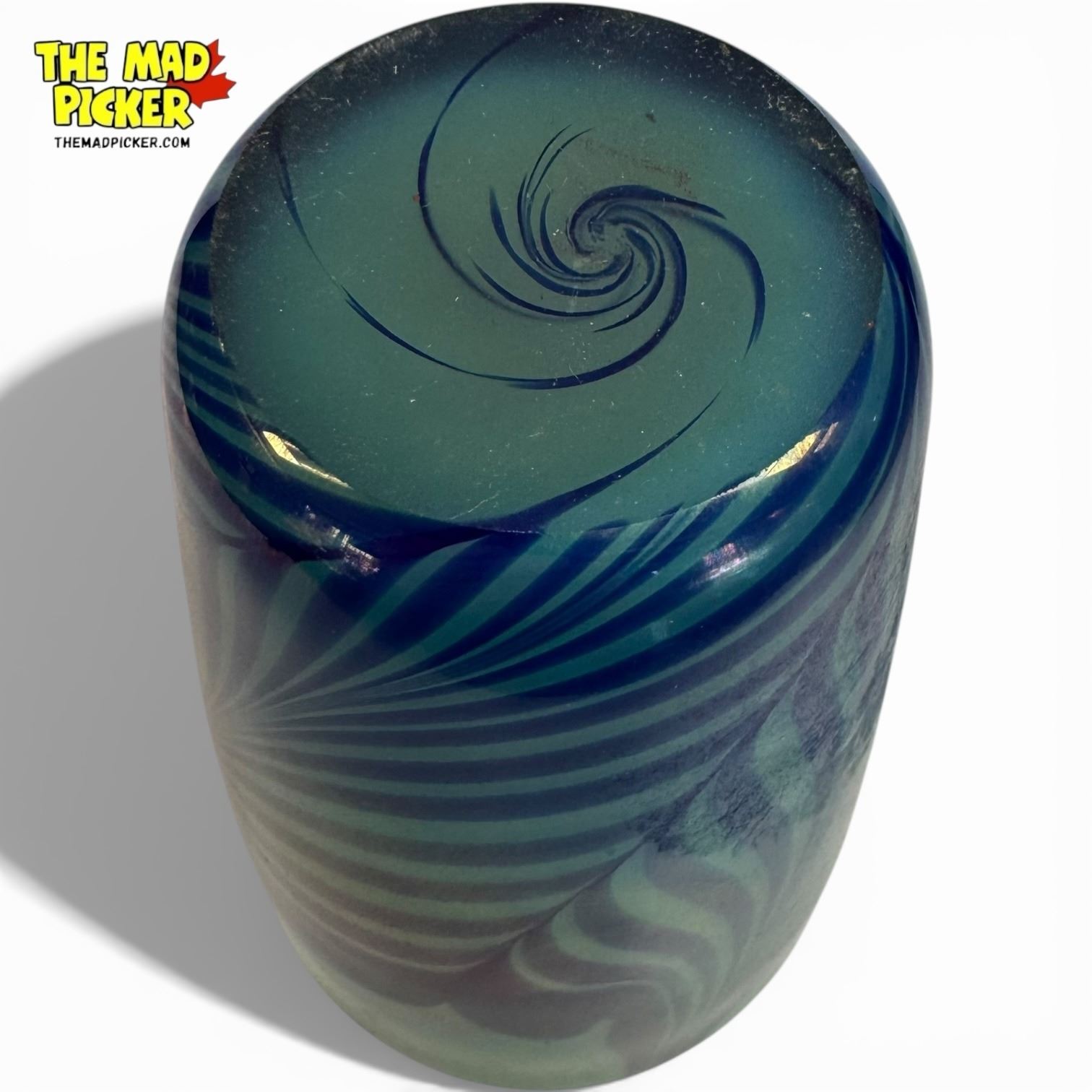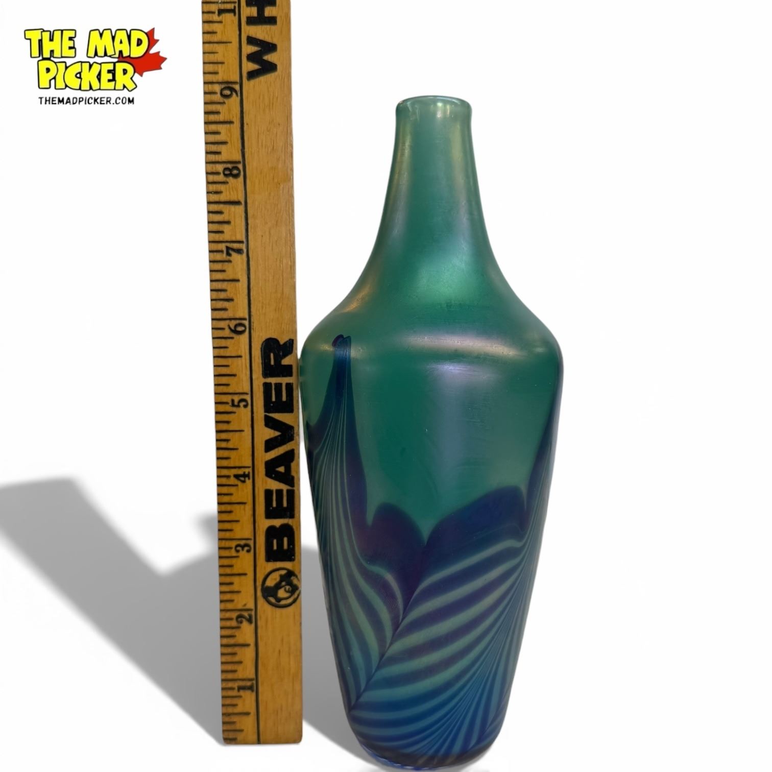 9-inch tall blown glass vase featuring an iridescent blue finish and intricate pulled feather design. Handcrafted style similar to works by Robert Eickholt or Steven Correia. Elegant art glass piece highlighting reflective, multi-tonal surface detailing and skilled craftsmanship.