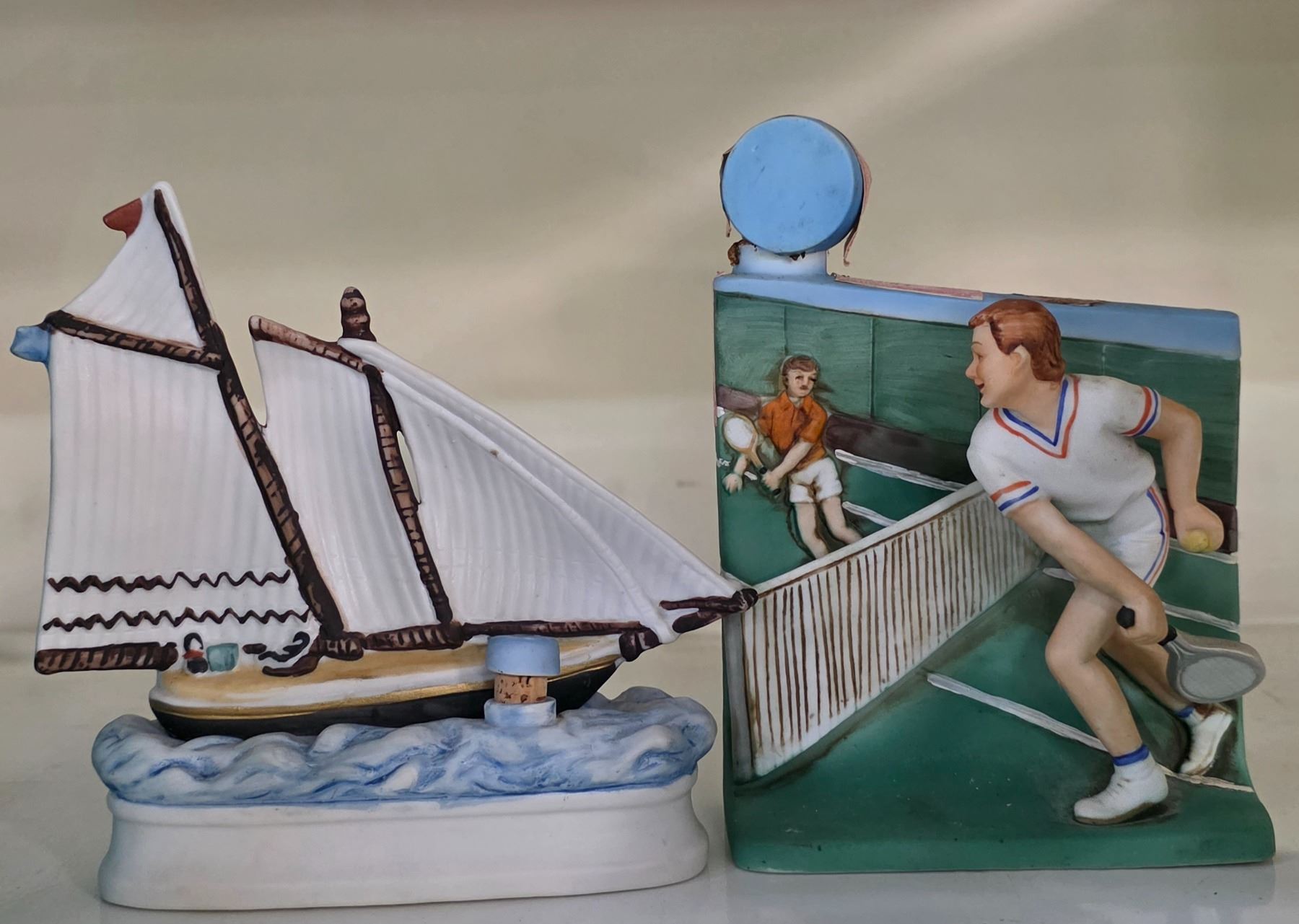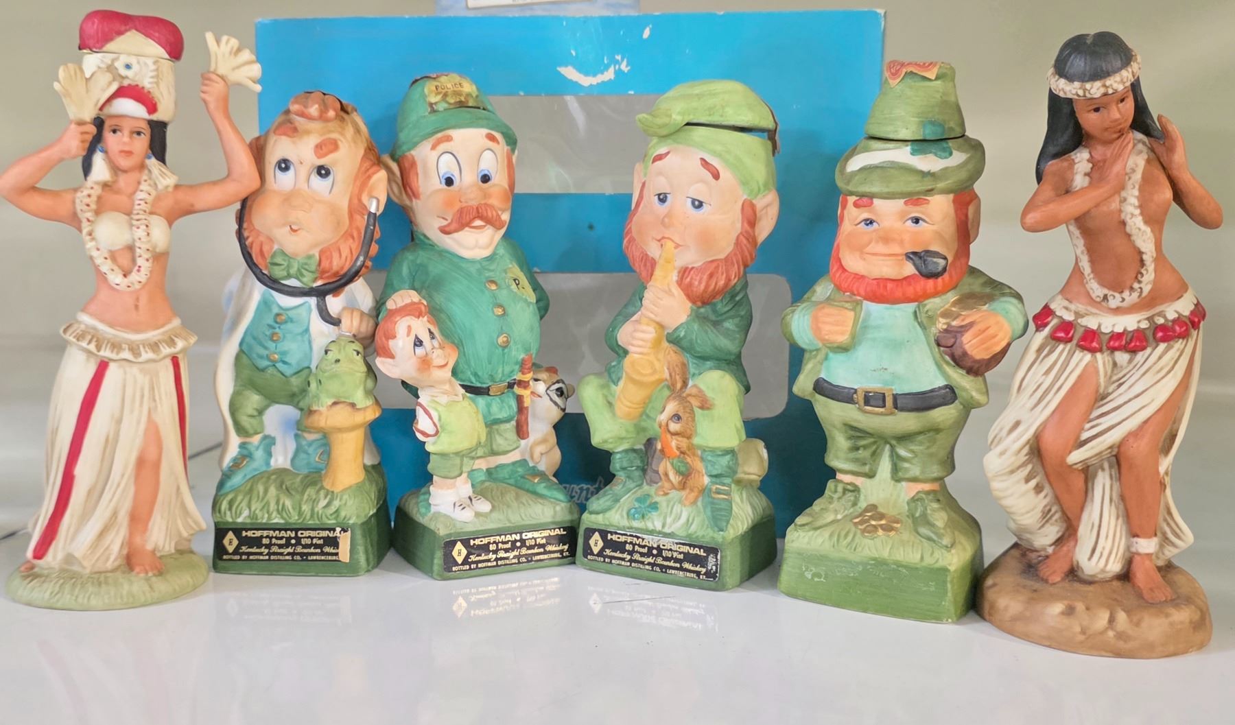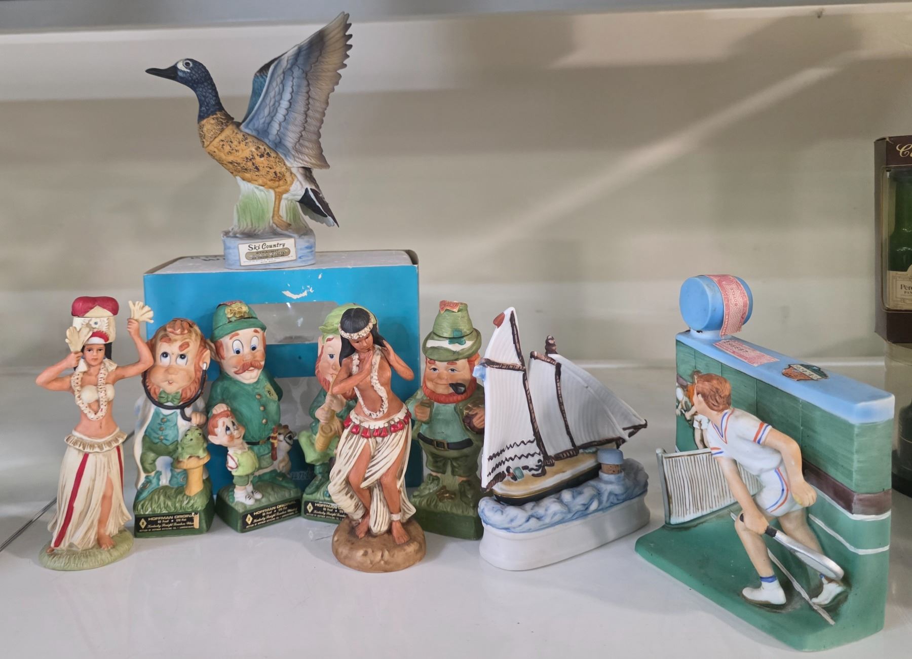 9 Piece Lot of Vintage Ski Country, Hoffman Bros, & Haas Bros Porcelain Liquor Decanters - Tallest is 7"