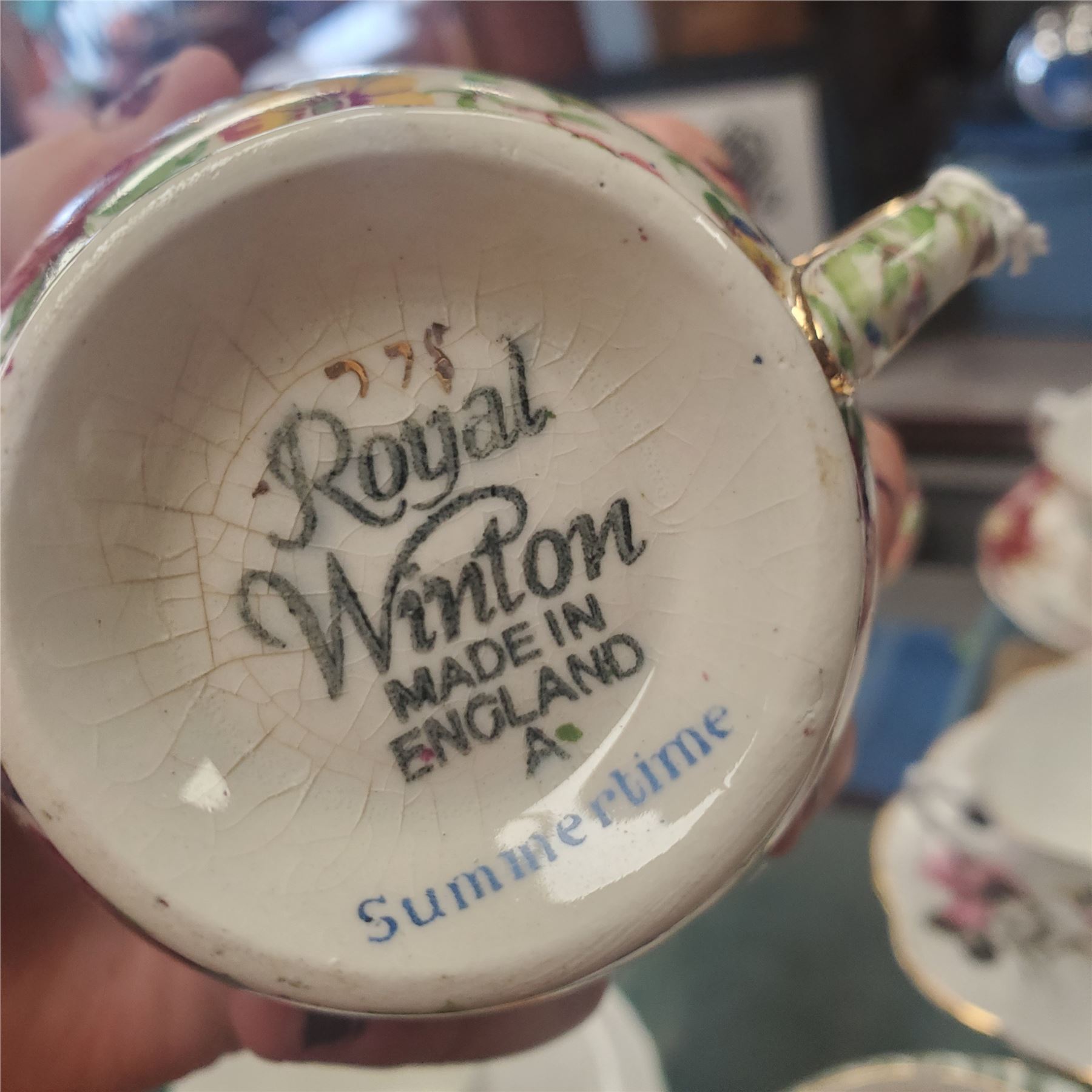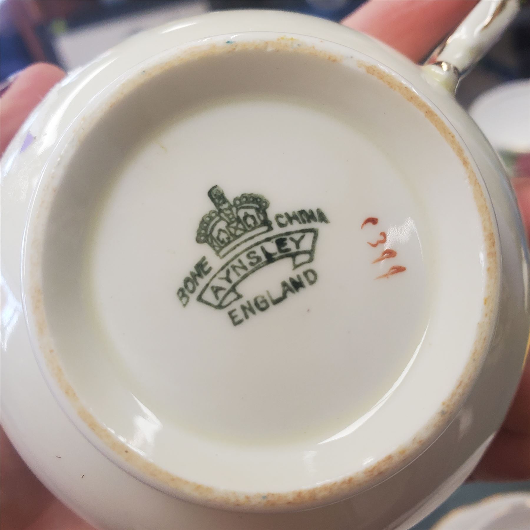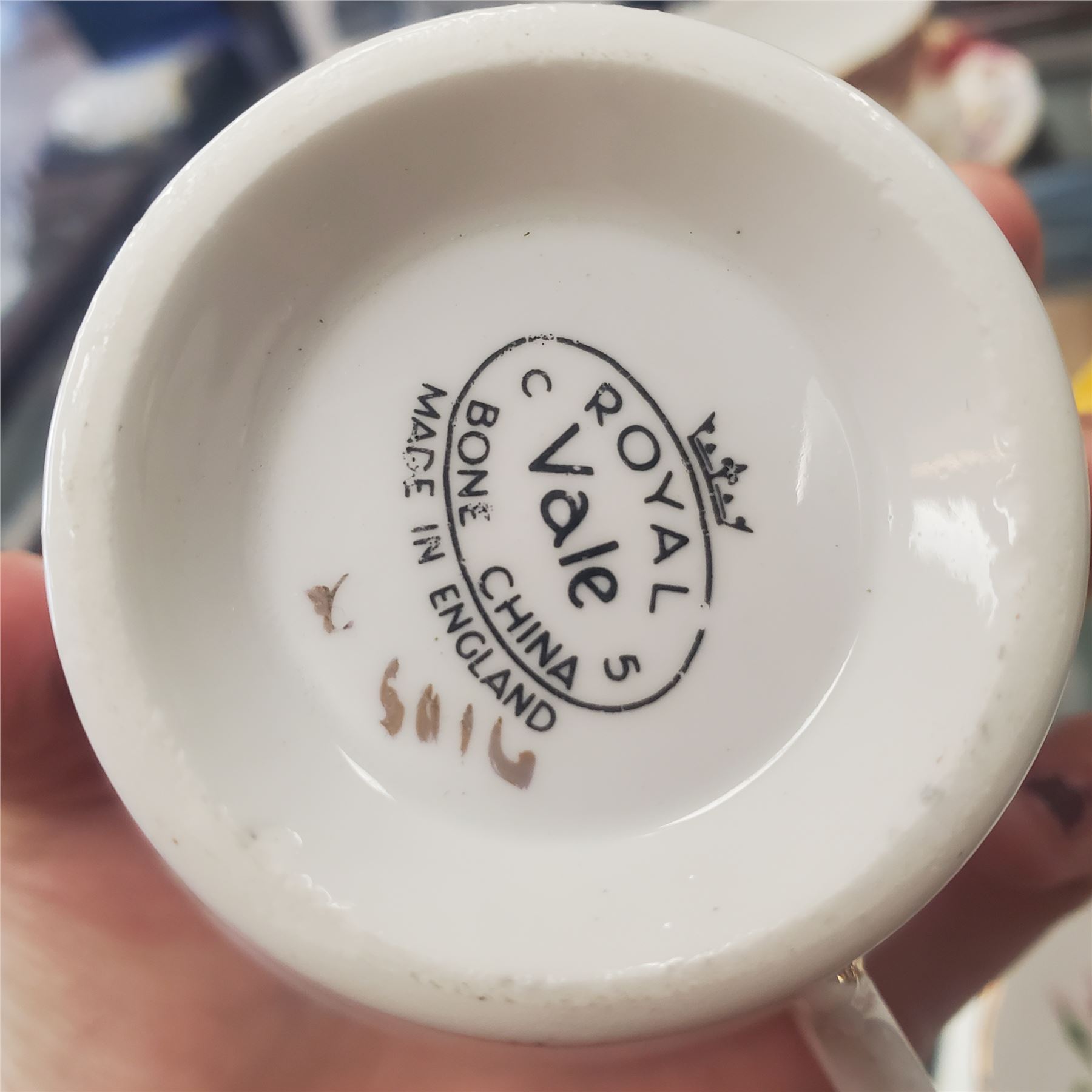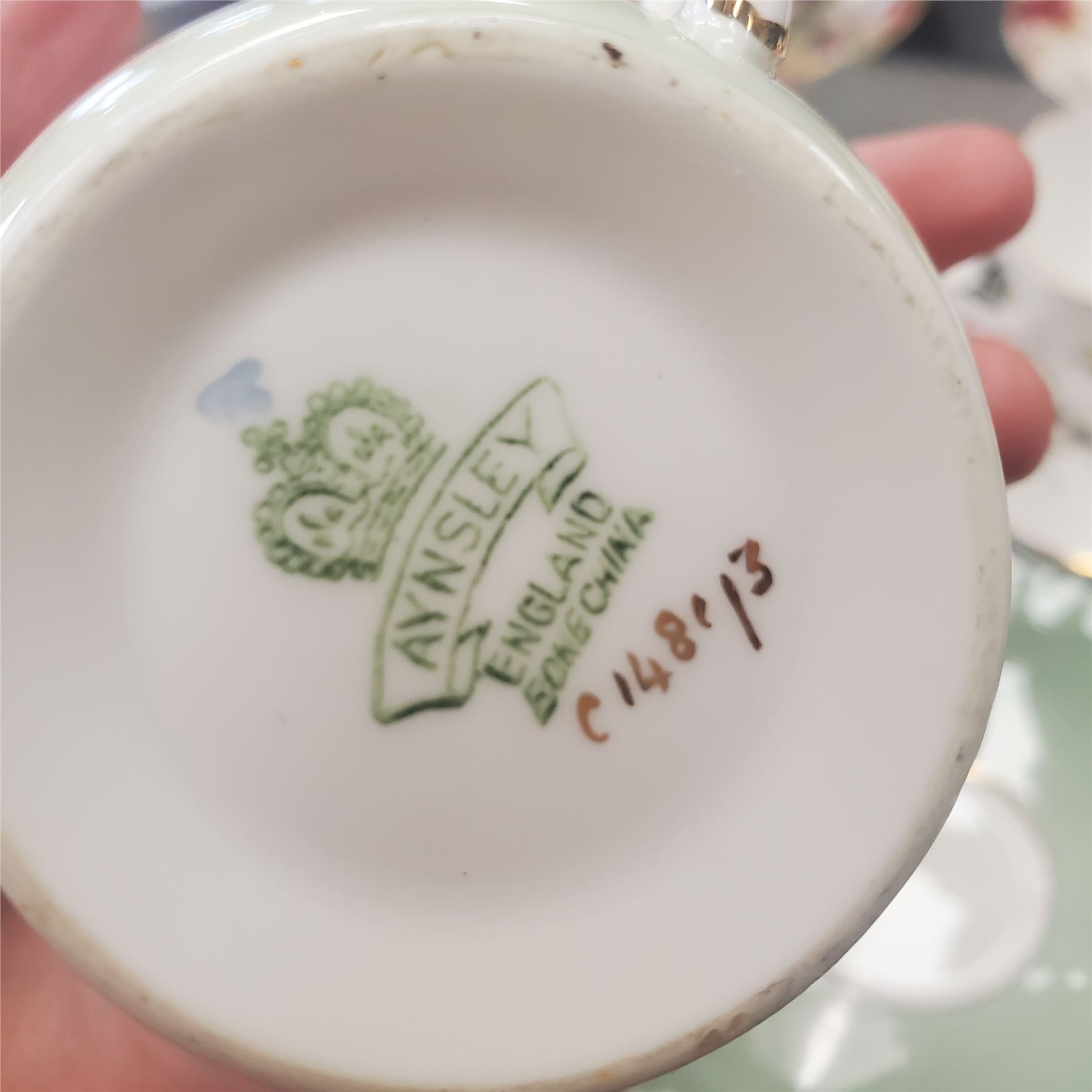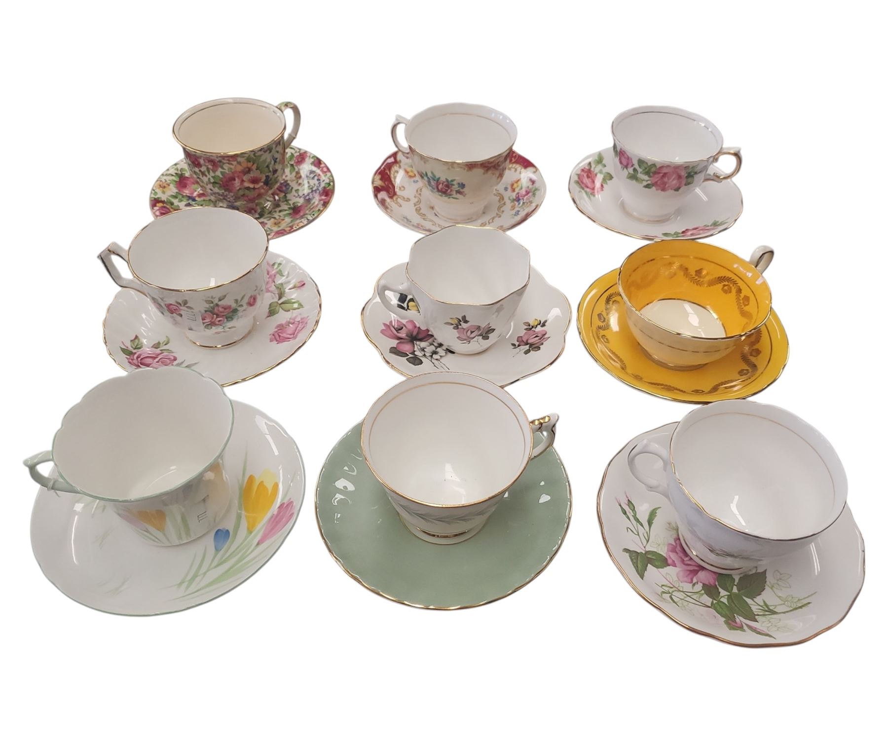Set of 9 vintage teacups with matching saucers featuring designs from Shelley, Aynsley, Royal Vale, Colclough, Royal Winton, and Rosina. Each pairing showcases unique patterns and craftsmanship from these esteemed makers. Item is as pictured.