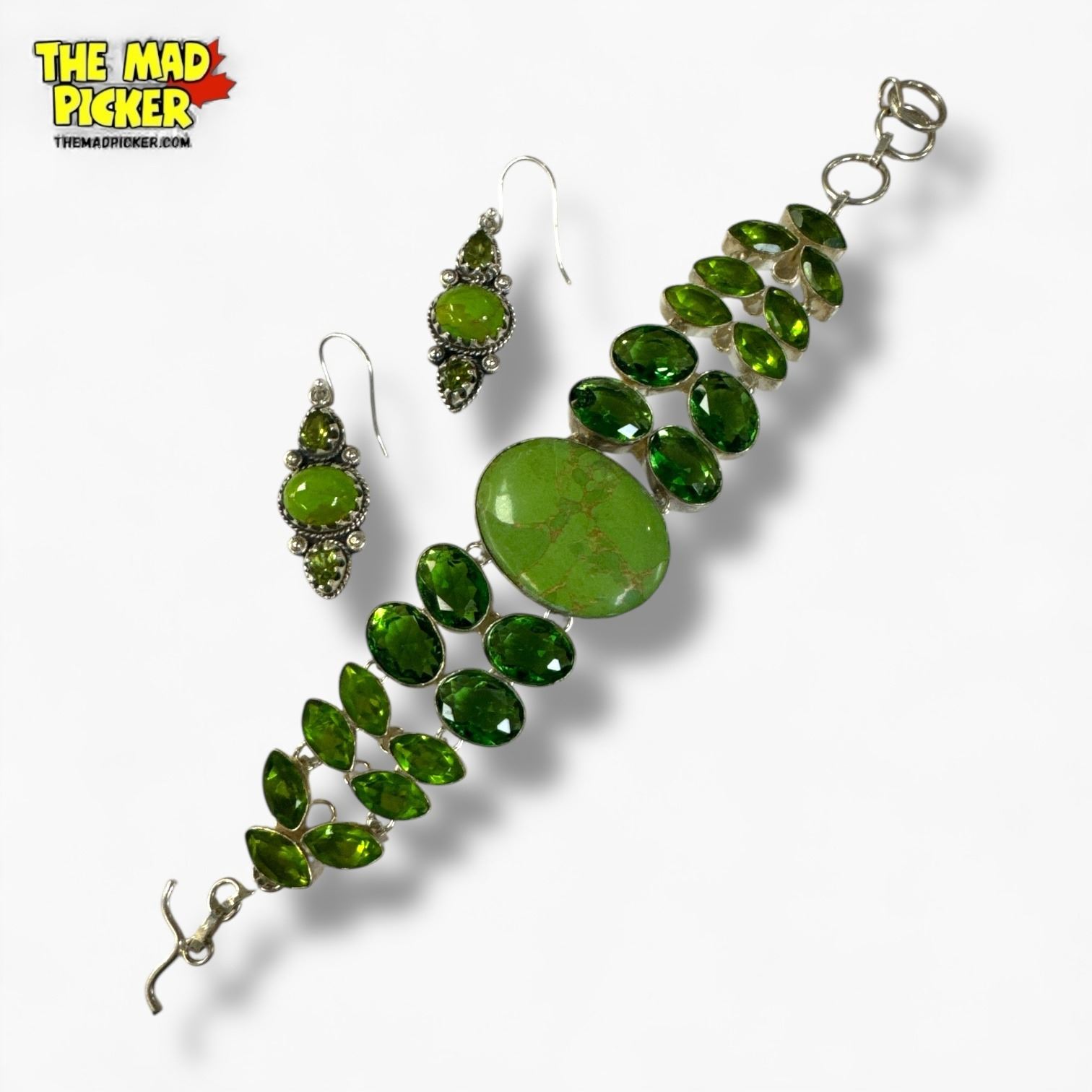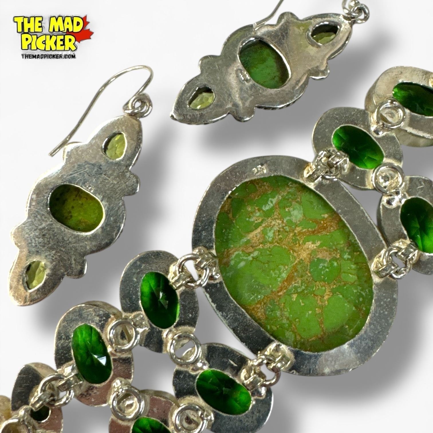 .925 Sterling Green Turquoise & Peridot Bracelet & Earrings Set (Bracelet is 1.5" wide)- Total weight: 57.8 grams