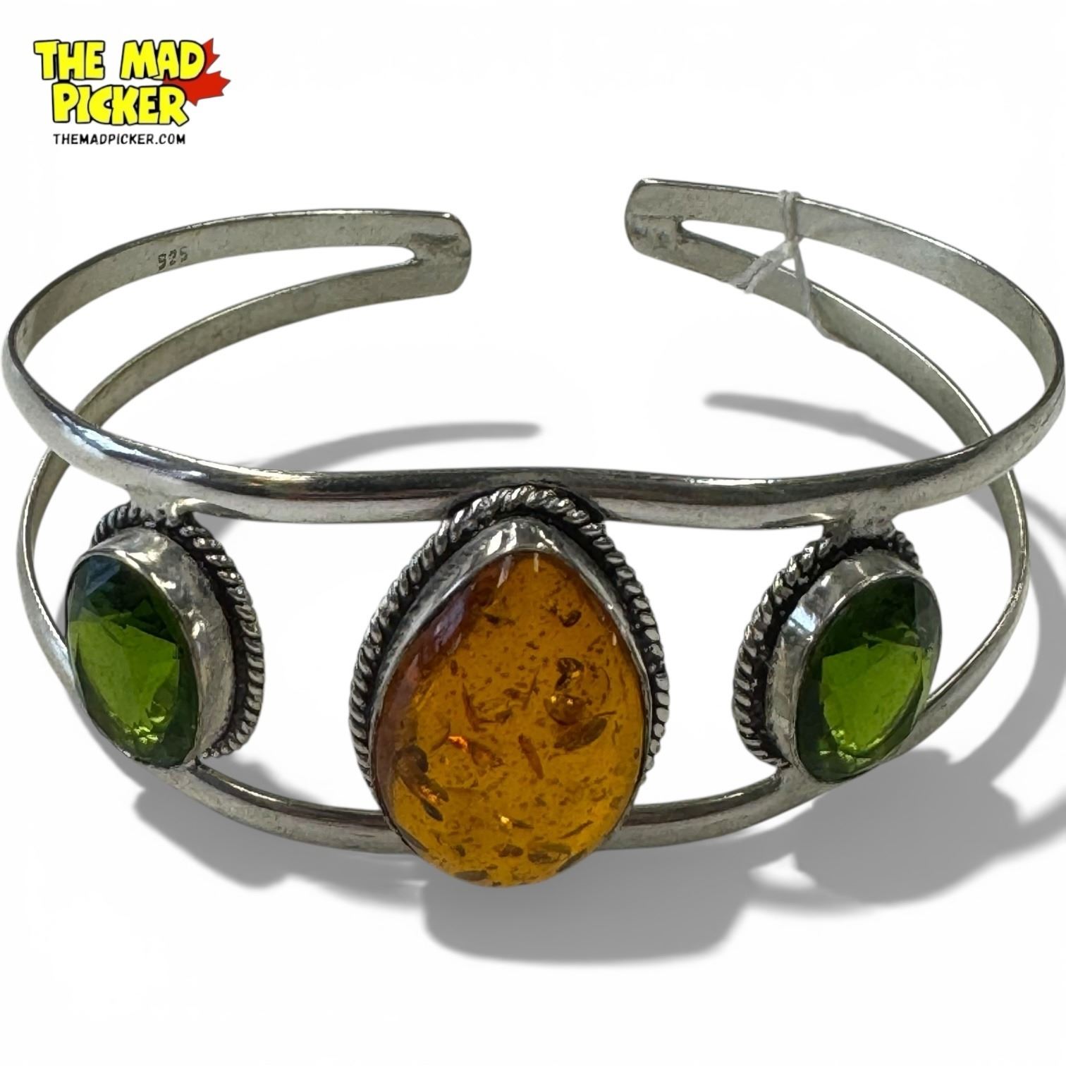 .925 Sterling Silver Amber Resin & Emarald Crystal Cuff Bracelet - 26mm wide - Weight including gemstone: 18.6 grams