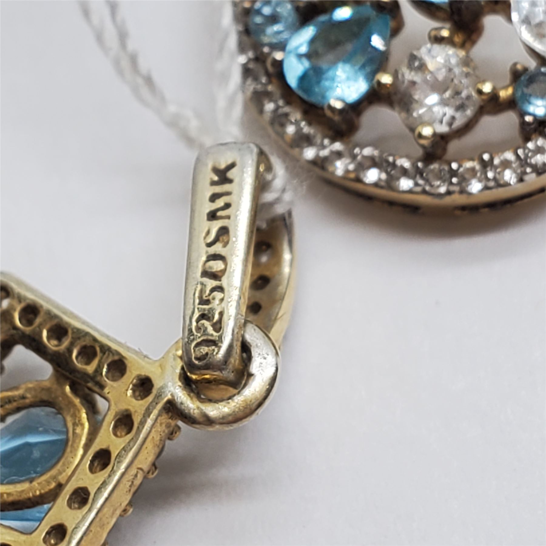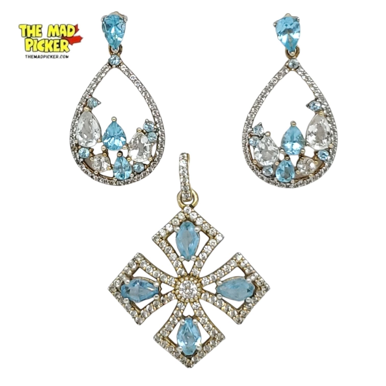 .925 Sterling Silver Aquamarine & Crystal Earrings & Pendant (Gold accented) - Total weight: 9.4 grams