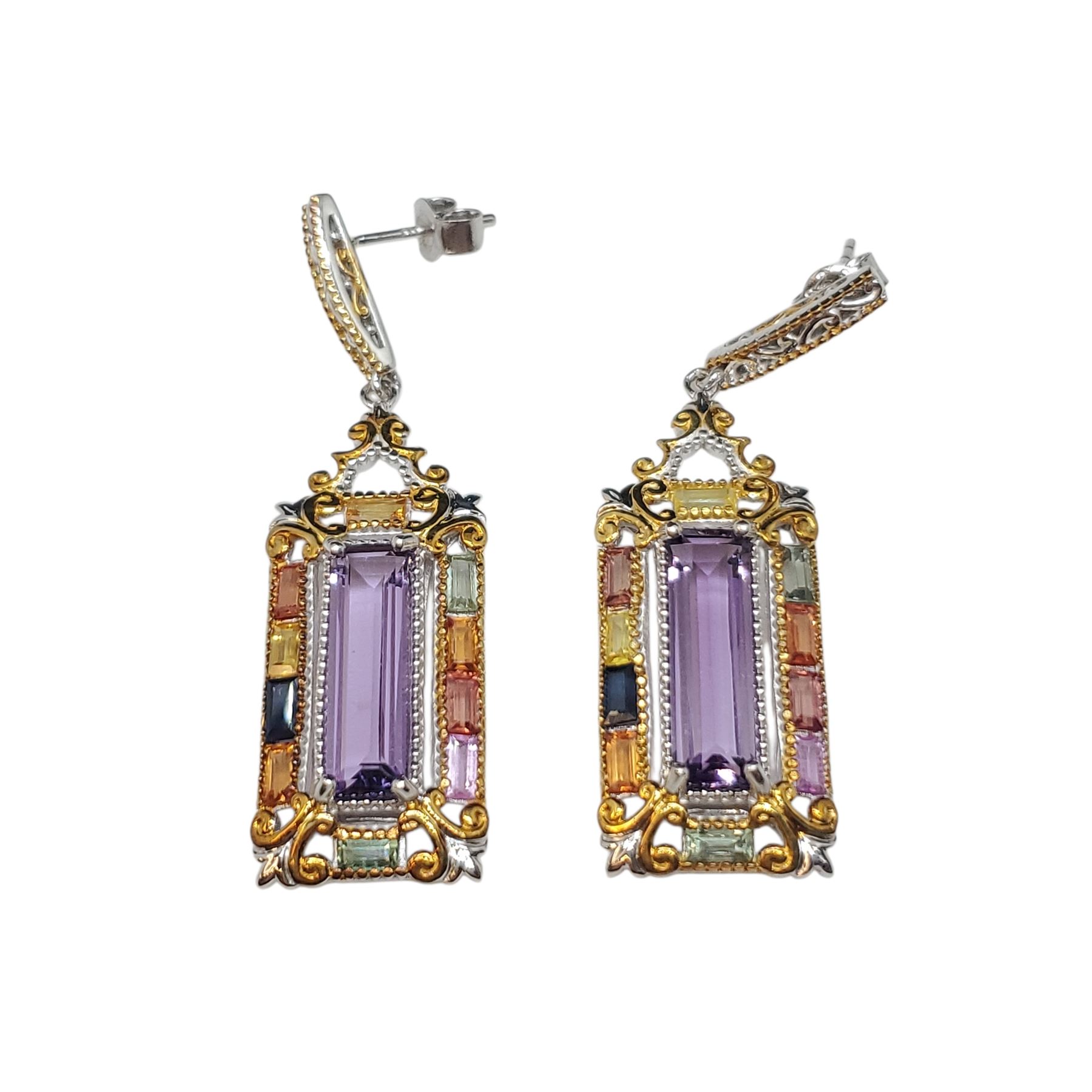 .925 Sterling Silver Balinese Amethyst & Multicolour Sapphire Earrings with Gold Plating - 2" Long x 0.5" wide- Weight: 10.6 grams