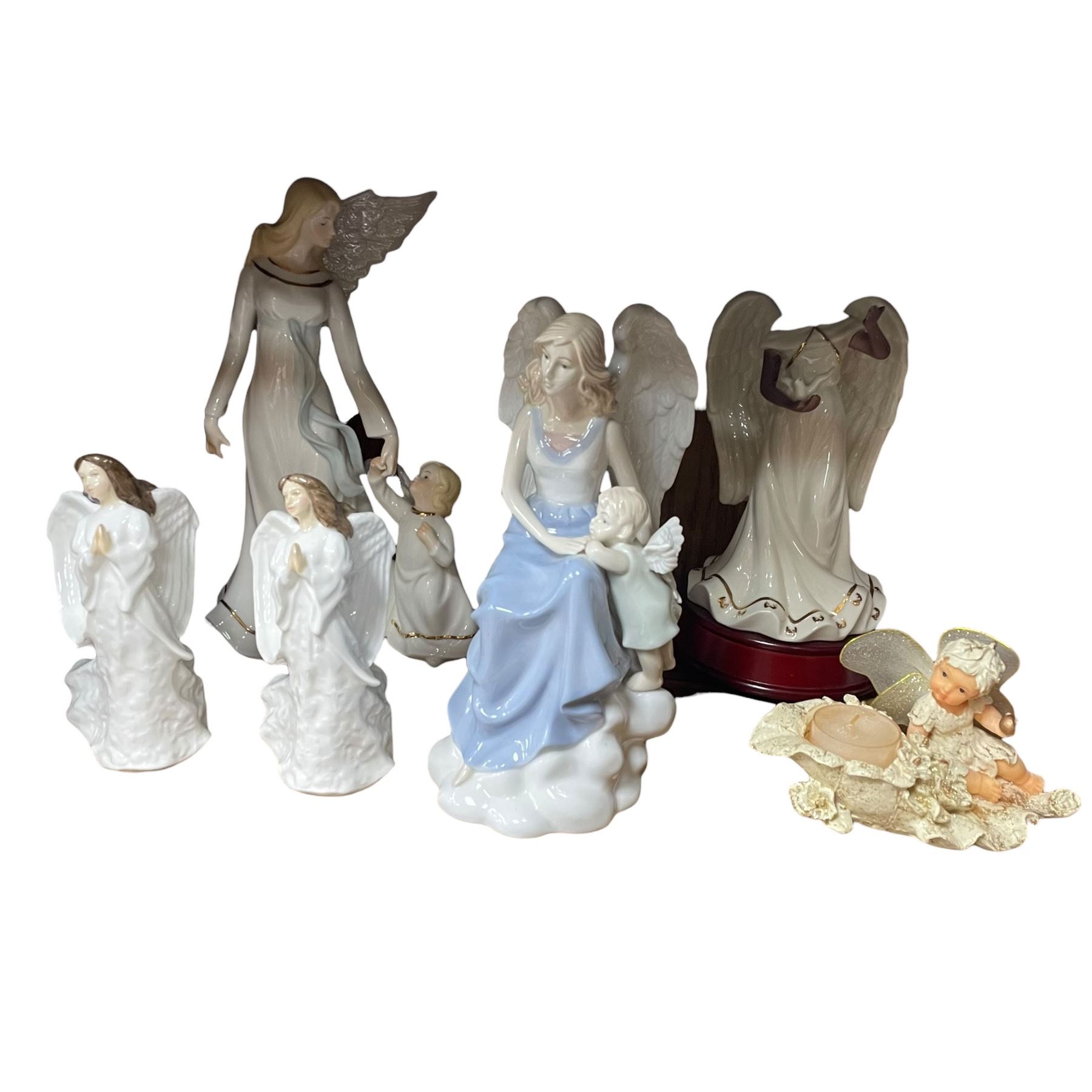 This lot features a group of angel figurines, including two Royal Doulton HN3733 figurines and assorted other angel figures. Each piece showcases varying designs and styles. Item is as pictured.