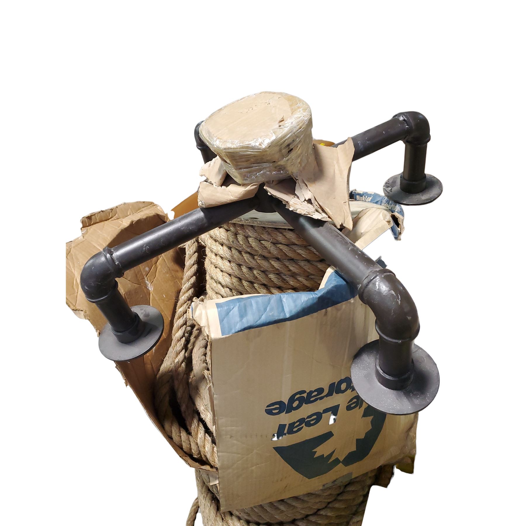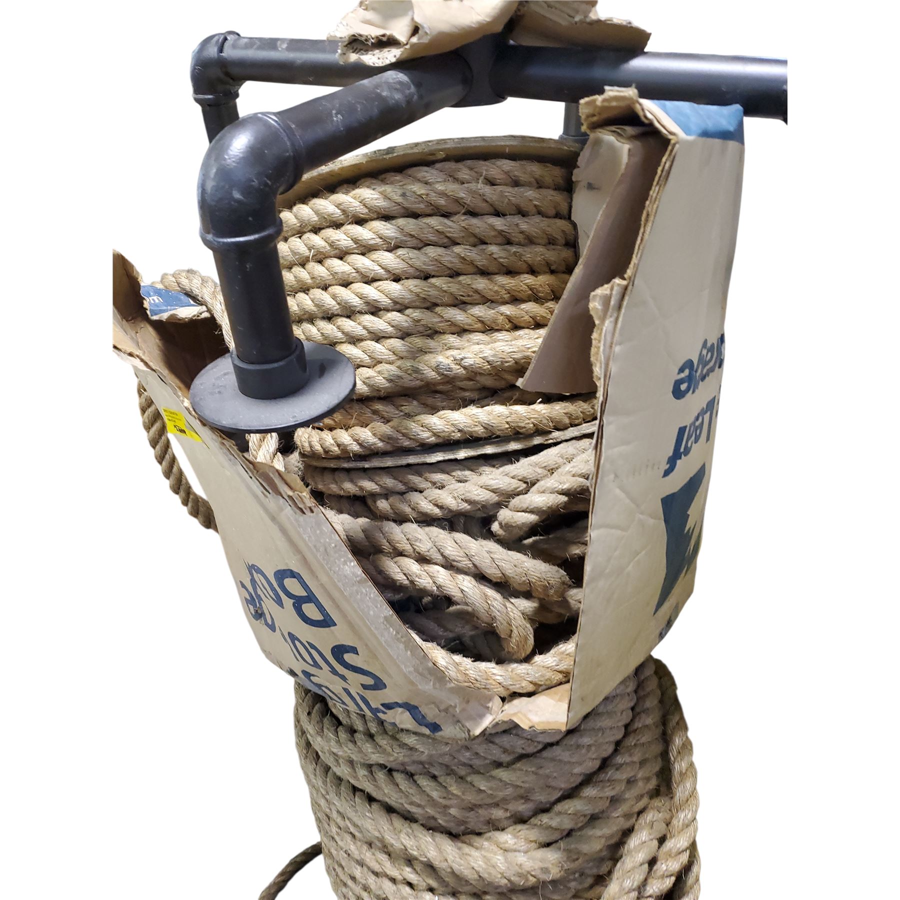 A large, wooden spool wrapped with thick, braided natural fiber rope.