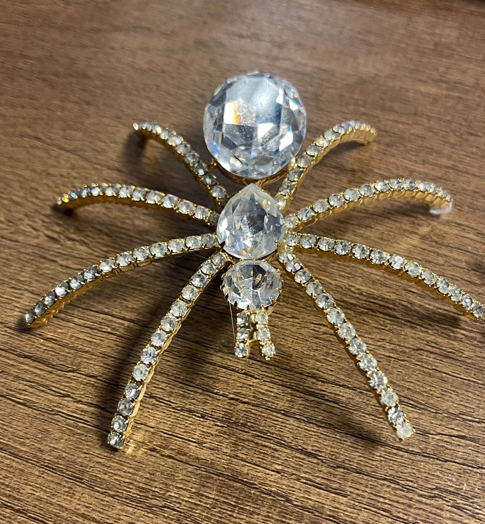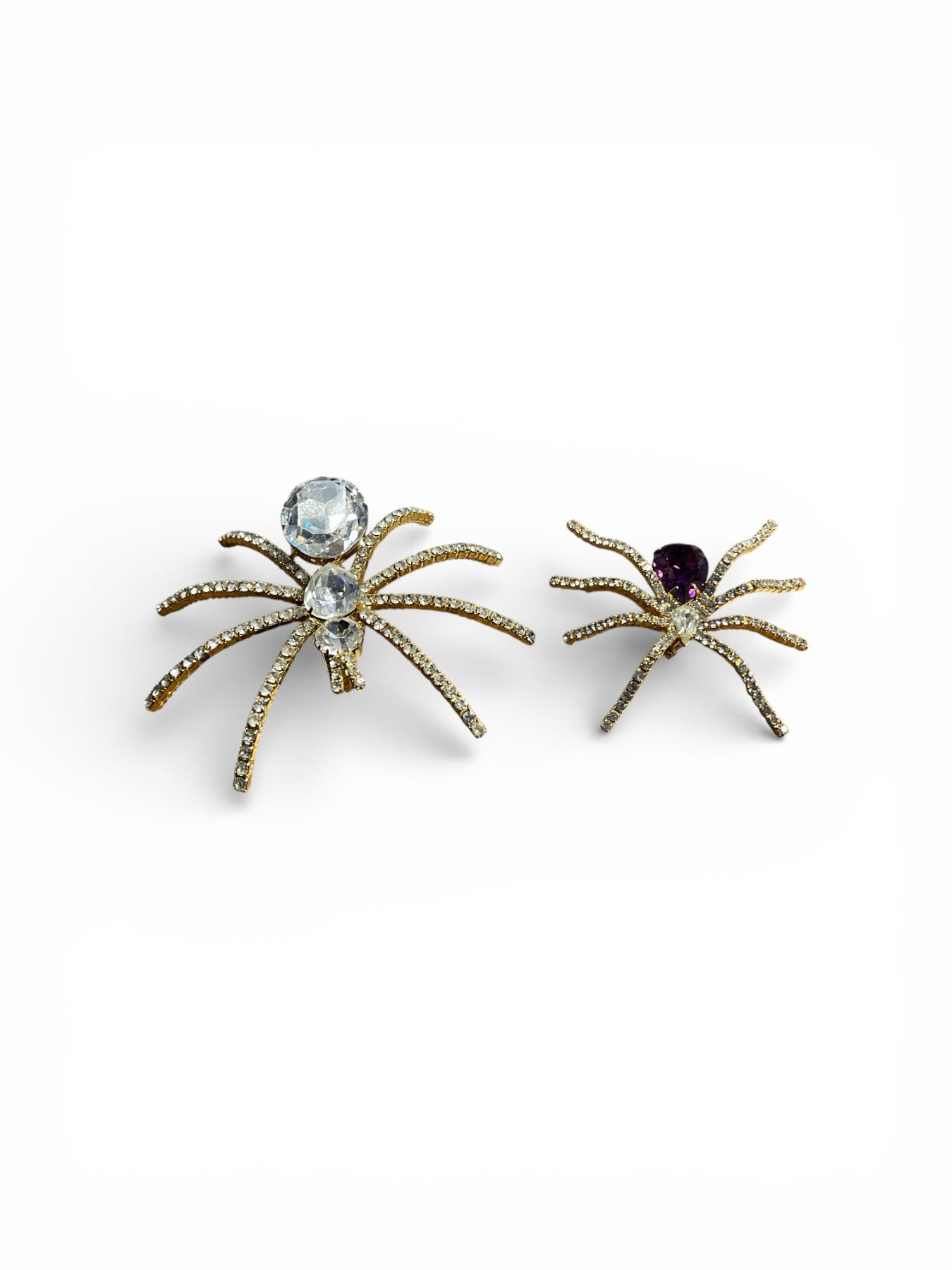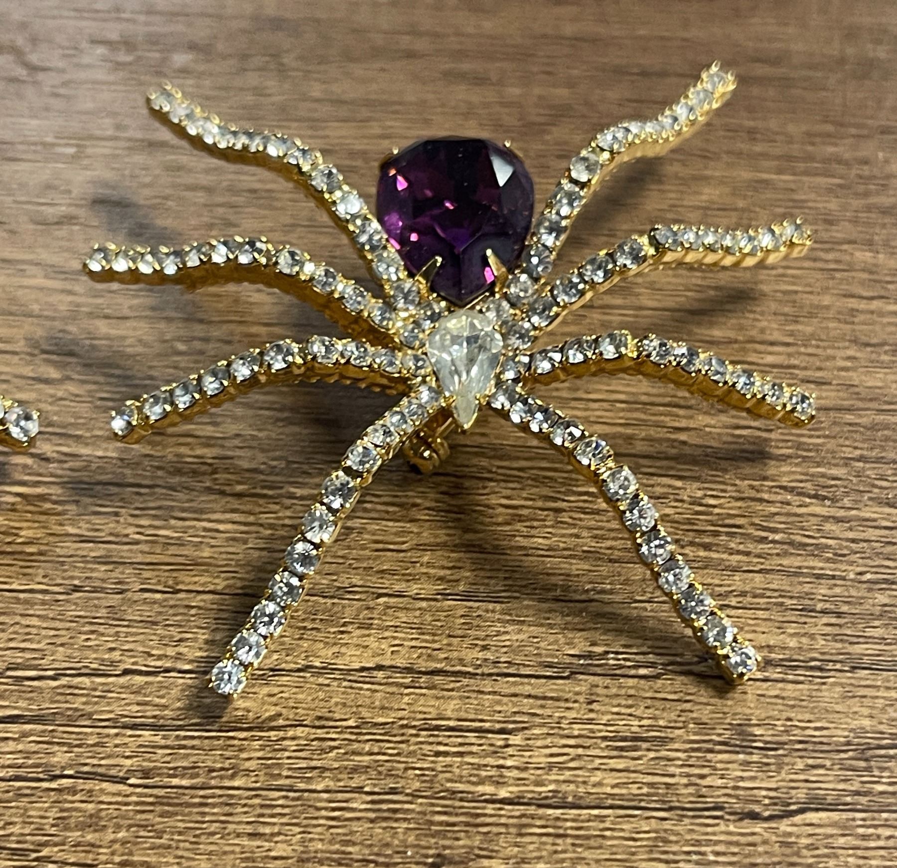 A pair of Ivana large and small spider brooches encrusted with colourless paste stones, small one has a central purple paste stone - Appraised Value $112