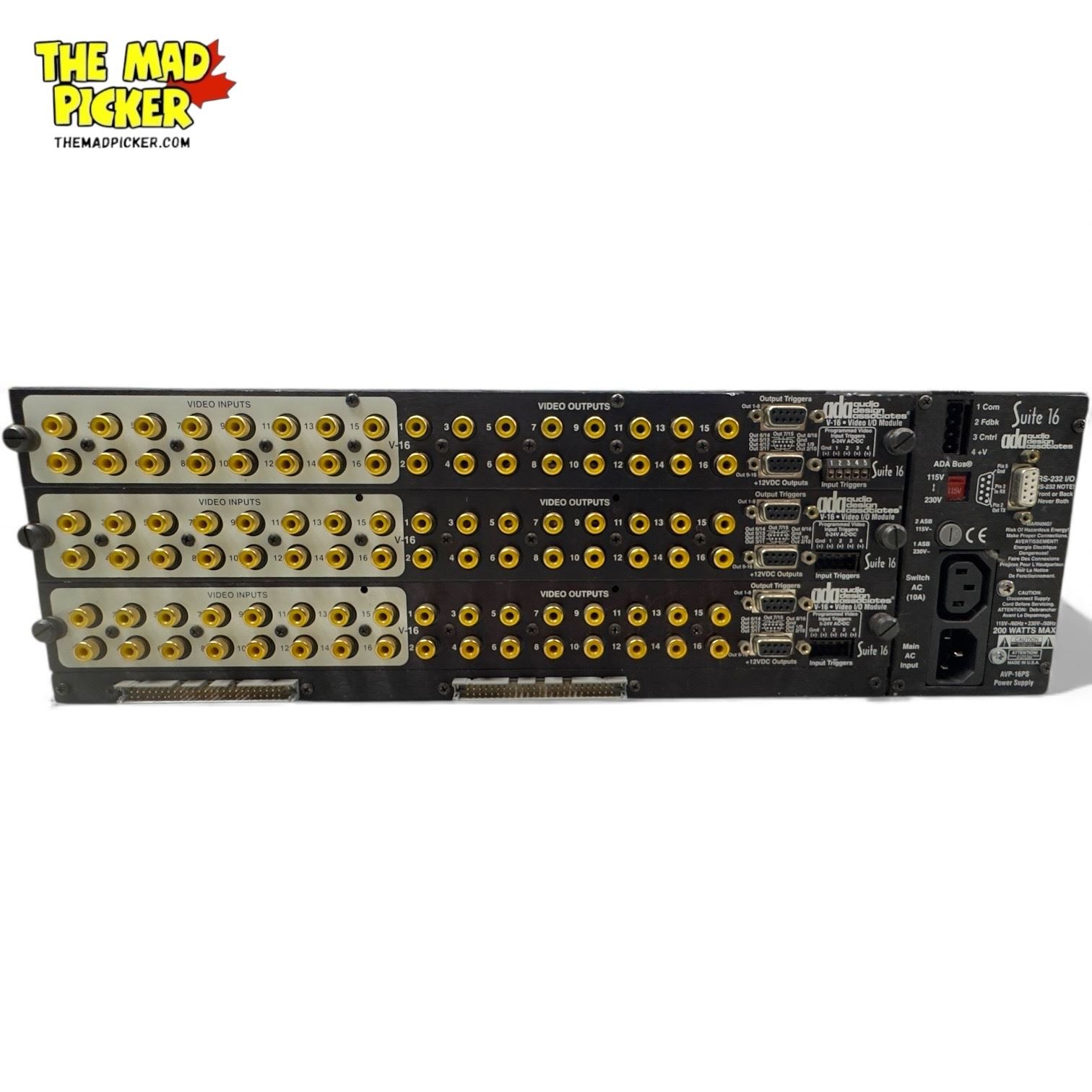 The ADA Suite 16 is a modular multi-room controller system built around the AVP-16 chassis, designed for large homes or commercial installations. System design includes modular slots for audio, video, and preamp modules with expandability beyond 16 zones. Audio modules: A-16 audio input module with 16 stereo RCA inputs, balanced audio page input, and trigger inputs; PP-1200 phono preamplifier optional for turntable integration; preamp module for zone-level control of volume, mute, and EQ. Video modules: V-16 video switching module supporting S-Video, Component, or RGBHV matrix switching. Control and integration: RS-232 connections for PC or automation systems (Crestron, AMX), global functions including input trim, party modes (up to 8), and paging to individual or all rooms; configurable baud rate, zone assignments, and paging settings. Paging and party modes: built-in paging features for announcements across zones; party mode allows grouping of zones to a single source. Expandability: slave-unit configuration options for scaling beyond 16 zones; compatible with ADA amplifiers and controllers for larger systems.