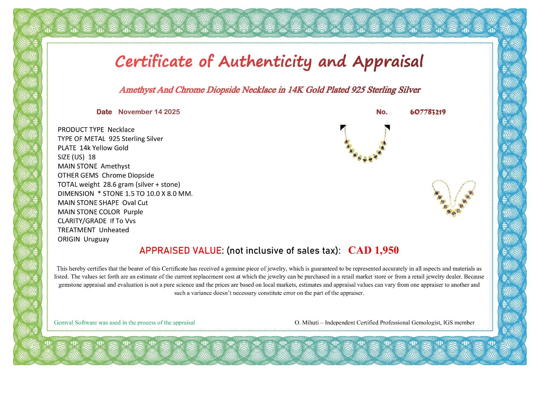 AMETHYST AND CHROME DIOPSIDE NECKLACE IN 14K YELLOW PLATED GOLD OVER 925 STERLING SILVER - 18 INCHES LONG - APPRAISED REPLACEMENT VALUE $ 1,950
