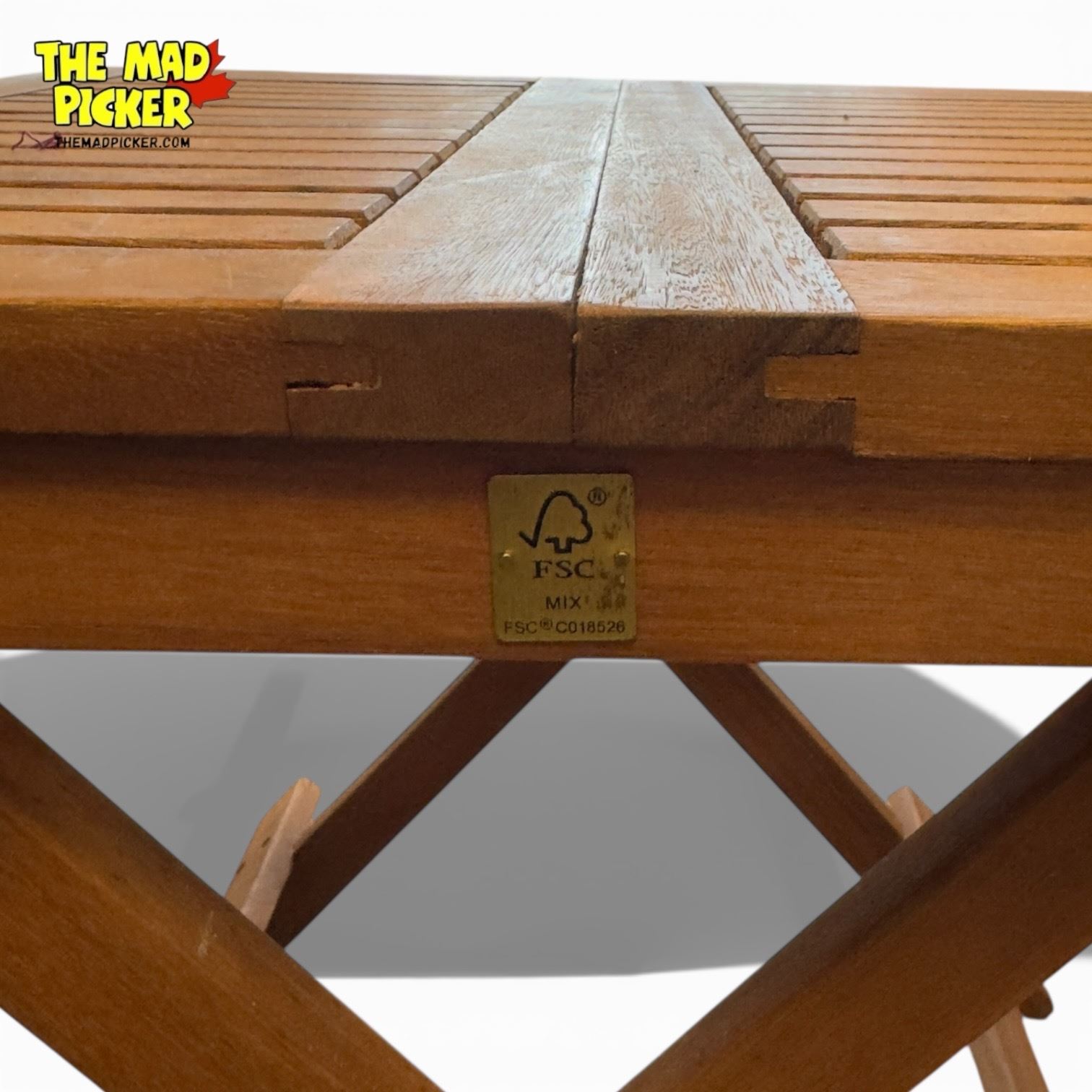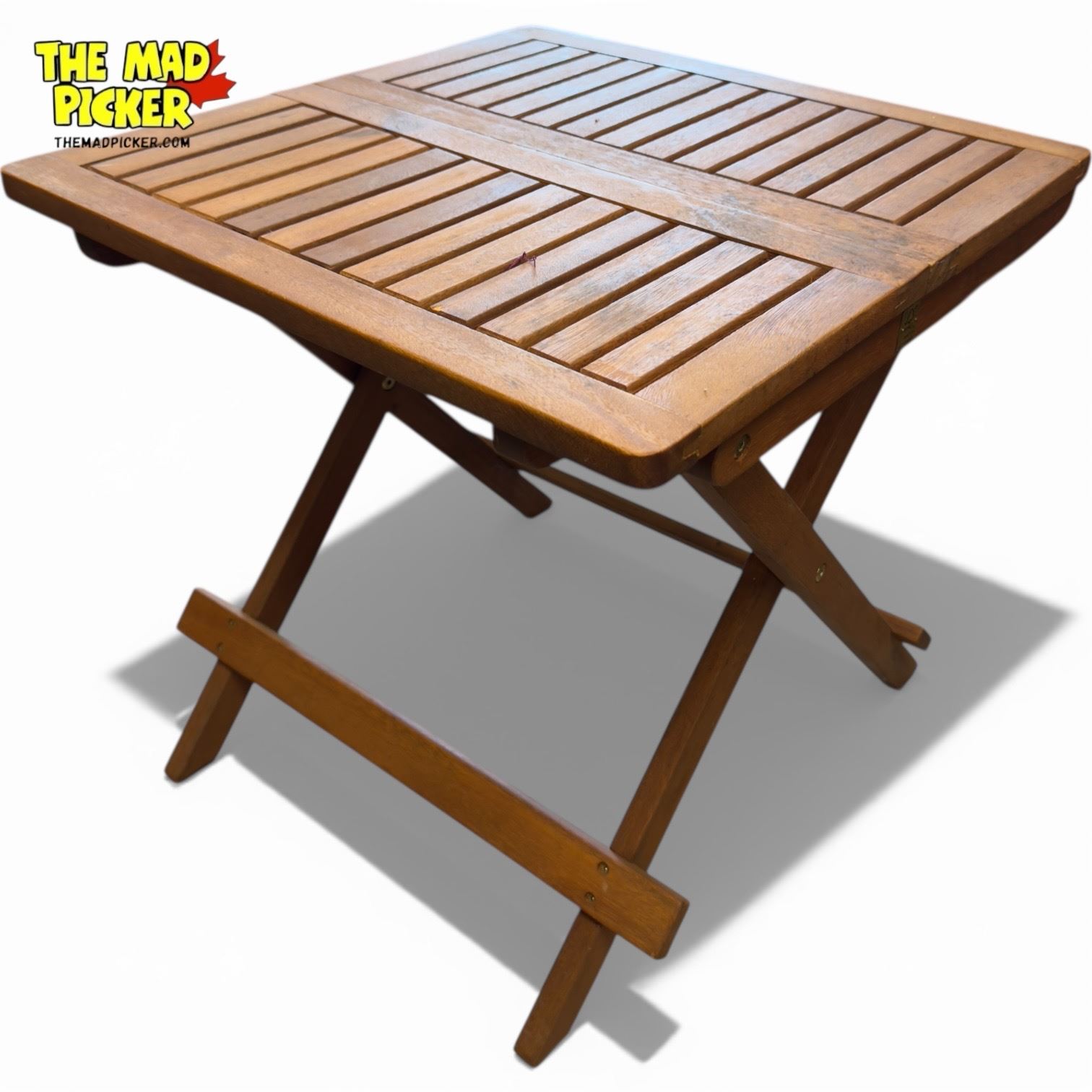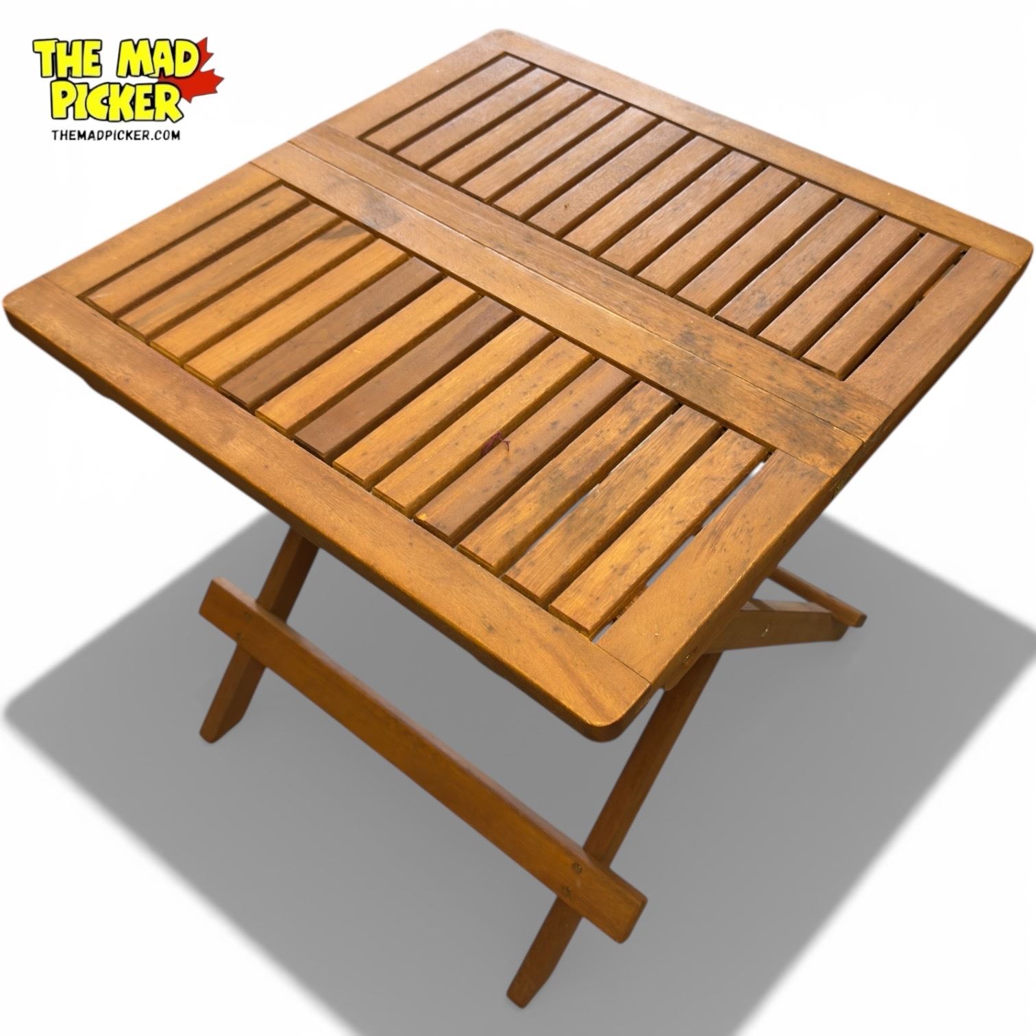 Square folding bistro table crafted from durable acacia wood, designed for outdoor use. Measures approximately 19in x 19in x 19in. Compact, versatile design allows for easy storage and portability. Suitable for small outdoor spaces, patios, or balconies.