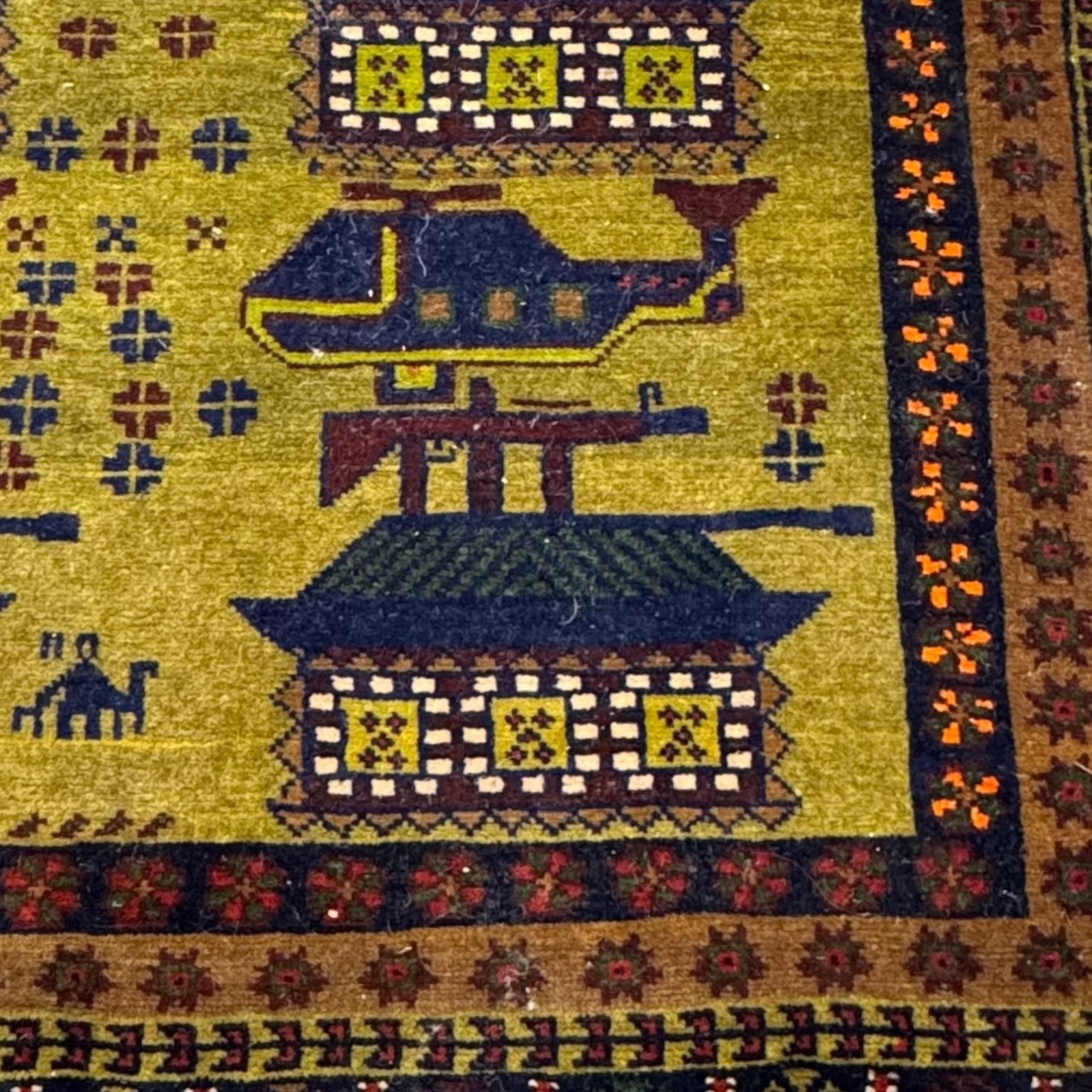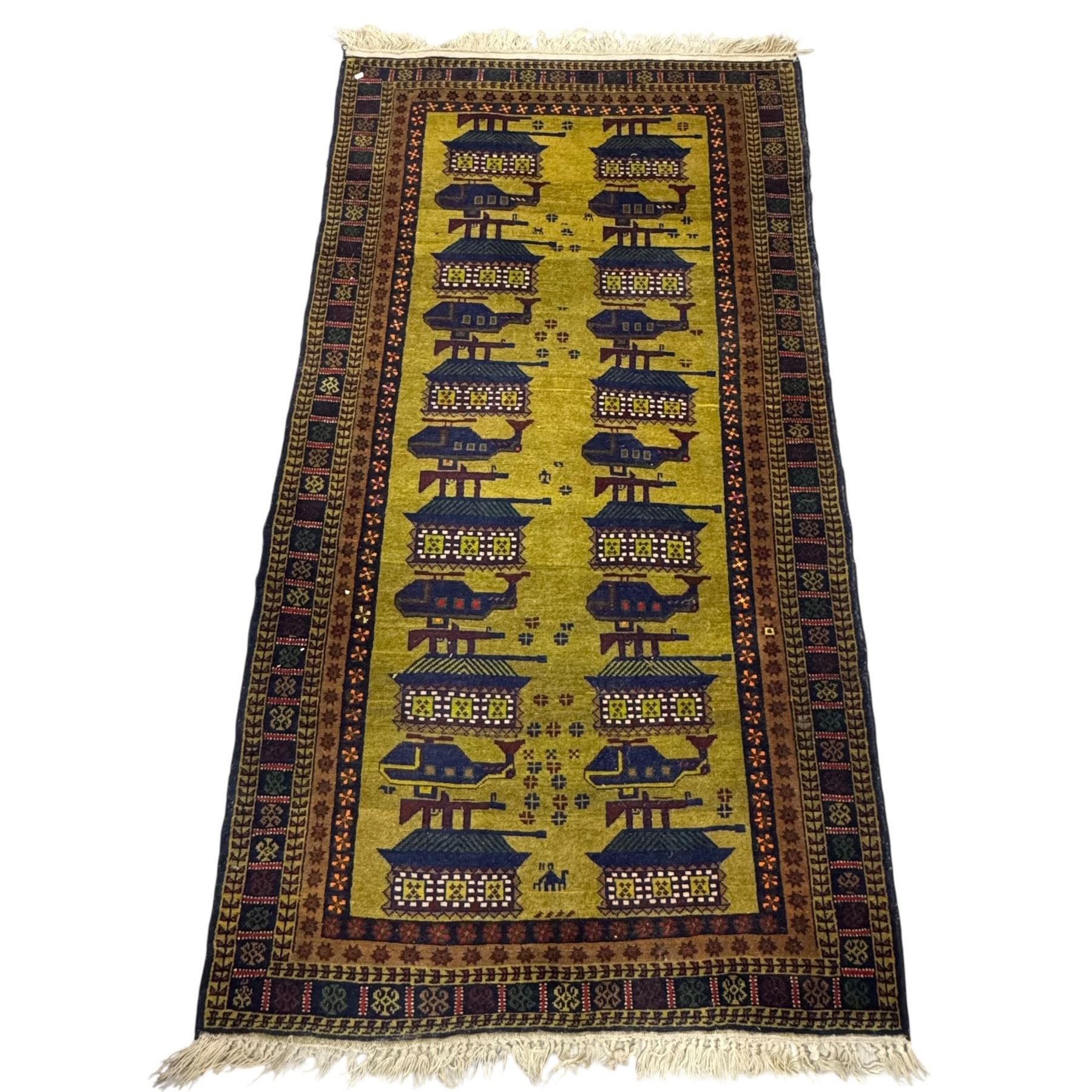 Afghan War Rug measuring 80 In x 42 In. Created in Afghanistan during decades of conflict, these rugs feature pictorial designs incorporating imagery of weapons such as tanks, helicopters, and maps. They symbolize the impact of war on Afghan life and are collected for their cultural and historical narrative. Item is as pictured.