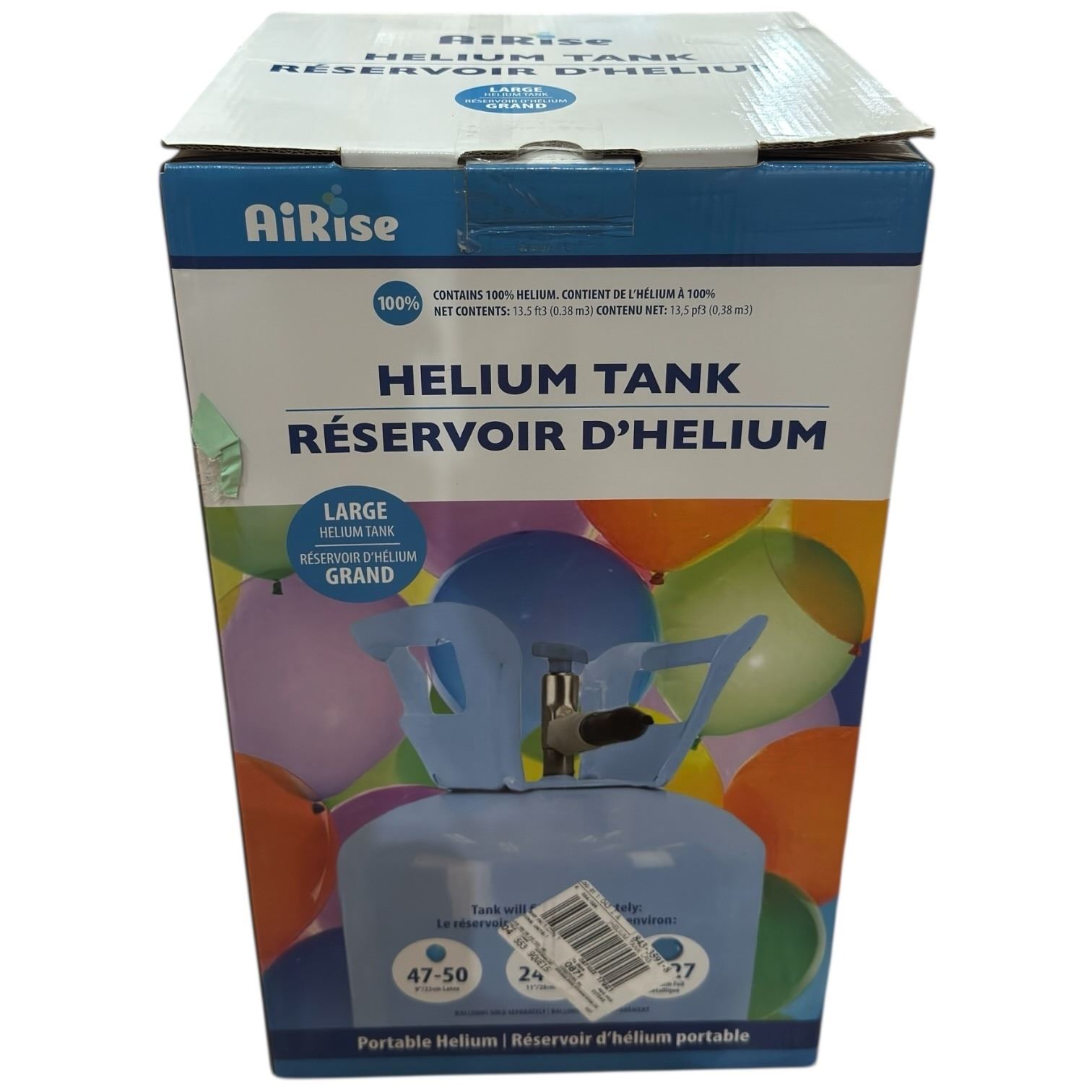 AiRise large helium tank with a capacity of 13.5 cubic feet, ideal for inflating balloons. Item is new and comes in its original packaging. Suitable for parties, events, and other occasions requiring balloons. Item is as pictured.