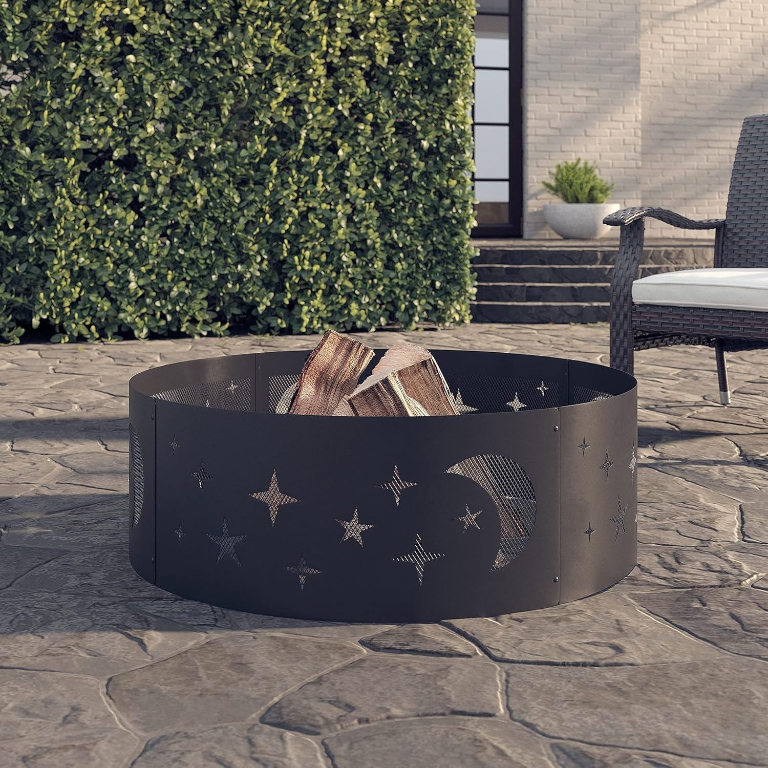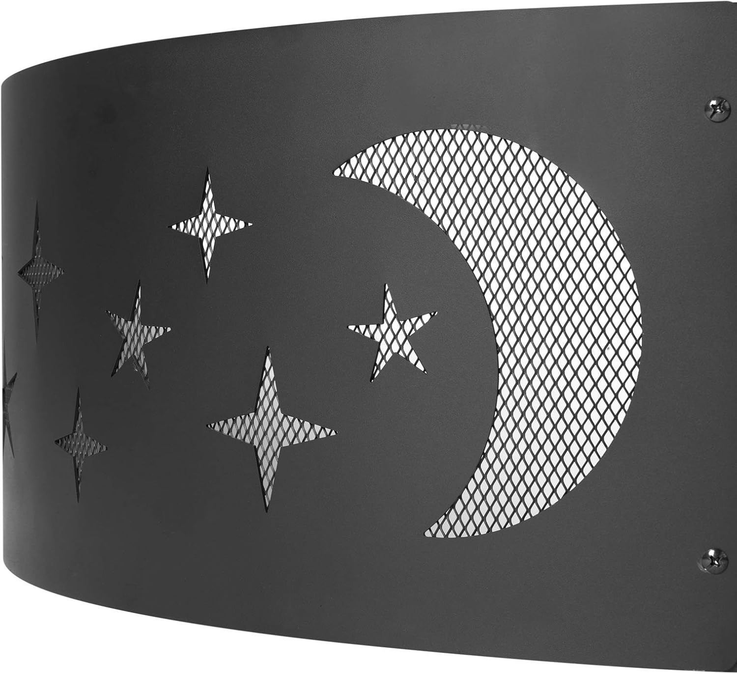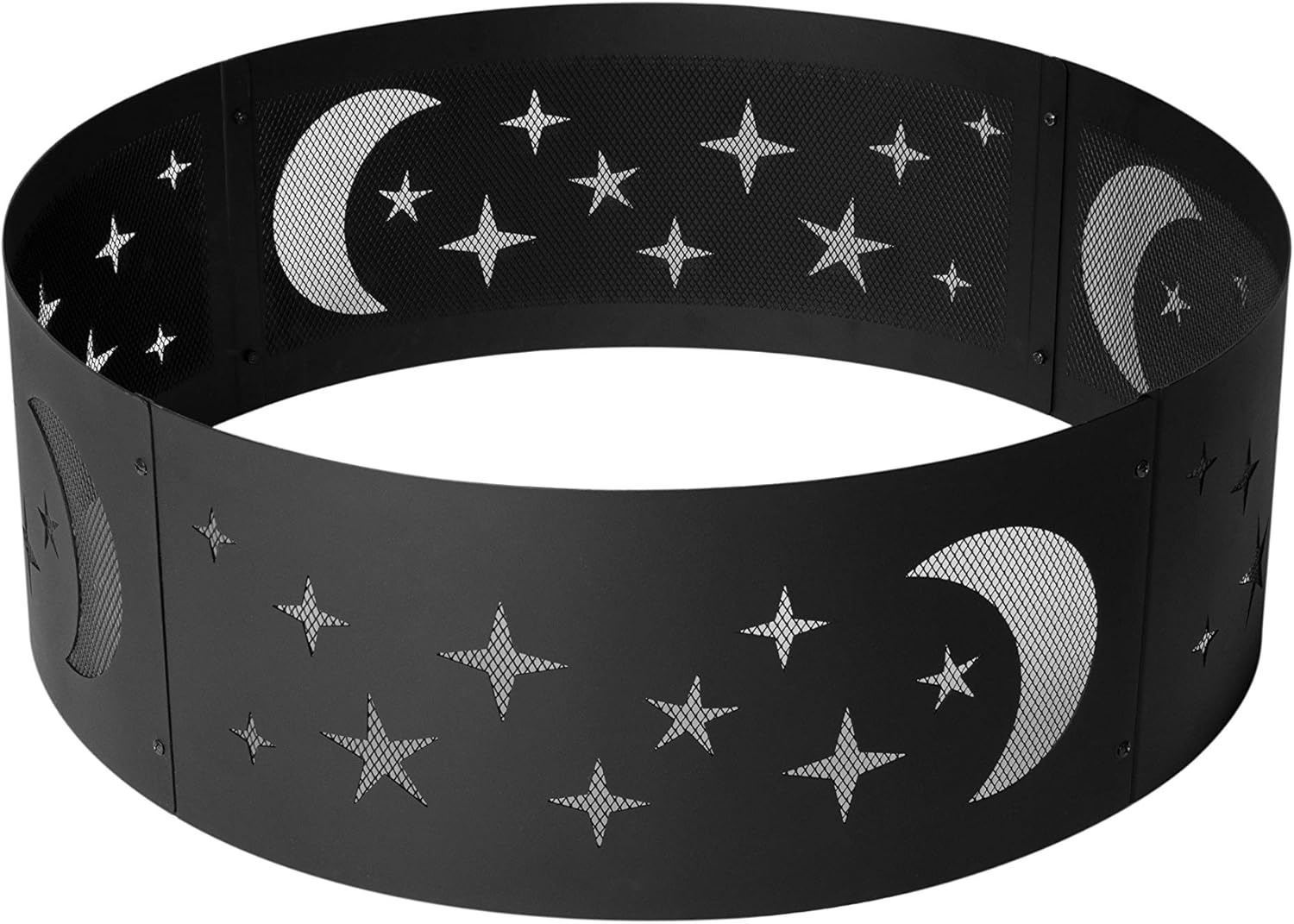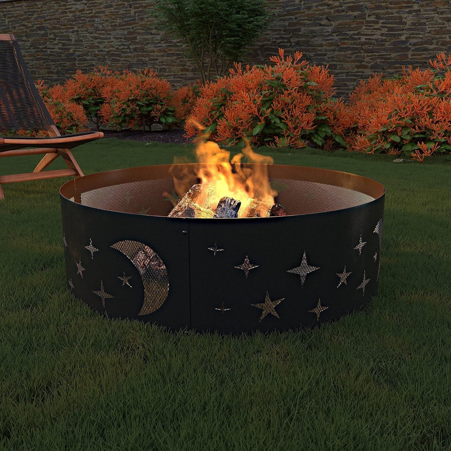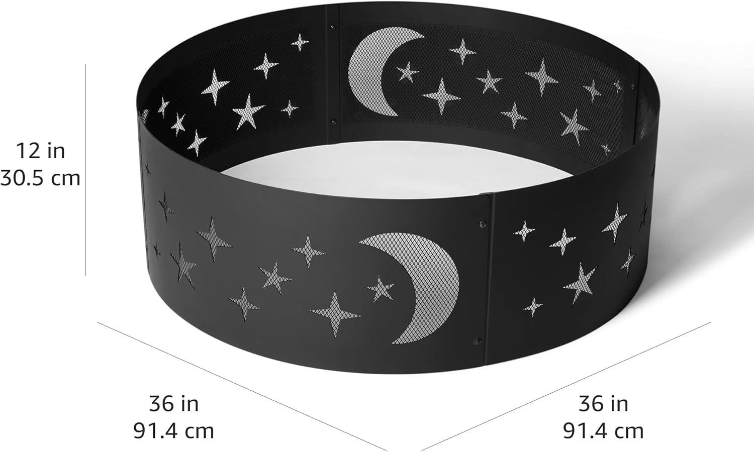 Amazon Basics Outdoor Round Steel Fire Ring - 36-Inch, Star and Moon Design, Black - B08RZRXTCL - New, Retail Price USD $65/pc, Total Lot Retail Value USD $2,340. Product link: https://www.amazon.com/dp/B08RZRXTCL?tag=camelweb-20&linkCode=ogi&th=1&psc=1&language=en_US