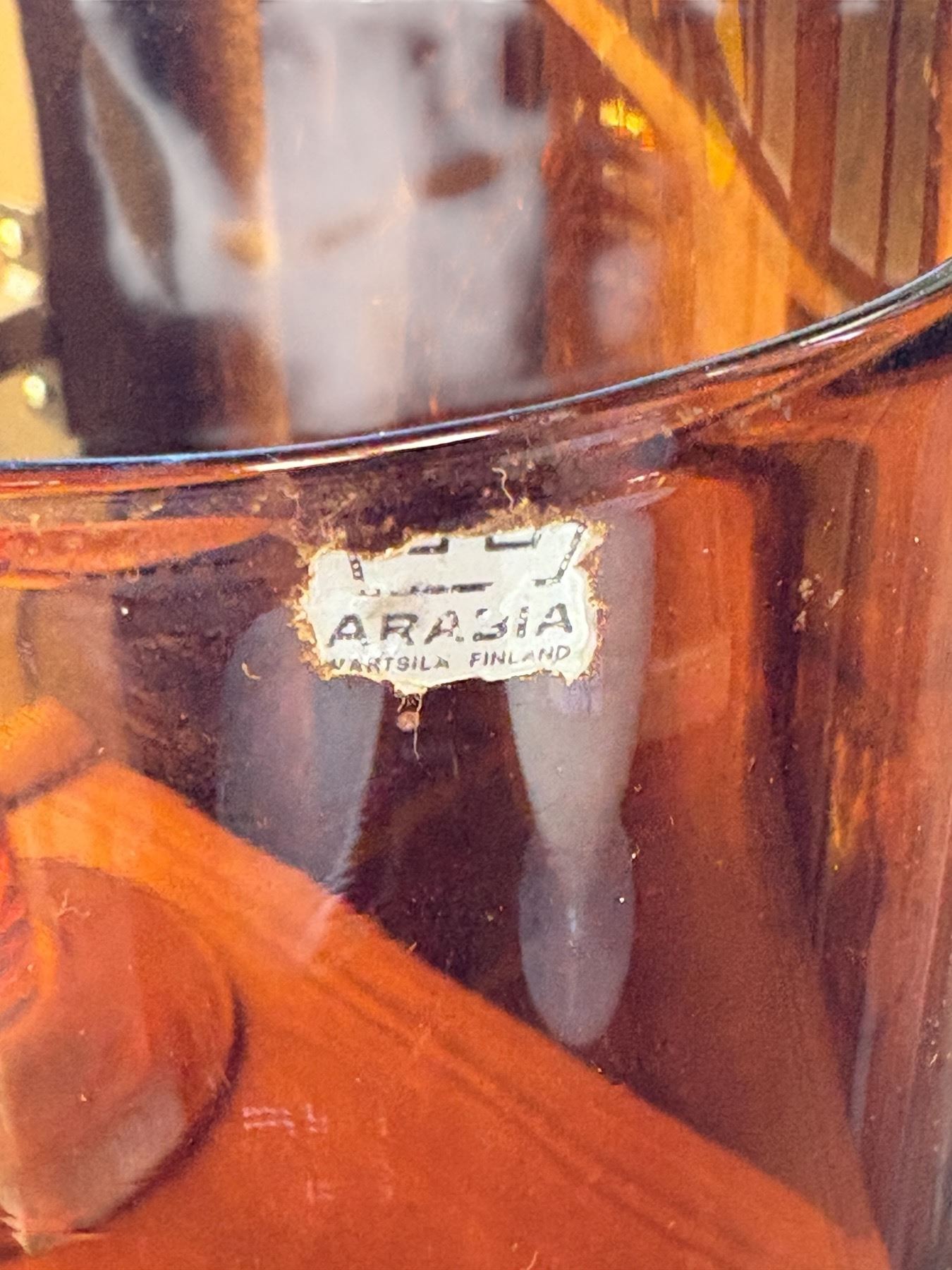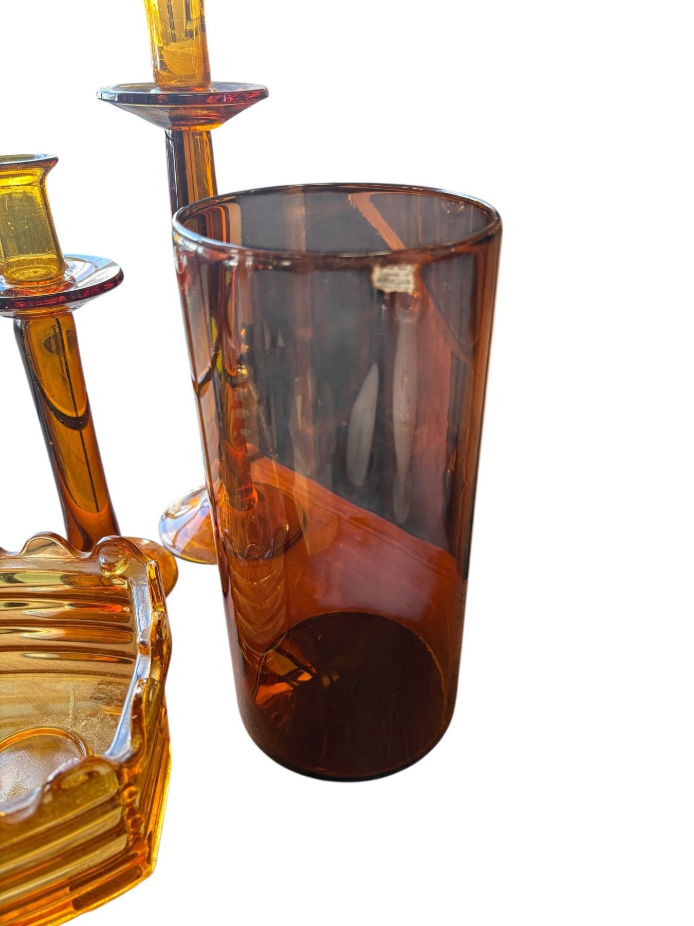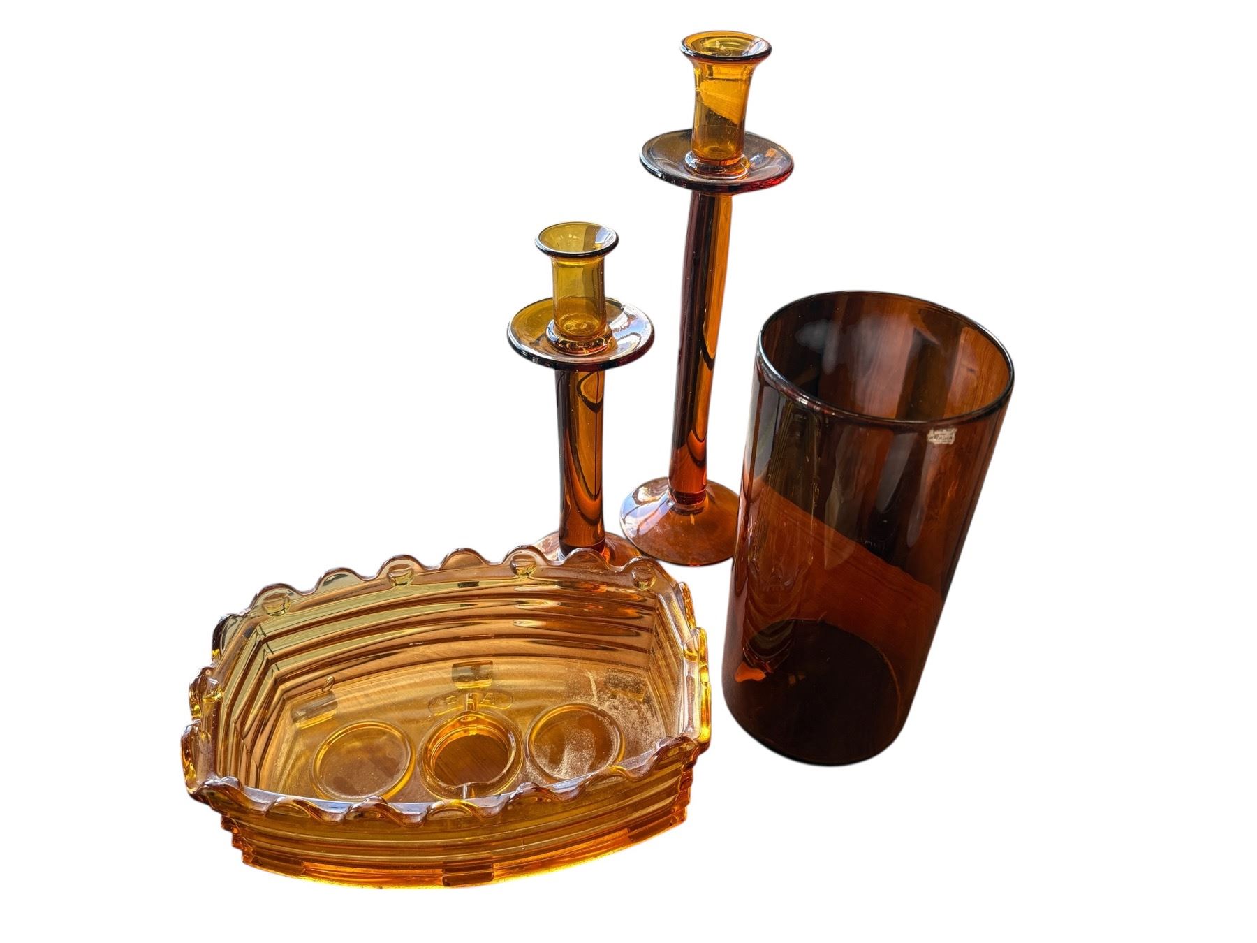 Amber art glass collection includes Empoli candlestick holders tallest measuring 13 inches, vintage cylindrical vase, and an Rfa Bruxelles plate warmer. This vintage set showcases a variety of functional and decorative pieces. Items are as pictured.