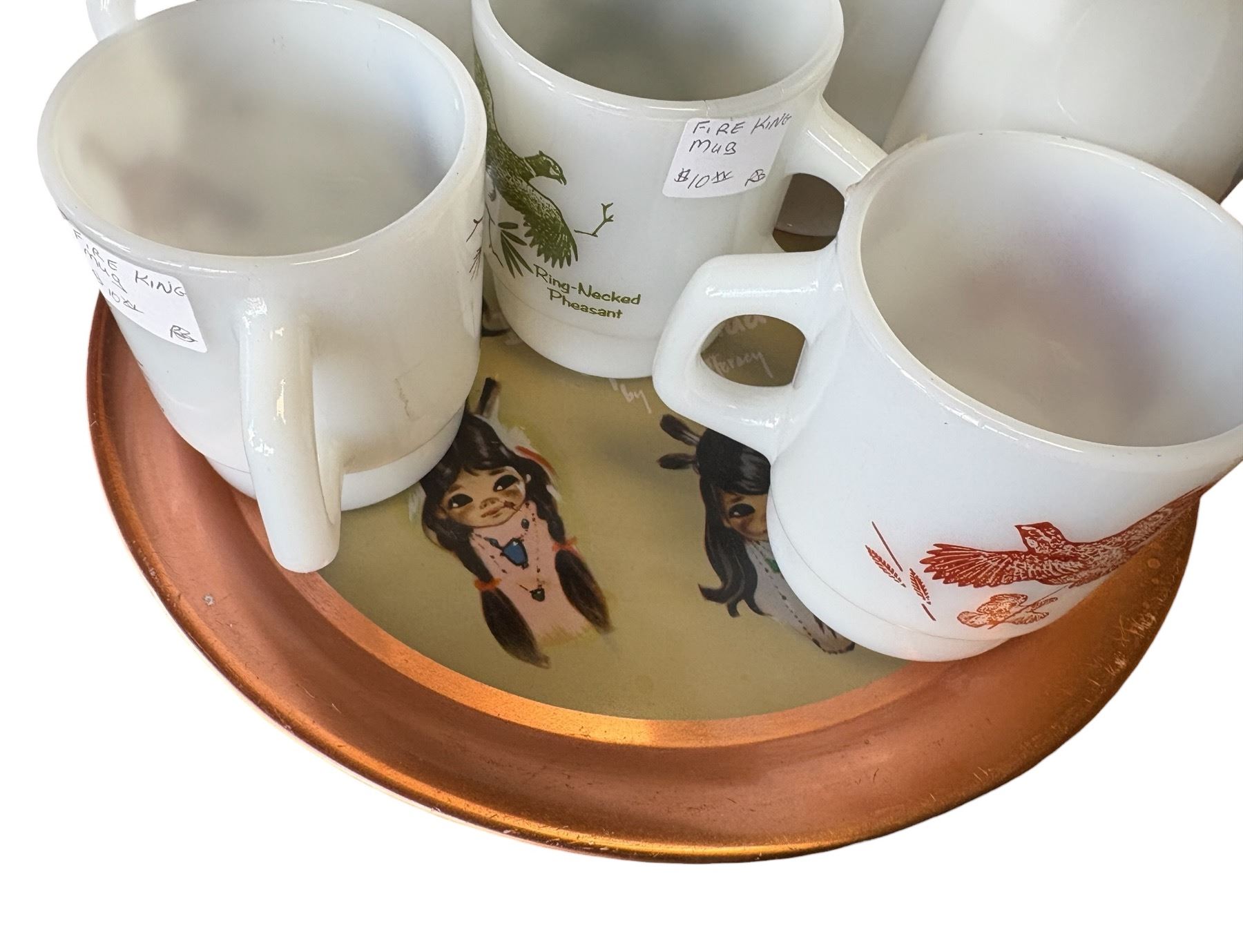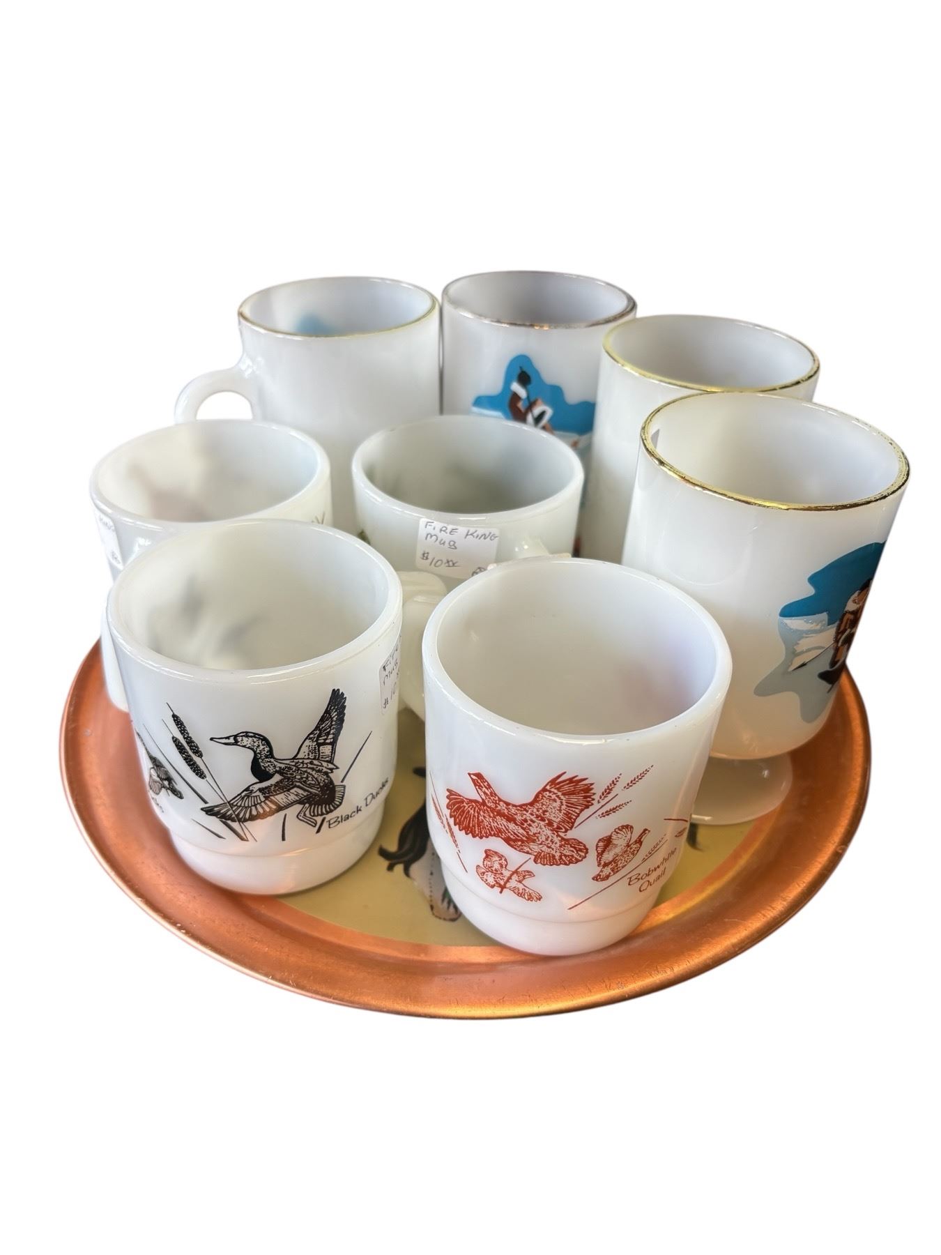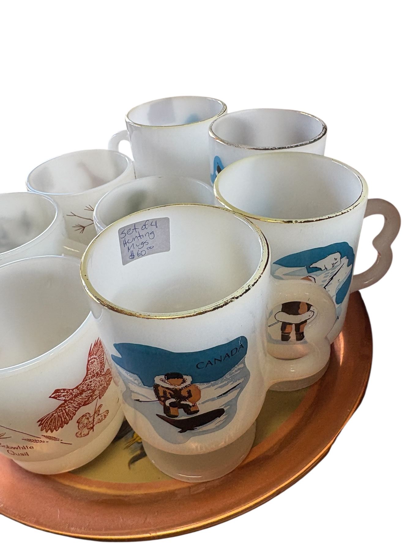 Set includes Anchor Hocking Fire King milk glass mugs featuring game birds, and Glasbake milk glass mugs with Canadian Arctic scene designs. All items are displayed on a 'The Indian Children of Canada' tray. Milk glass construction throughout. Items as pictured.