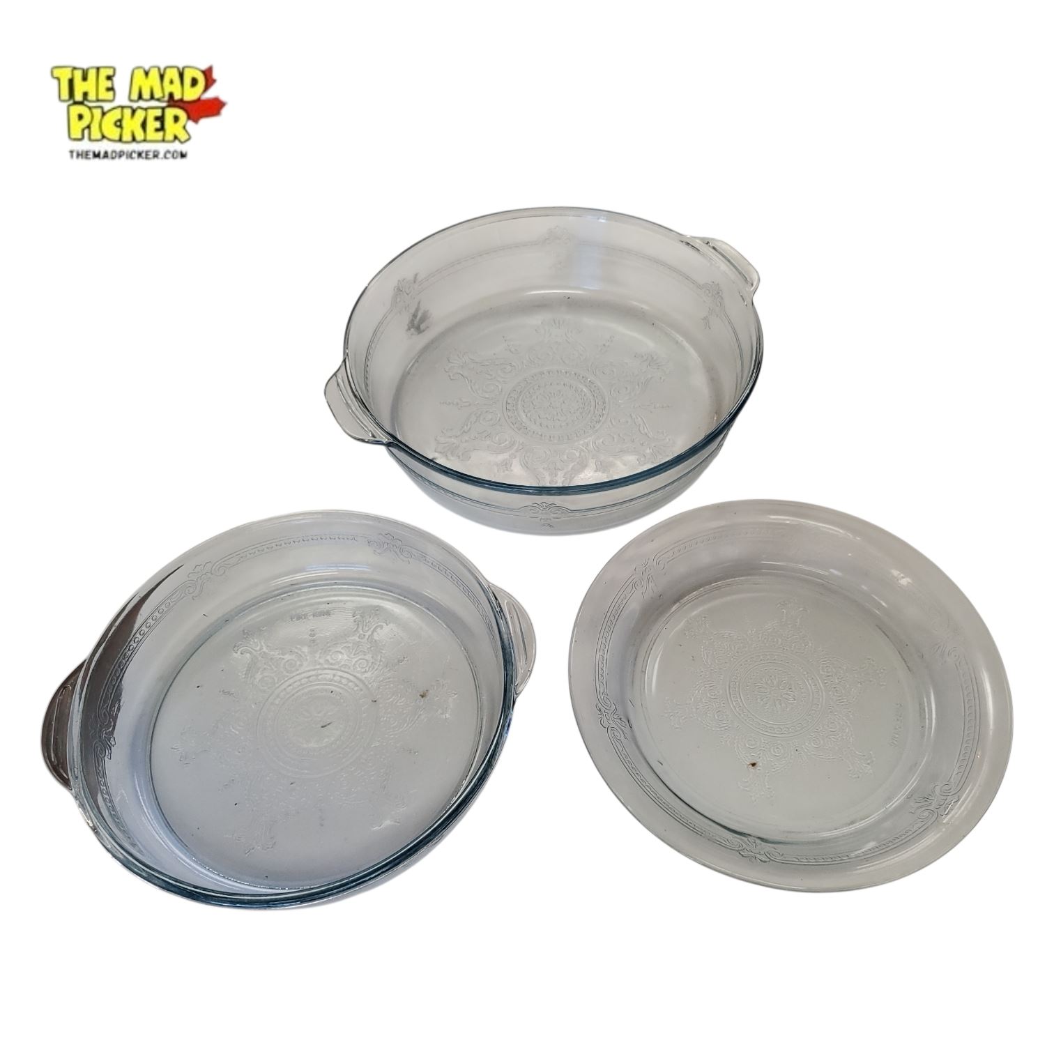 Vintage Anchor Hocking Fire-King ovenware dishes in Sapphire Blue with the Philbe pattern. Produced from 1941-1956, these depression glass pieces feature an etched Philbe design. Made of ovenproof glass, designed for baking and serving. Highly regarded example of mid-20th century American glassware.