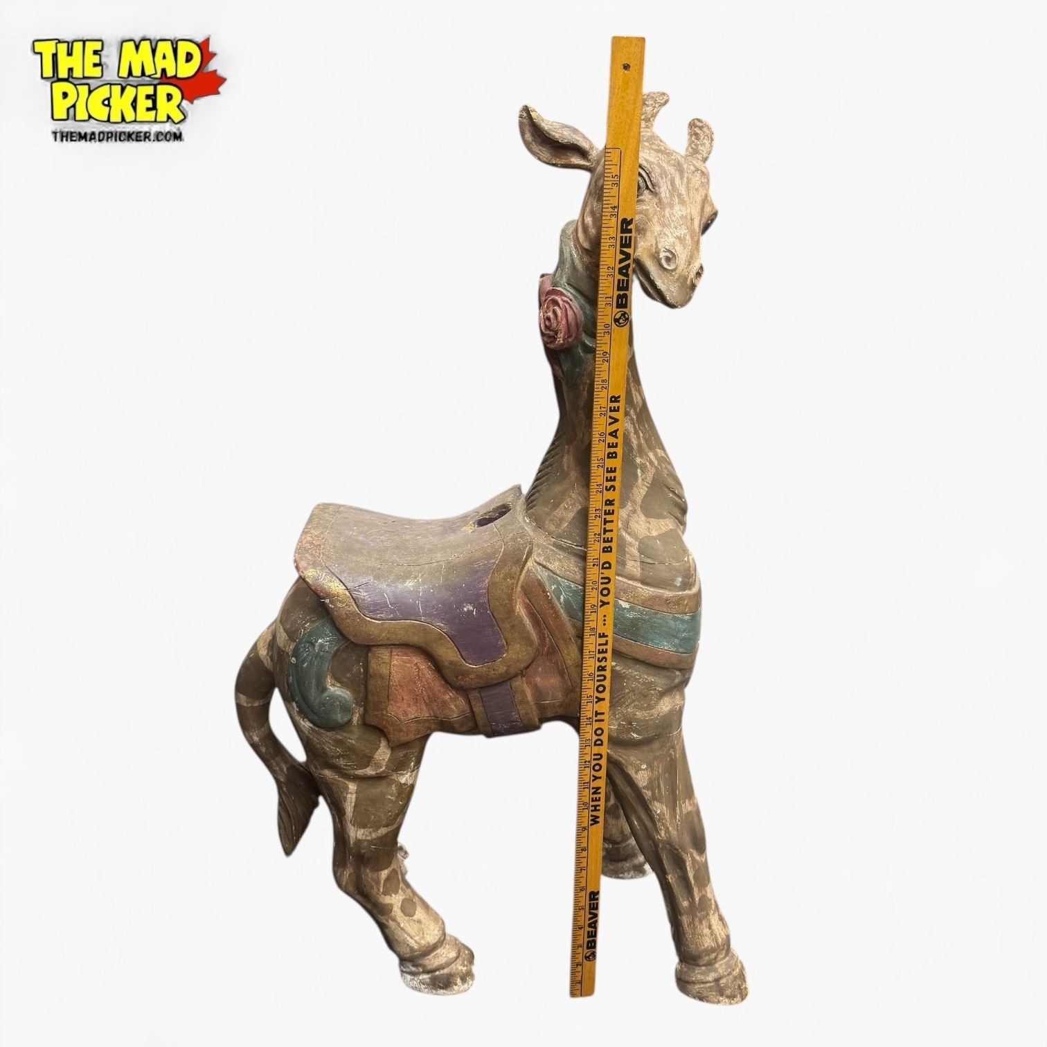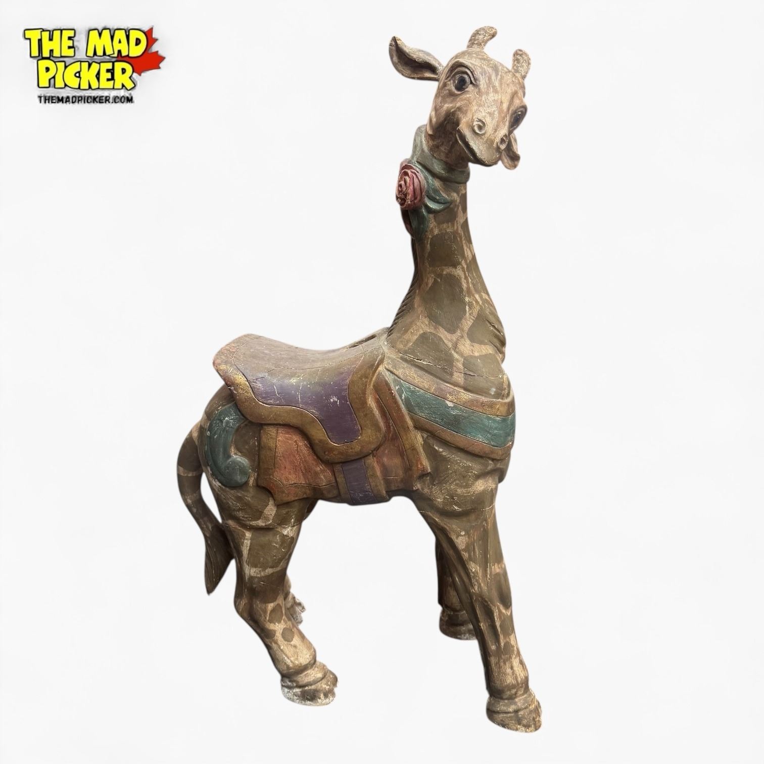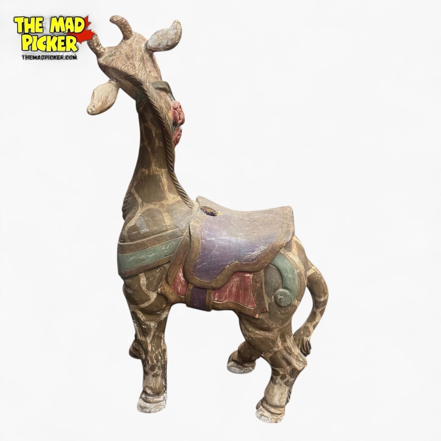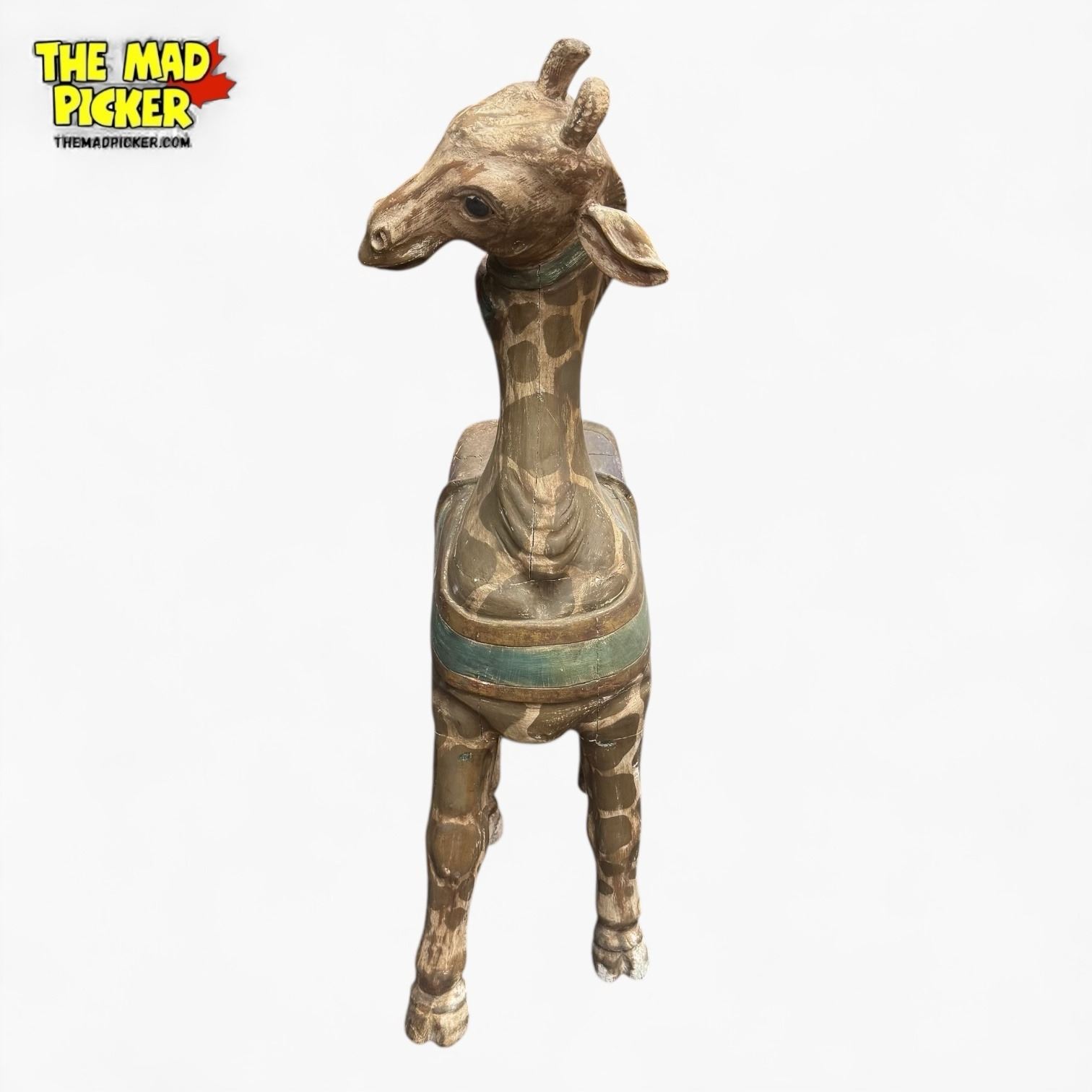 Antique American wood-carved carousel giraffe, approximately 38" tall. Similar style to early 20th-century carvers like Charles Looff or G.A. Dentzel. Features traditional polychrome painted and lacquered details, inset glass eyes, and carved saddle. Giraffes often adorned the elaborately decorated outer rows of carousels.