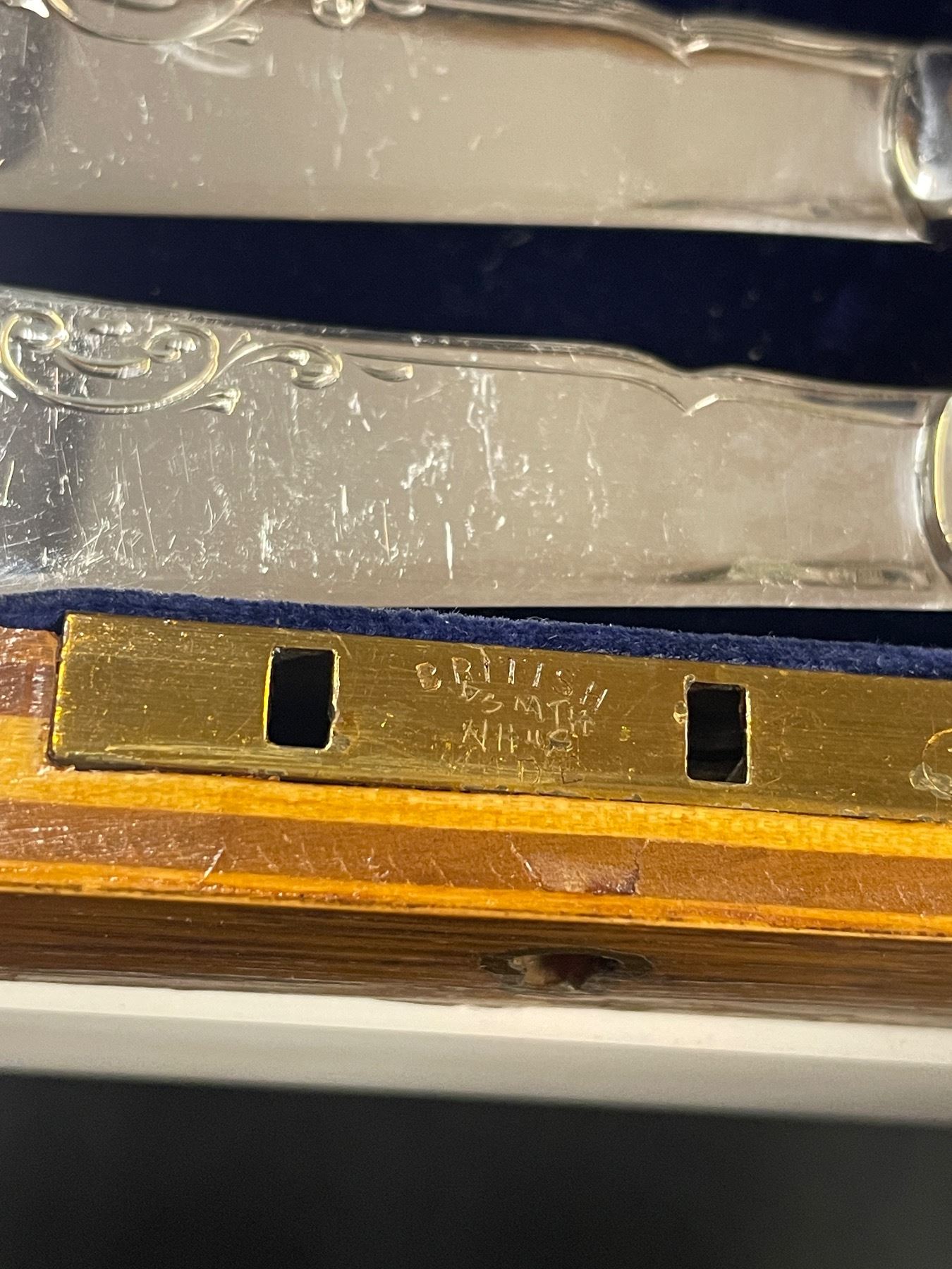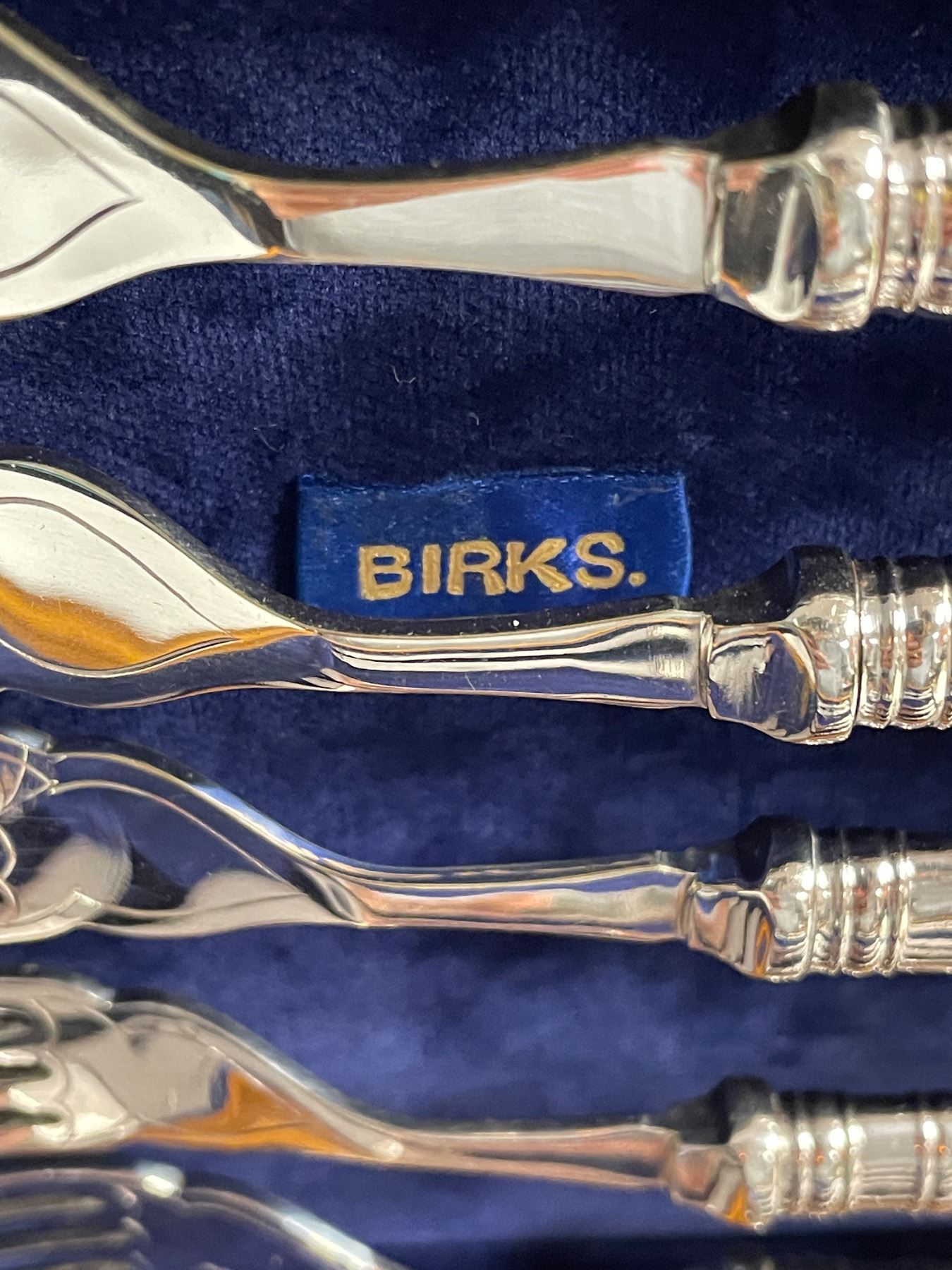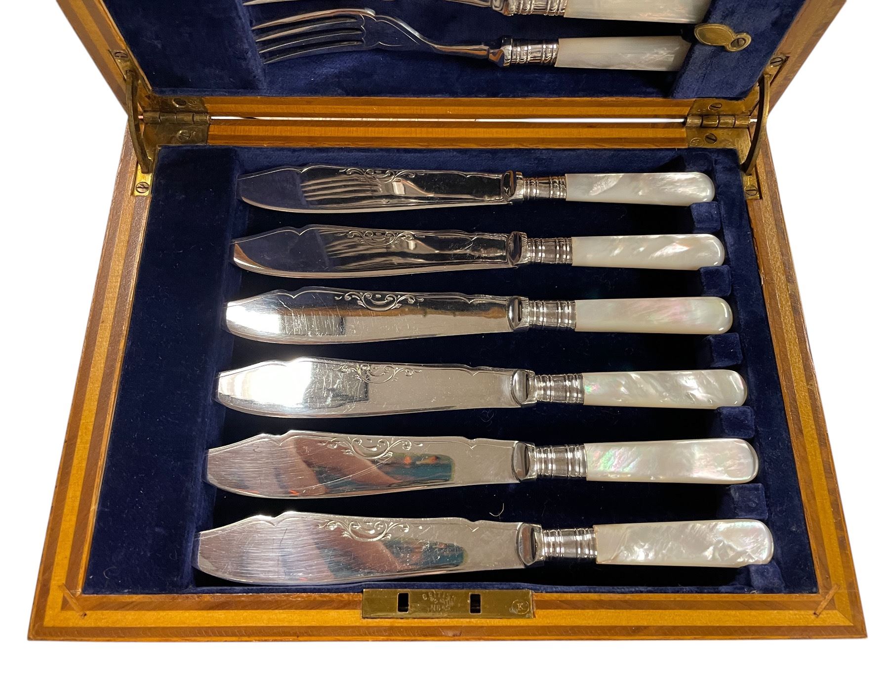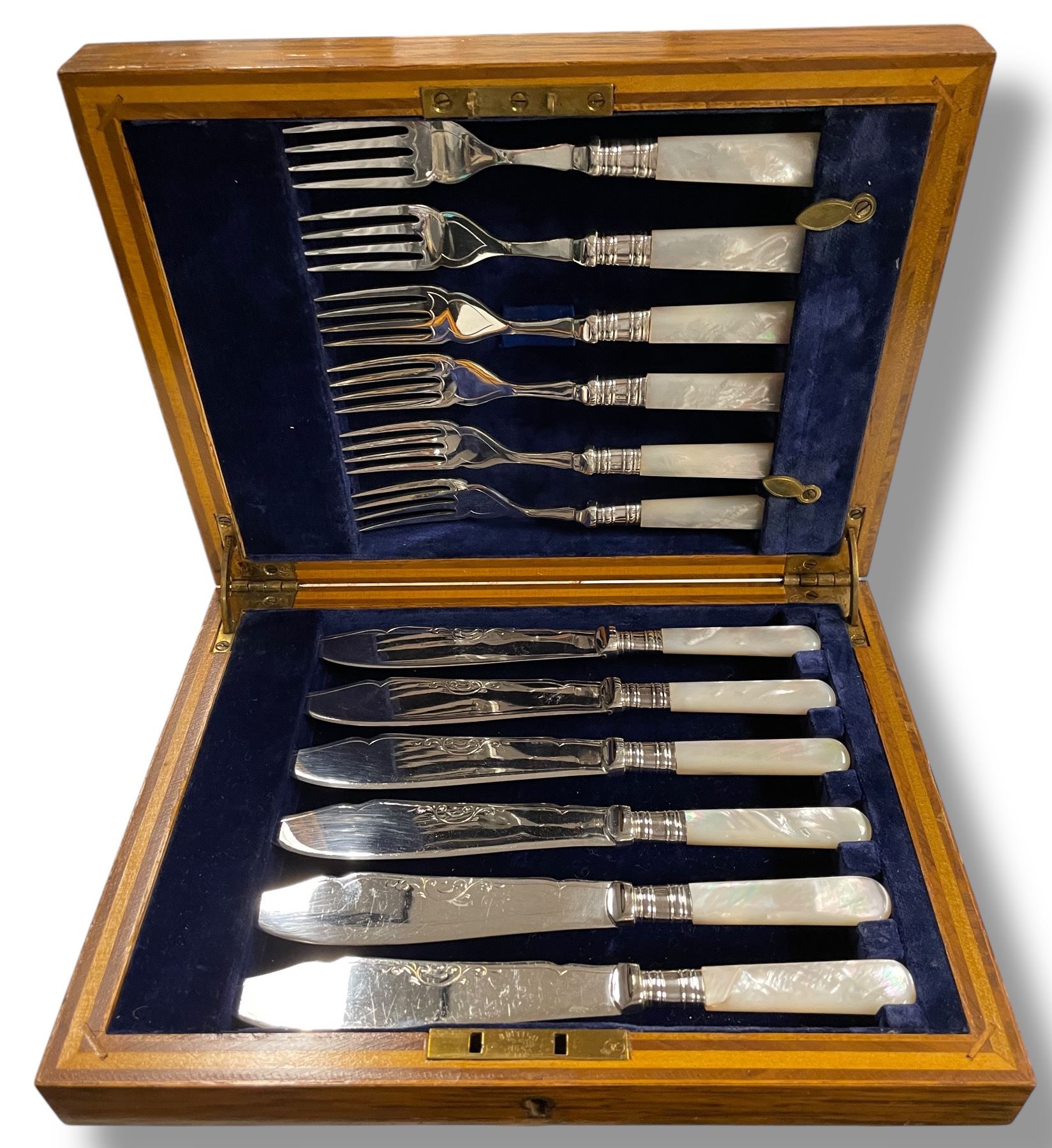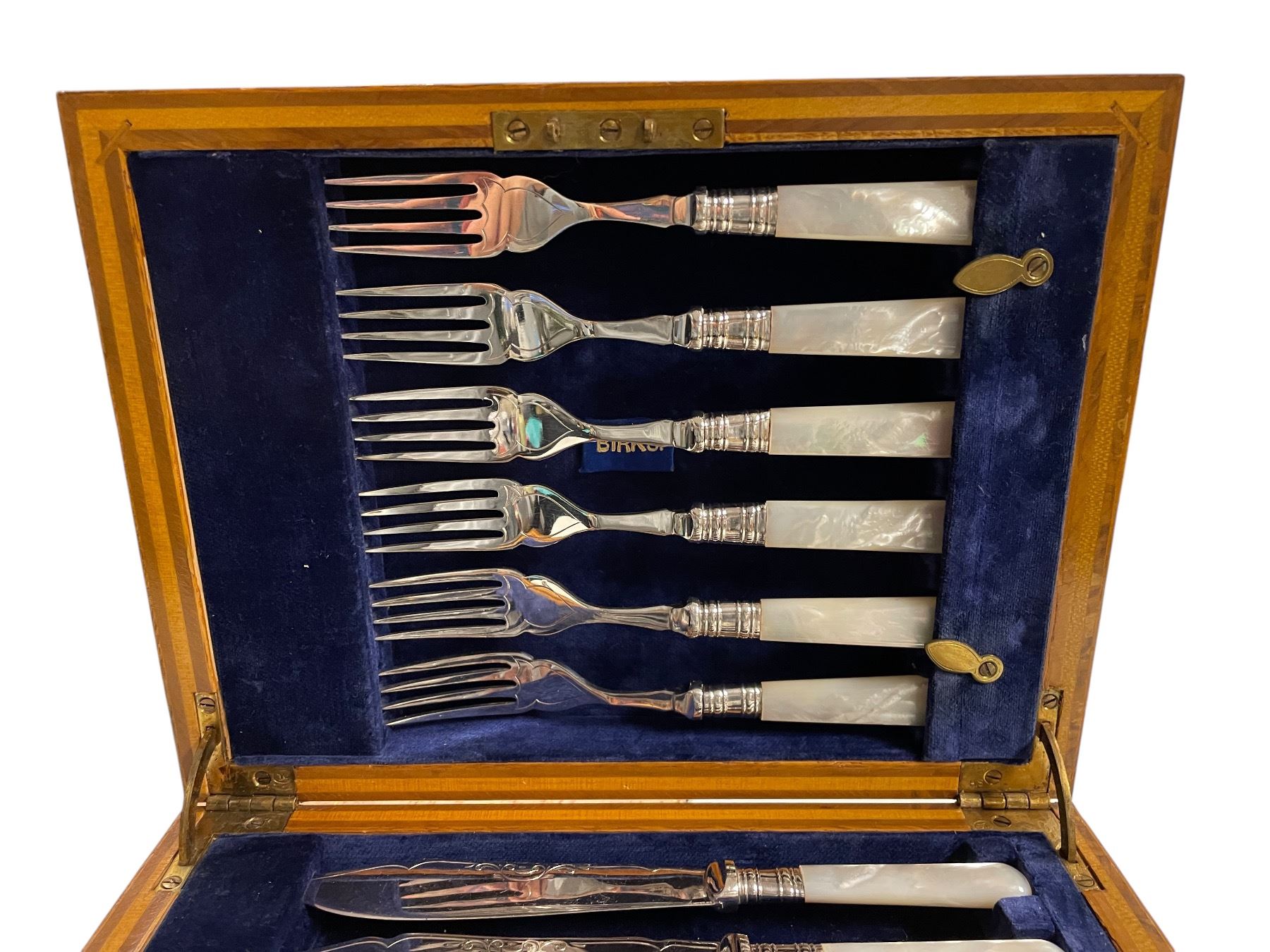 Antique Birks Fish Knives and Forks Set - Pearloid Handles with Silver Plated Blades - 6 Place setting in fitted wood case
