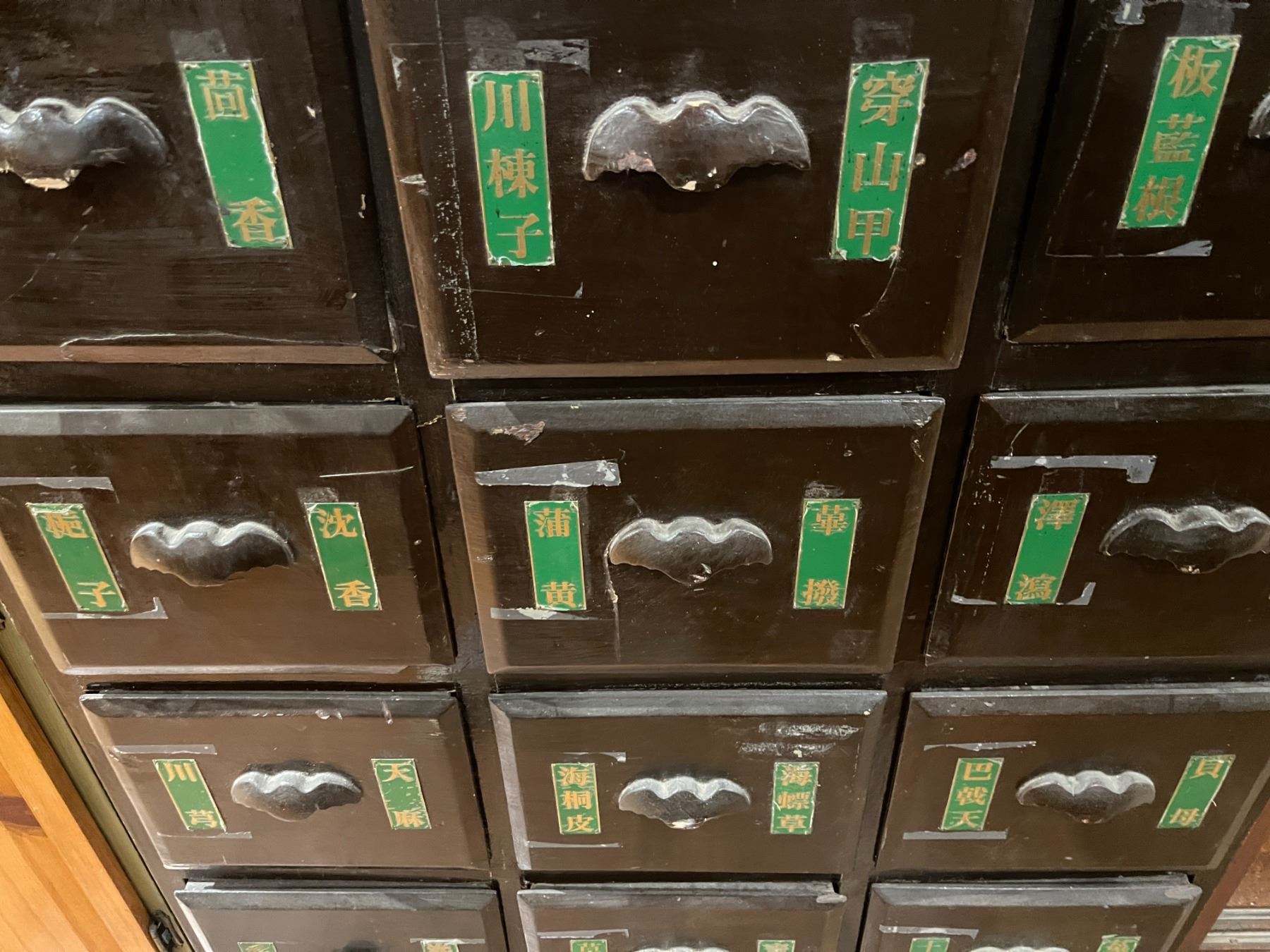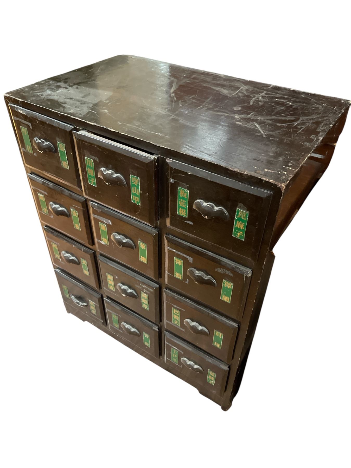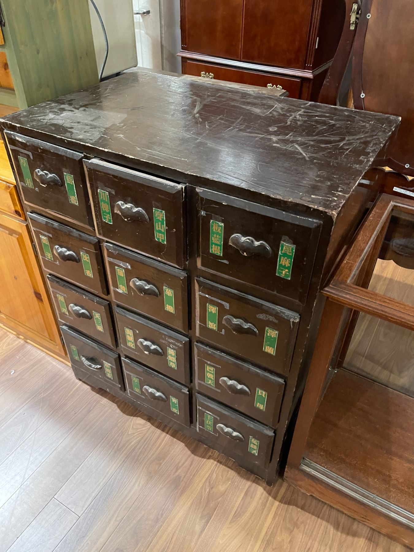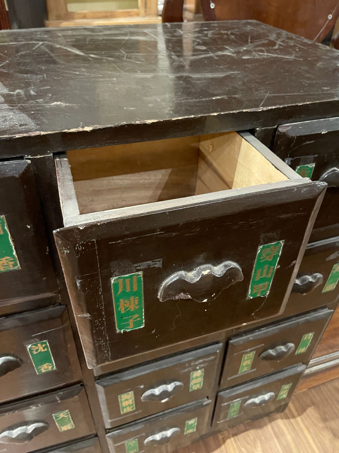 Antique Chinese cabinet designed as a medicine chest. Measures 34-Inch in length, 23-Inch in width, and 41.5-Inch in height. Features traditional craftsmanship and storage compartments. Item is as pictured.