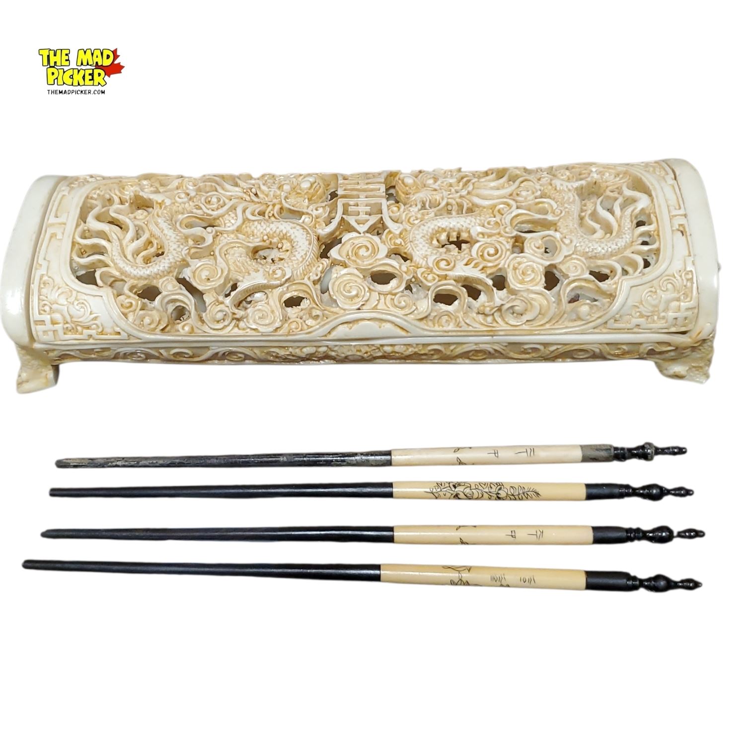 Antique Chinese Carved Box with Village Scenes and 4 Brush Pens Qing Dynasty Era