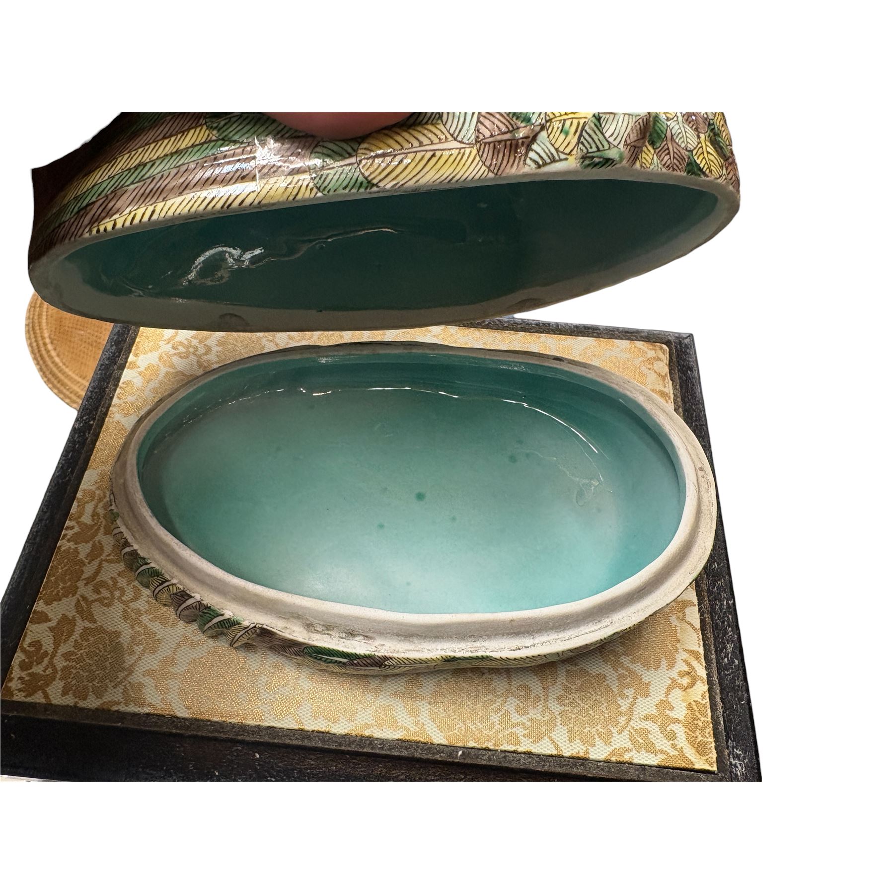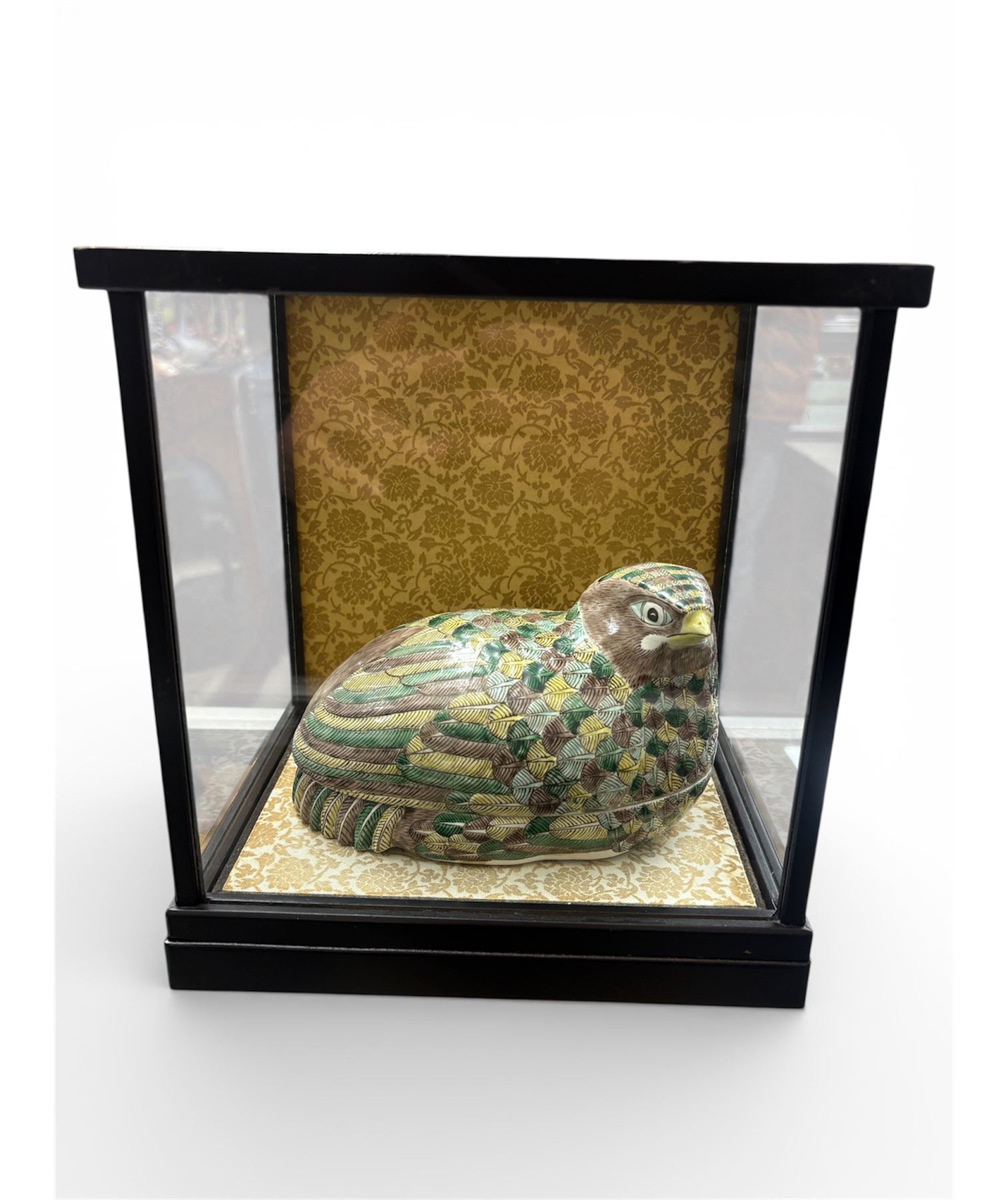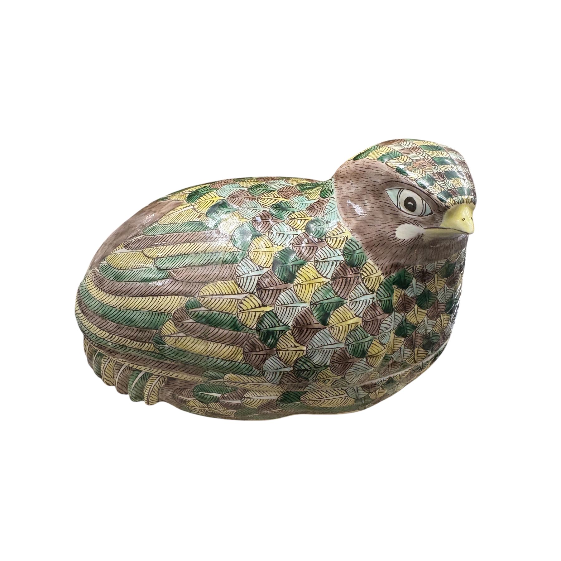 Antique Chinese Famille Verte porcelain nesting quail box from the late Qing Dynasty, late 19th century. Features hand-painted enamel details with a possible turquoise interior. Crafted as a decorative piece. Box measures 9x7x9.5 inches. Known for intricate artistry typical of the Famille Verte style.