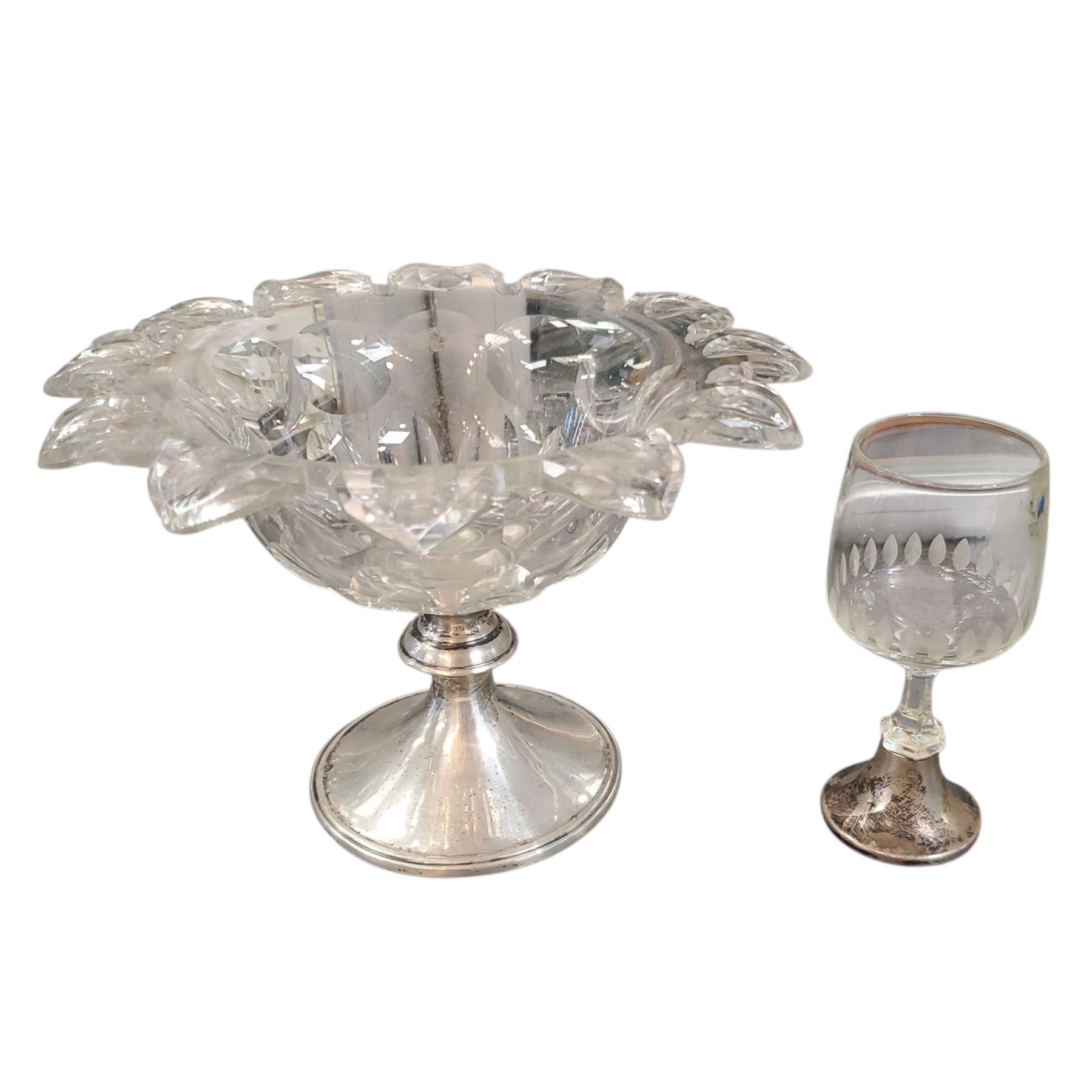Antique Crystal Compote Dish with Weighted Silver Base & Sherry Glass with Silver Plated Base *Cover is missing from the base * 5" tall x 7" diameter