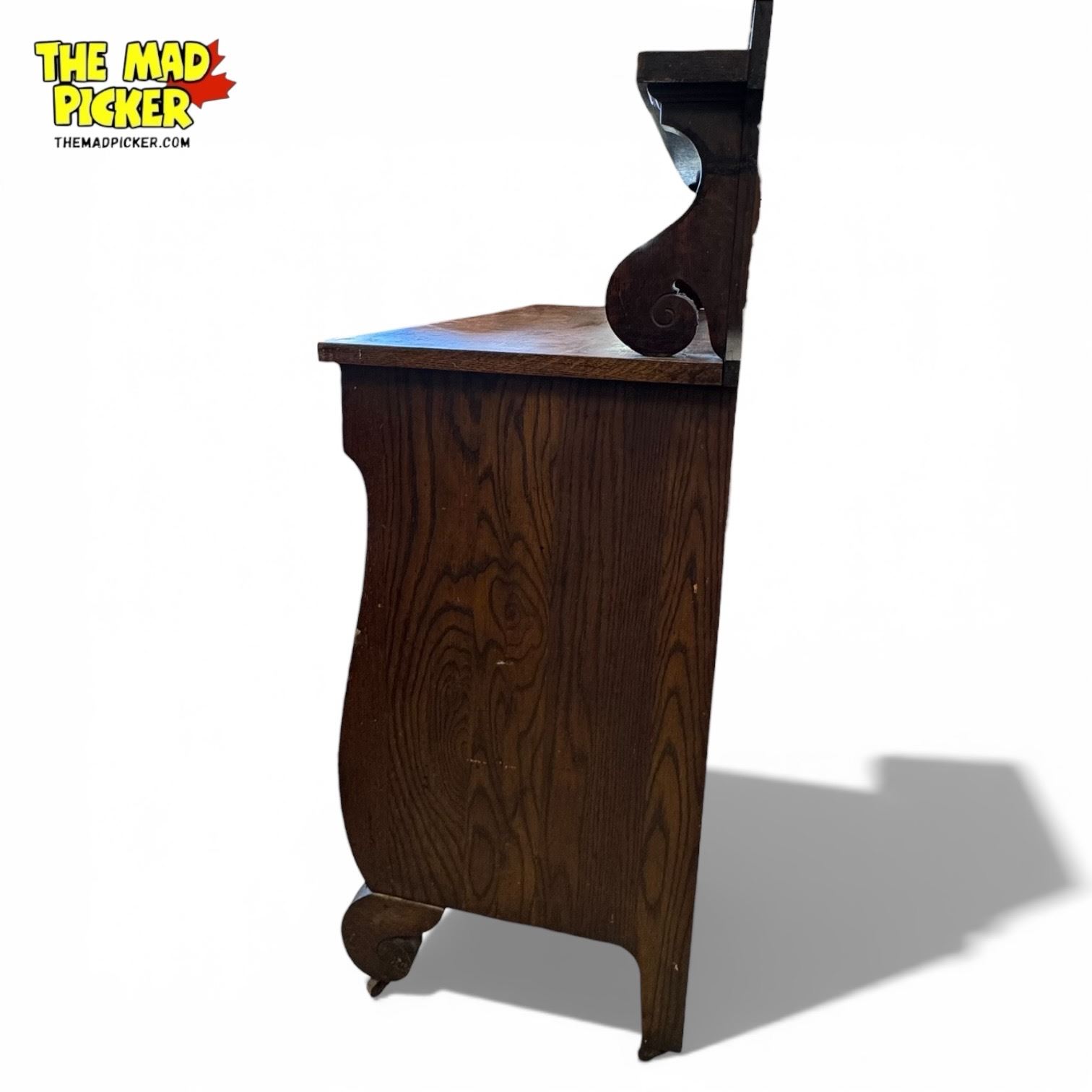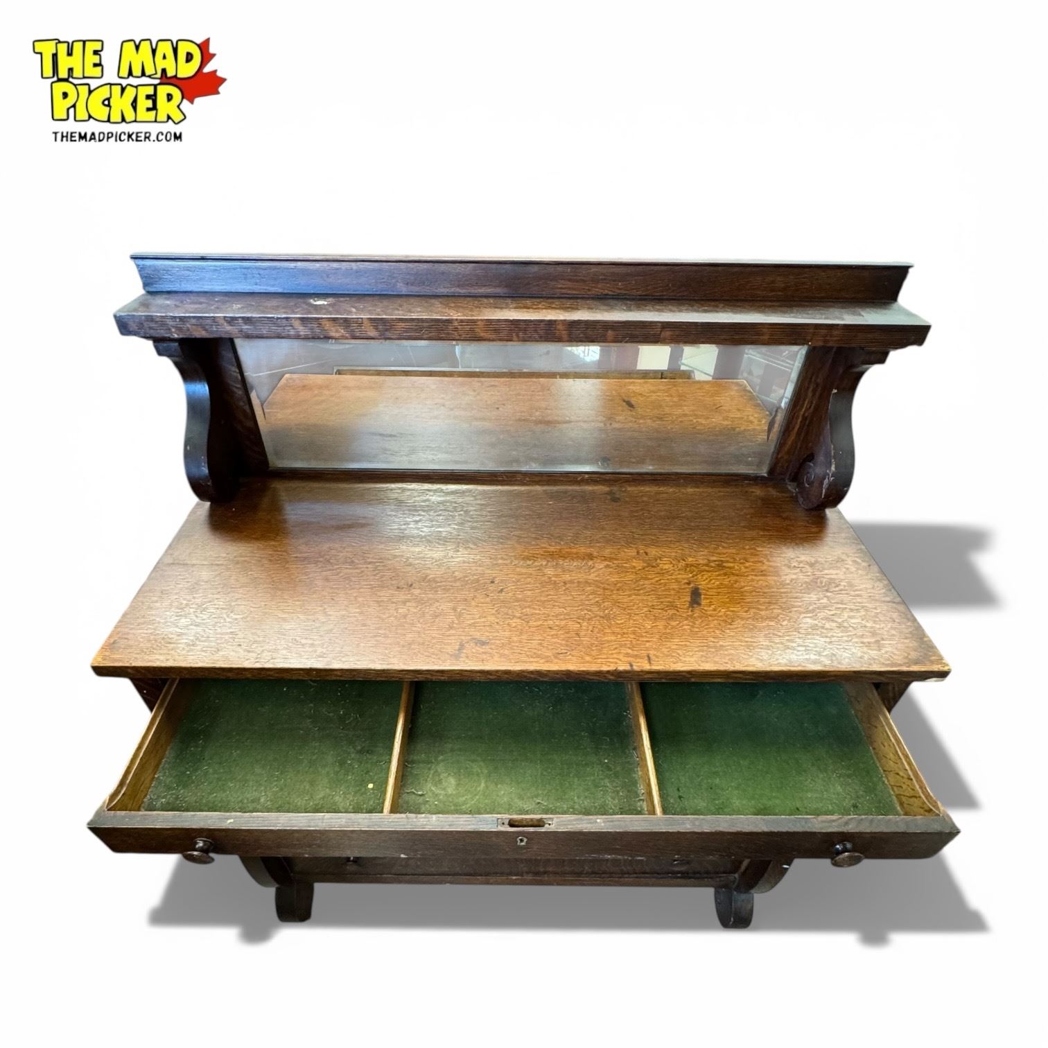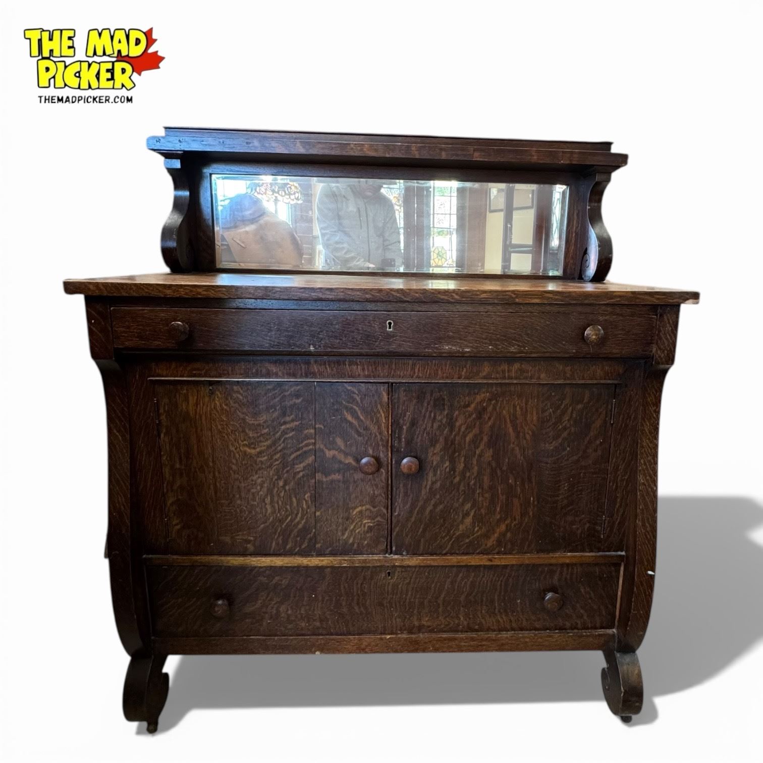 Antique Empire-style sideboard buffet crafted from tiger oak with quarter-sawn veneer. Features a mirror and ornate detailing typical of the style. Measures 46x20x54 inches. Missing back cover, consistent with age and use. A classic piece of early 20th-century furniture design.