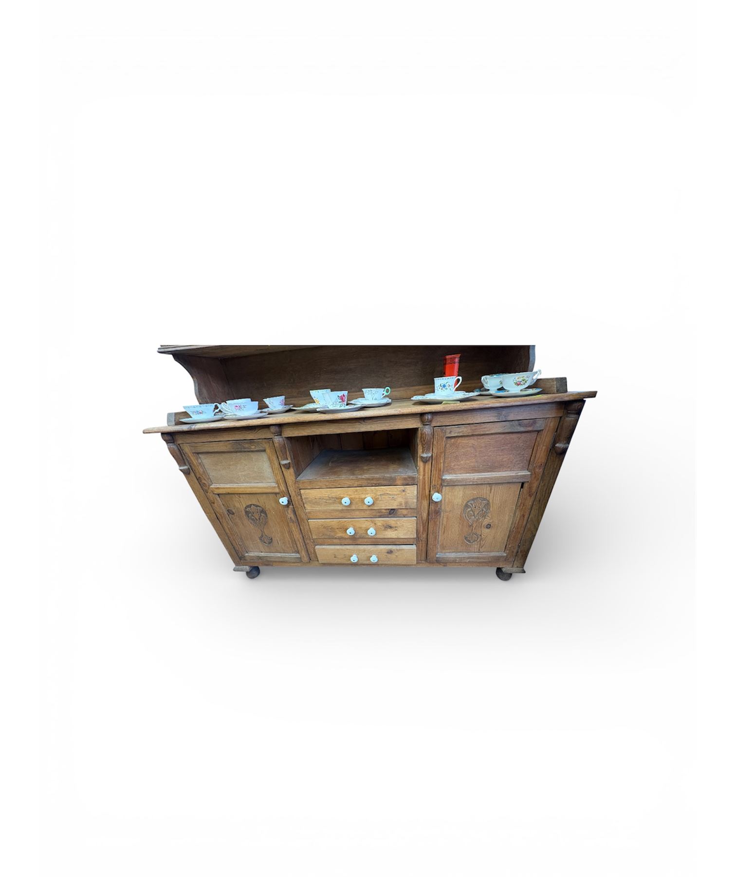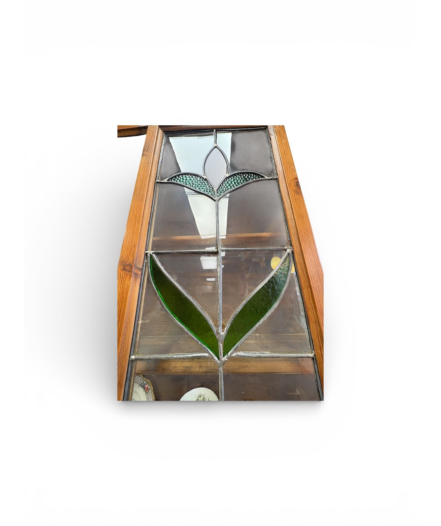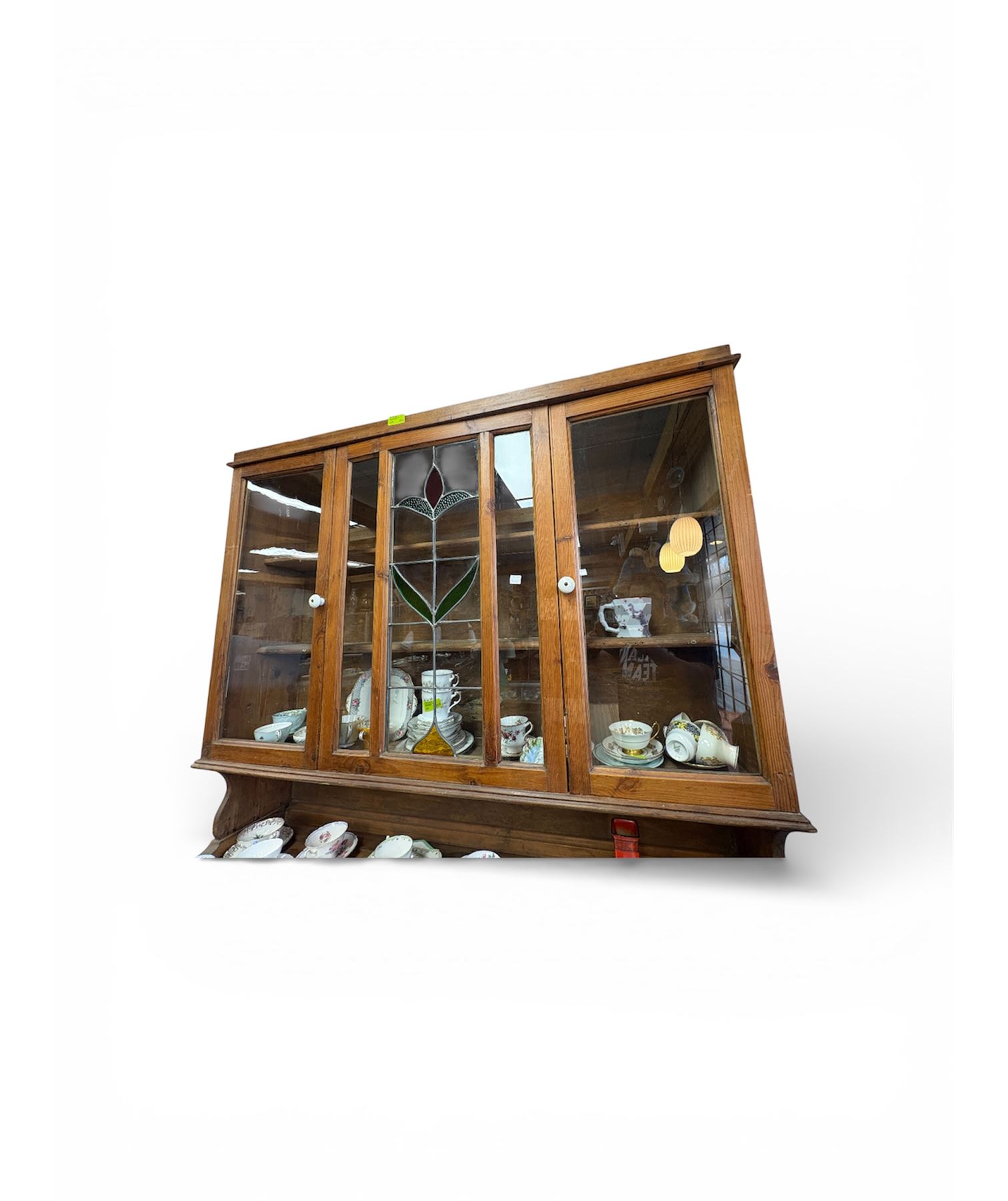 Antique English kitchen dresser measuring 60 inches wide, 16 inches deep, and 8 inches tall. This two-piece wooden unit features stained glass accents on the upper section. Ideal for storage or kitchen display, its craftsmanship reflects an era of traditional English furniture design.